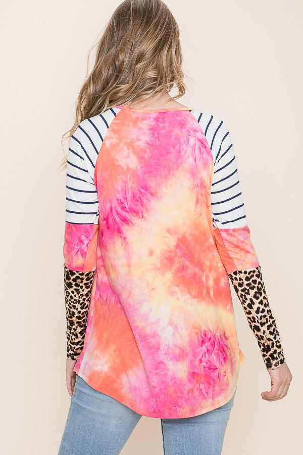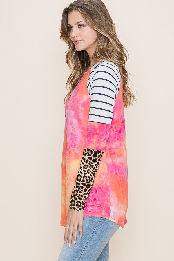 PLUS MAGENTA/ORANGE ANIMAL CONTRAST LONG SLEEVE TIEDYE TOP