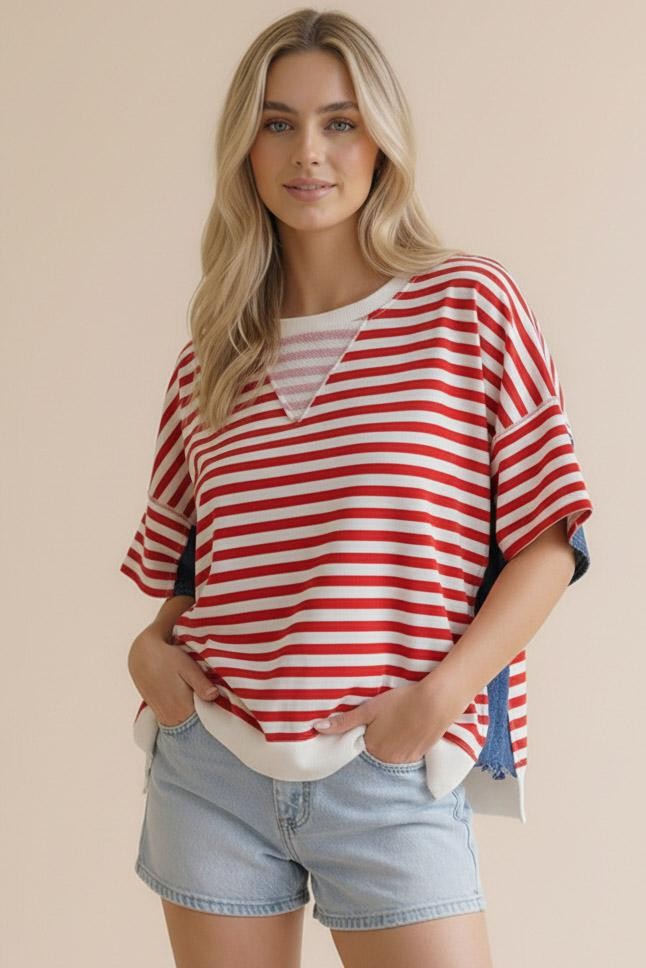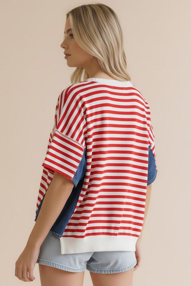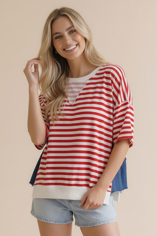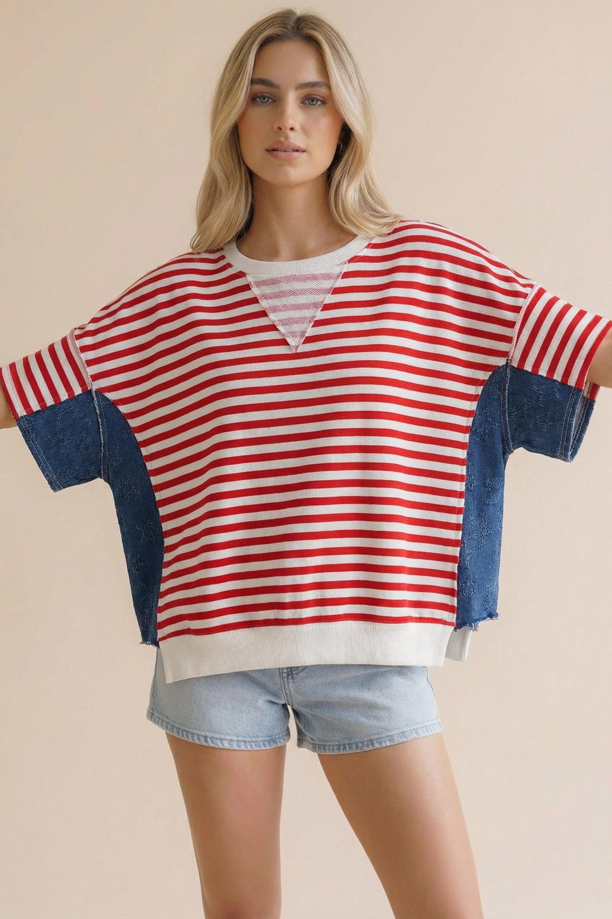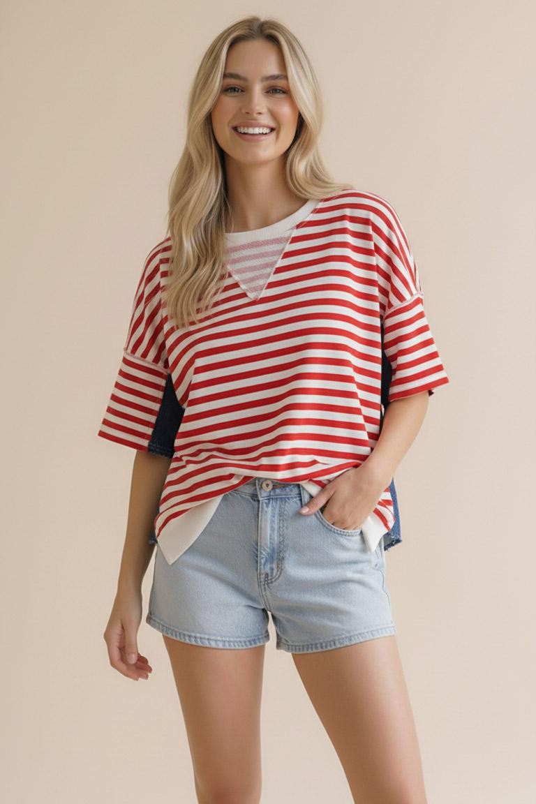 ROUND NECK TRI ANGLE DETAIL DROP SHOULDER OVERSIZED LOOSE FIT SHORT SLEEVE STAR JACQUARD DENIM COLOR BLOCK STRIPE FRENCH TERRY TOP