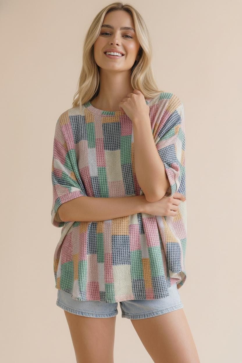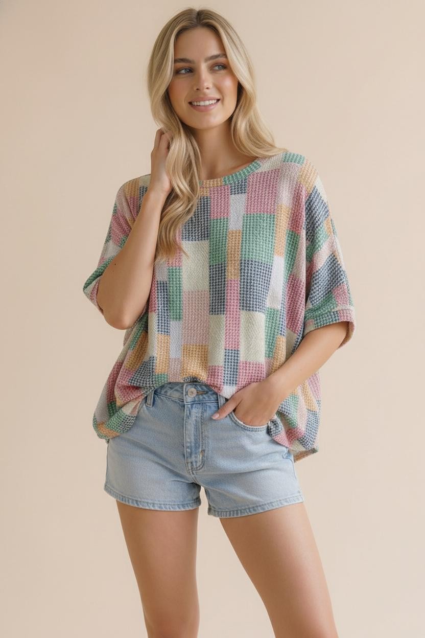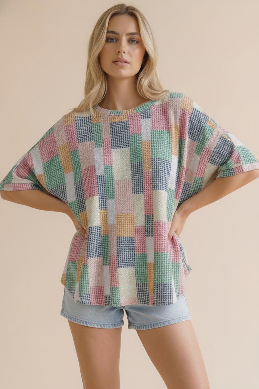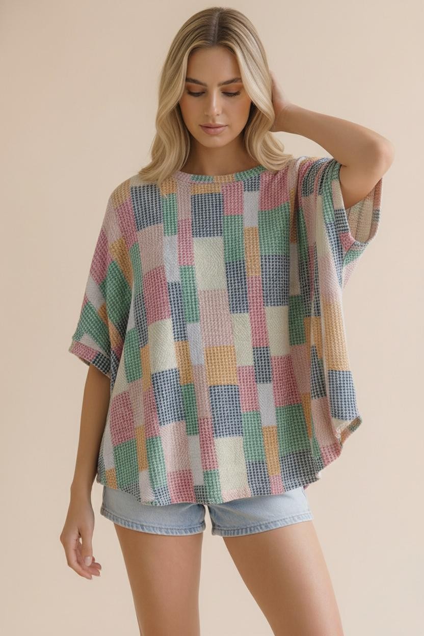 ROUND NECK DOLMAN SHORT SLEEVE LOOSE FIT OVERSIZED MULTICOLOR GEOMETRIC PATCHWORK PRINTED TEXTURED KNIT TOP