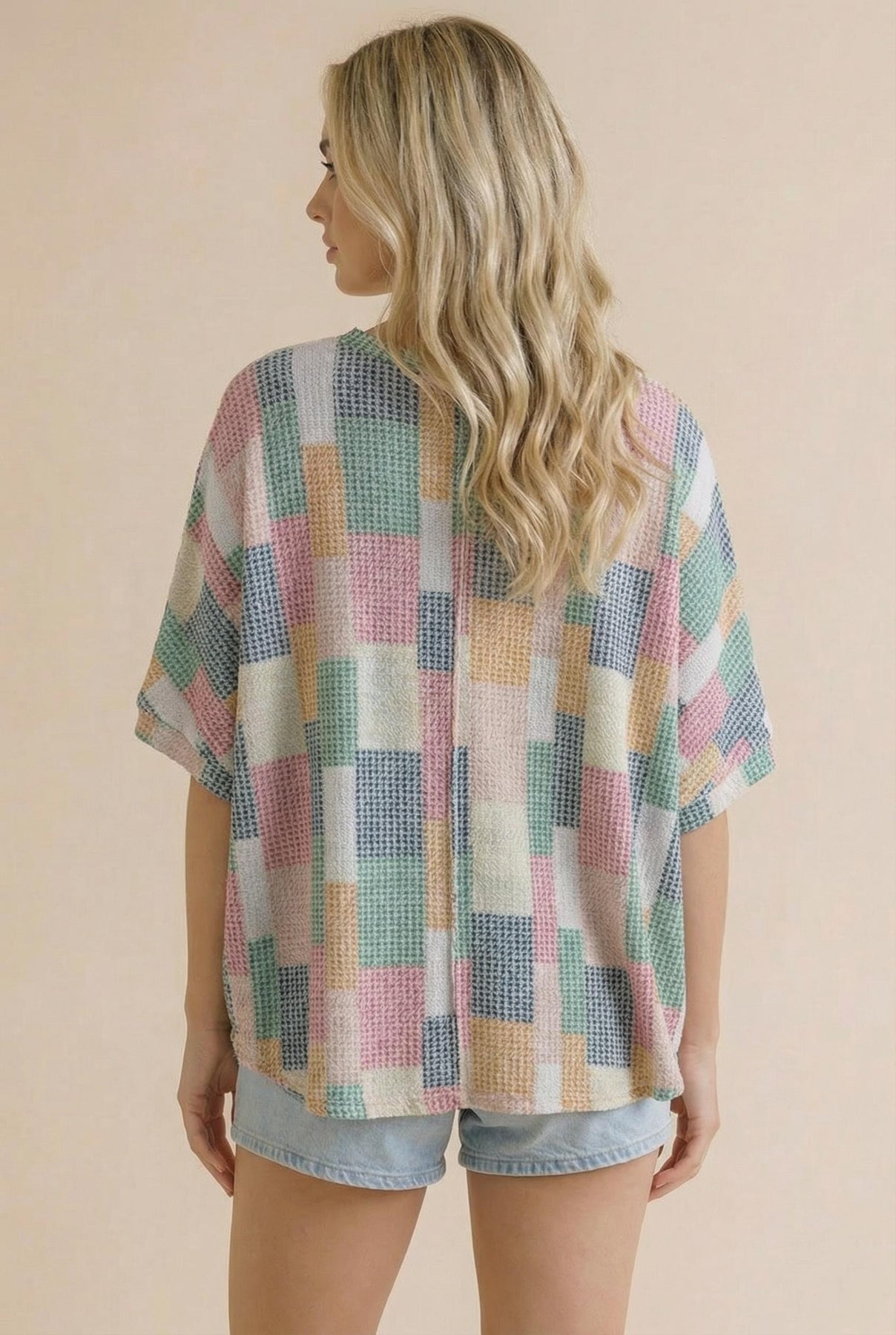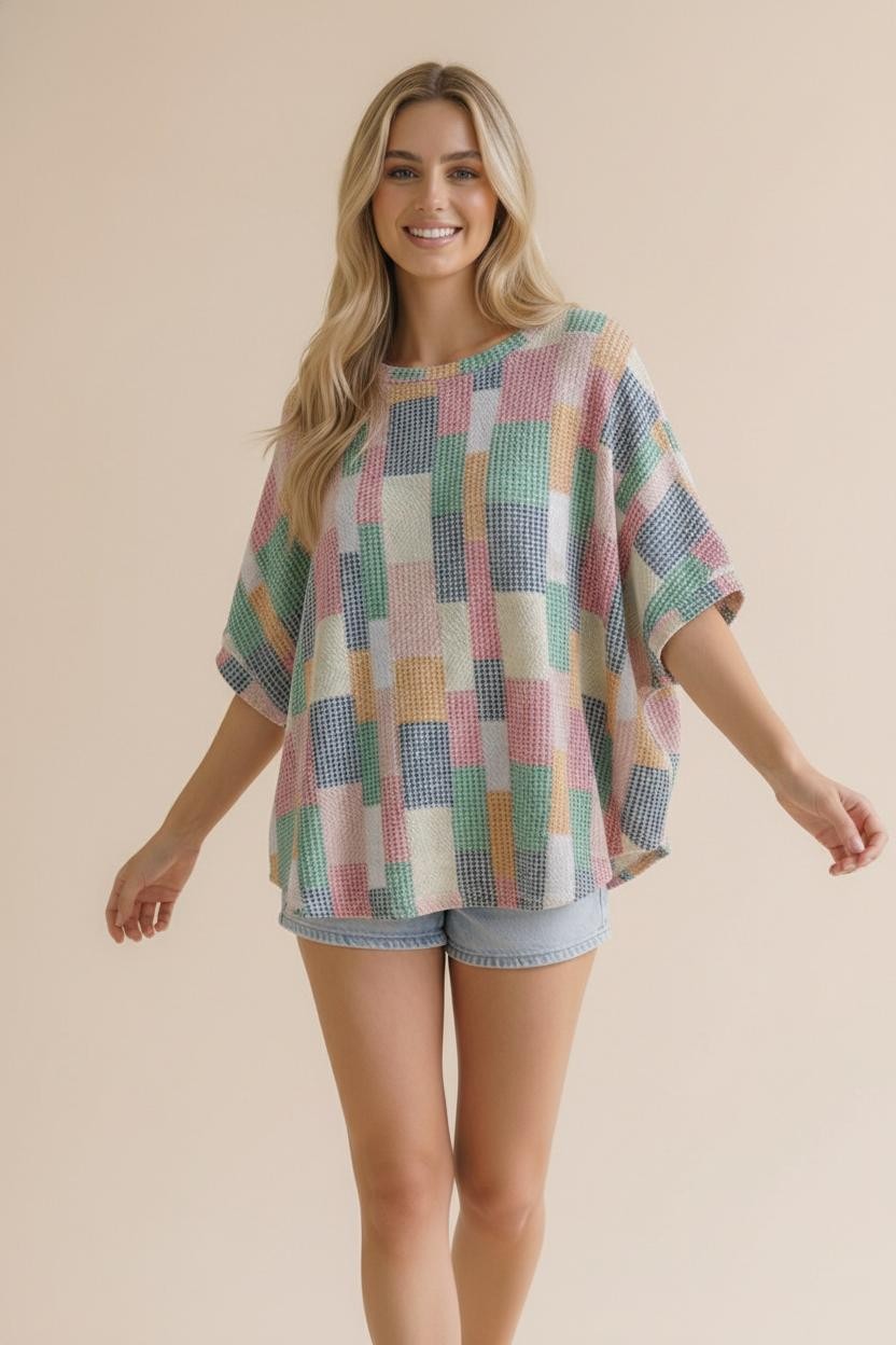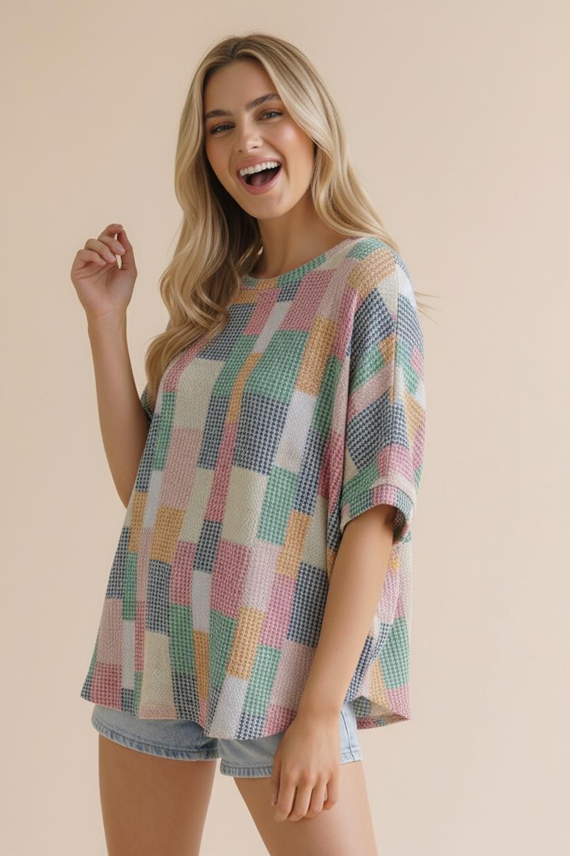ROUND NECK DOLMAN SHORT SLEEVE LOOSE FIT OVERSIZED MULTICOLOR GEOMETRIC PATCHWORK PRINTED TEXTURED KNIT TOP