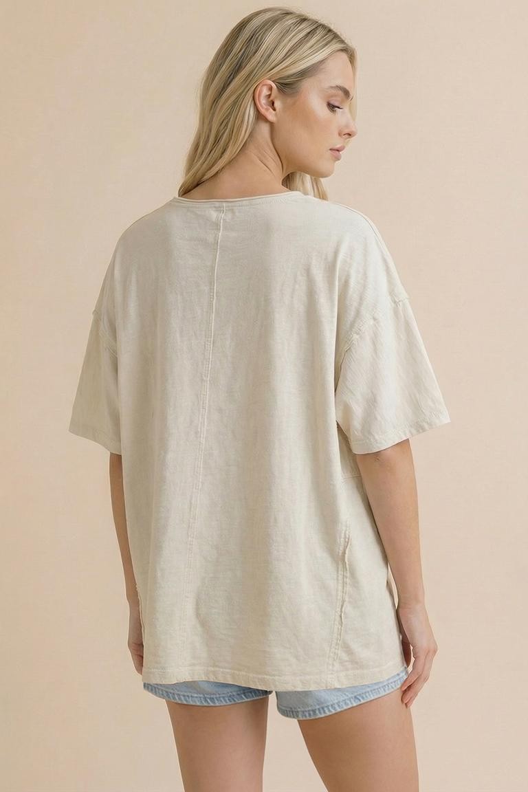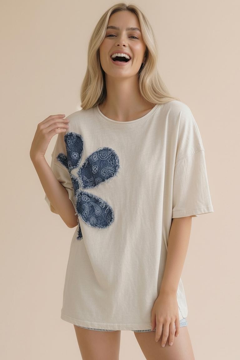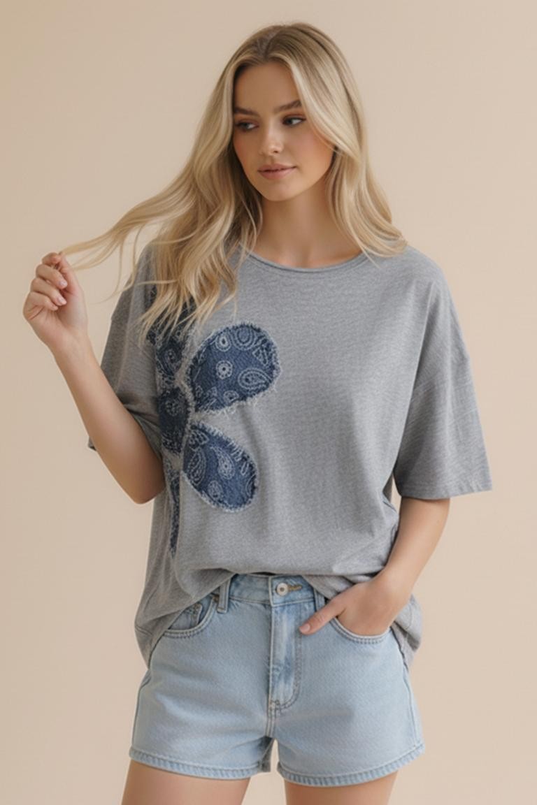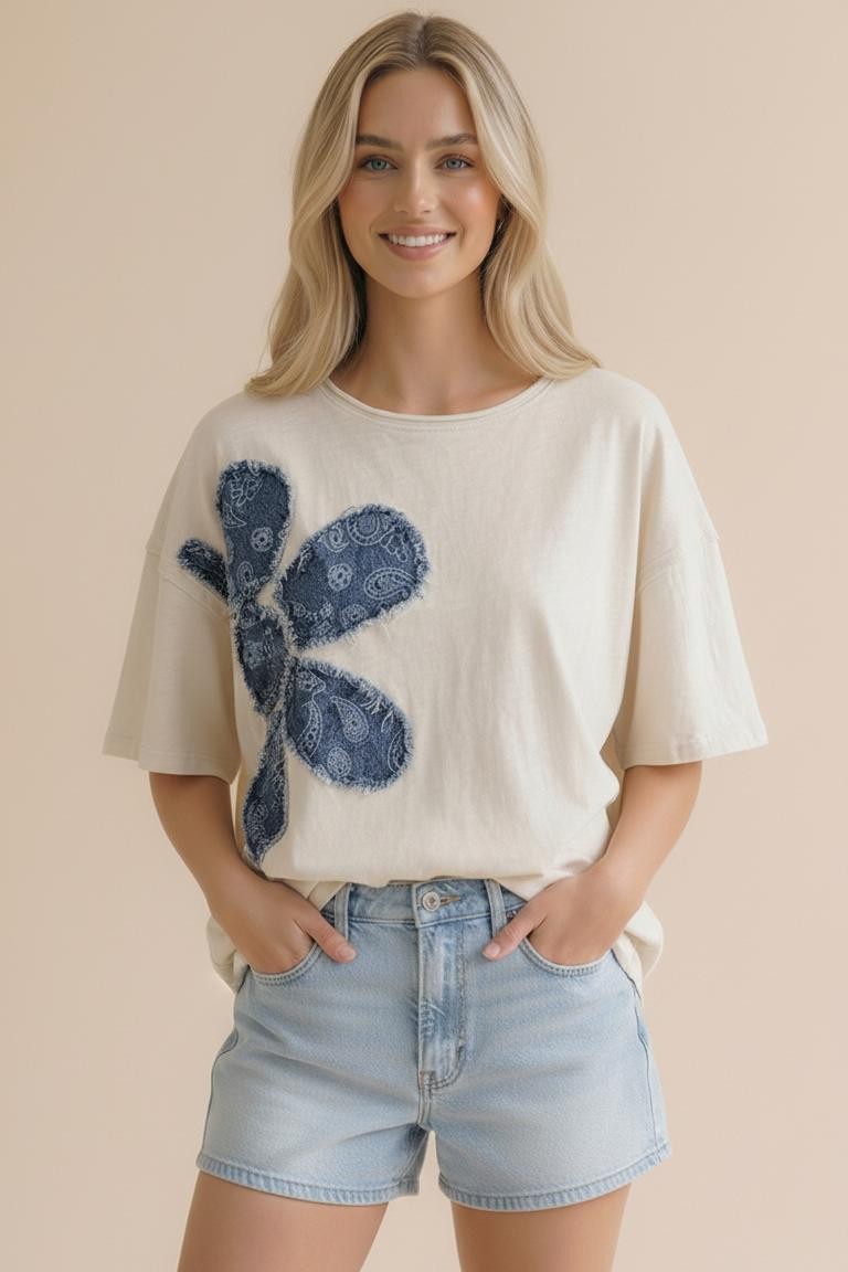 ROUND NECK DROP SHOUDLER SHORT SLEEVE COTTON SLUB KNIT TOP WITH PRINTED DENIM FLORAL PATCHWORK AND CUT EDGE DETAIL