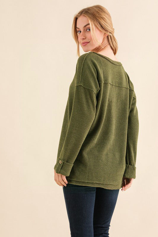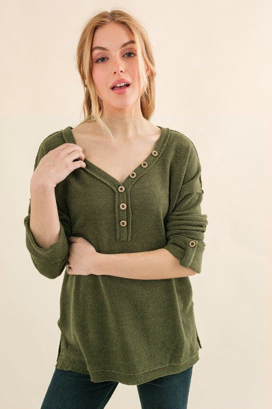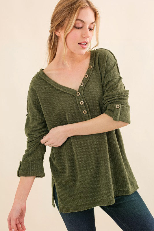 Olive Thermal Button Henley Top