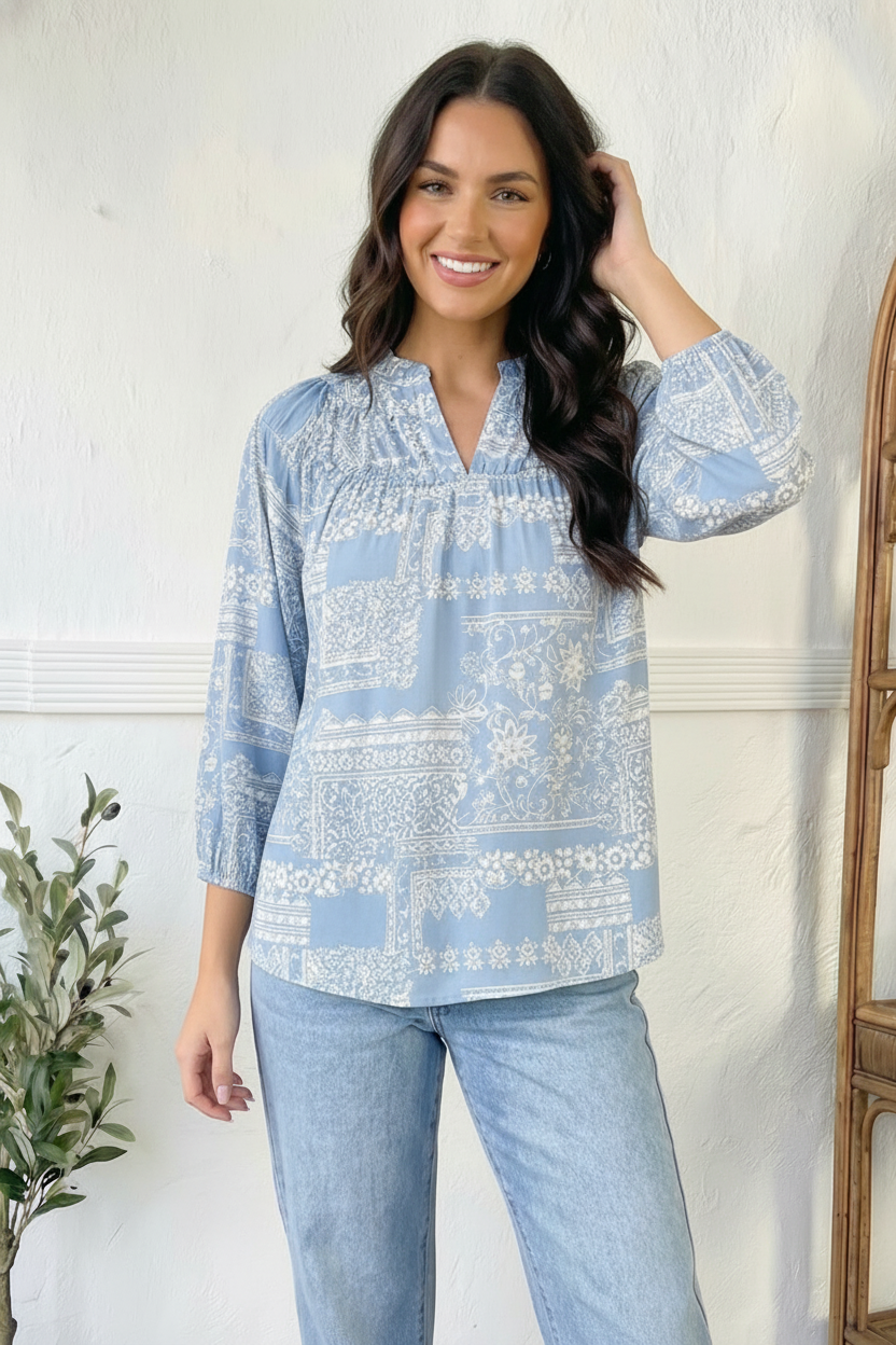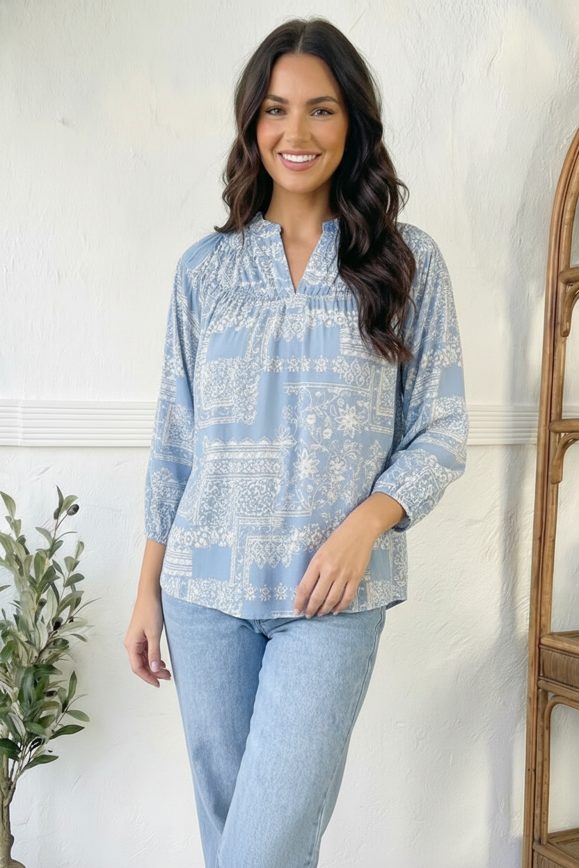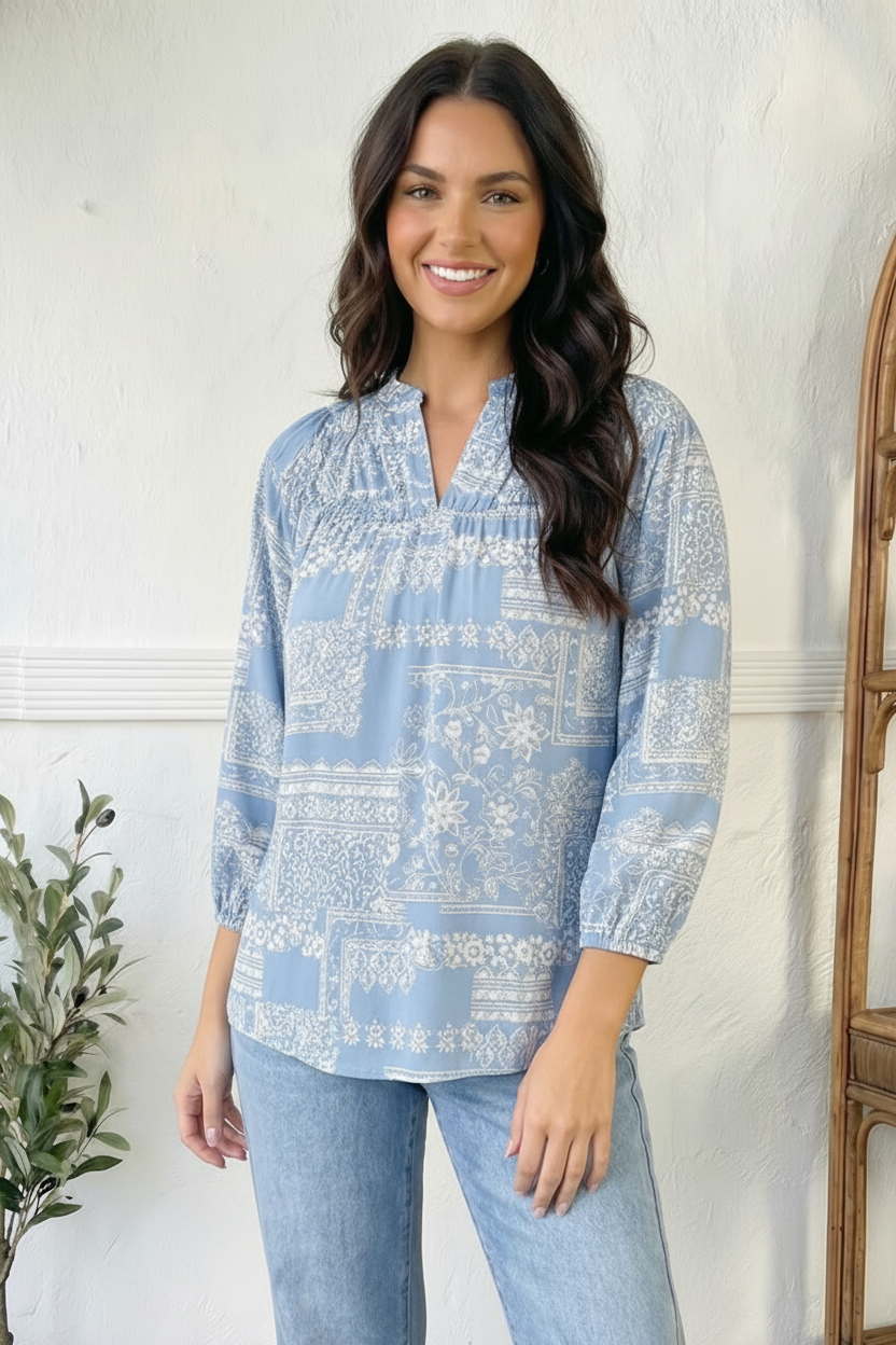 PLUS NOTCH NECK PATCHWORK PRINT WOVEN TOP