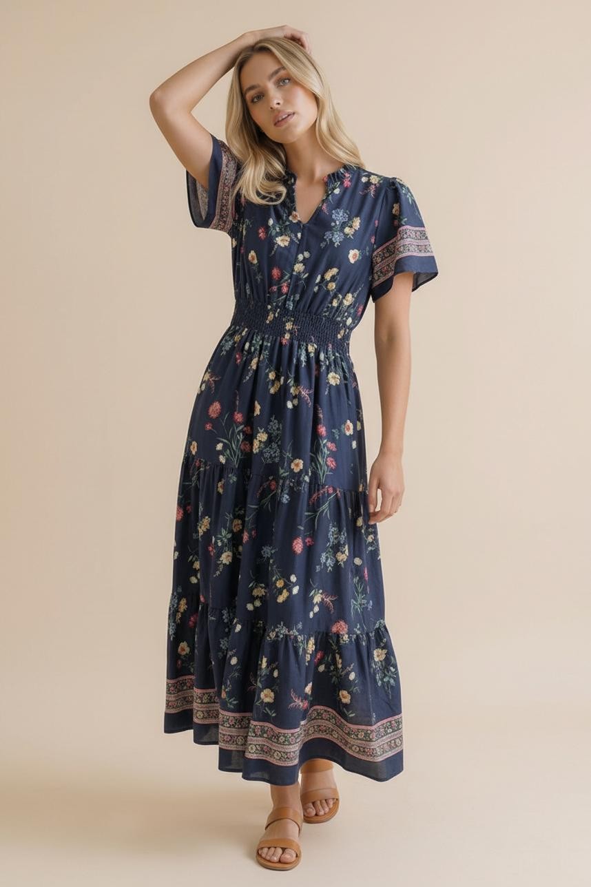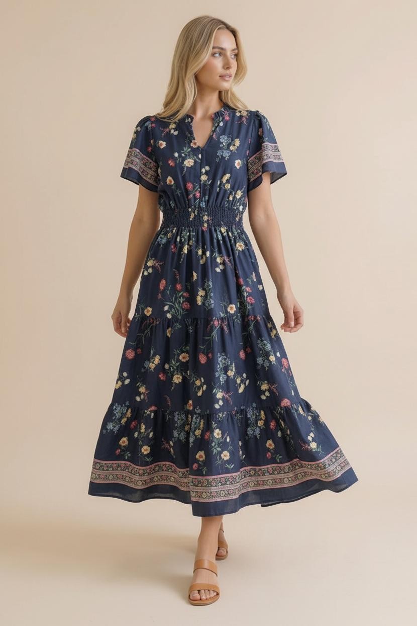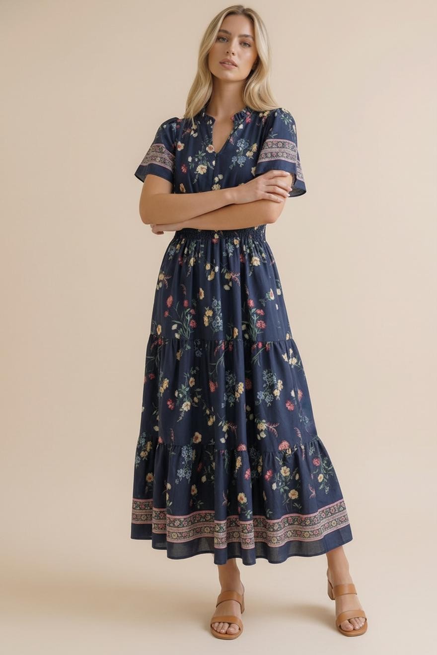 FRILL HEM NOTCH NECK PUFF SHORT SLEEVE FIT AND FLARE SMOCKED WAIST MAXI LENGTH TIERED FLORAL PRINT, BORDER PRINT WOVEN DRESS WITH SIDE POCKETS