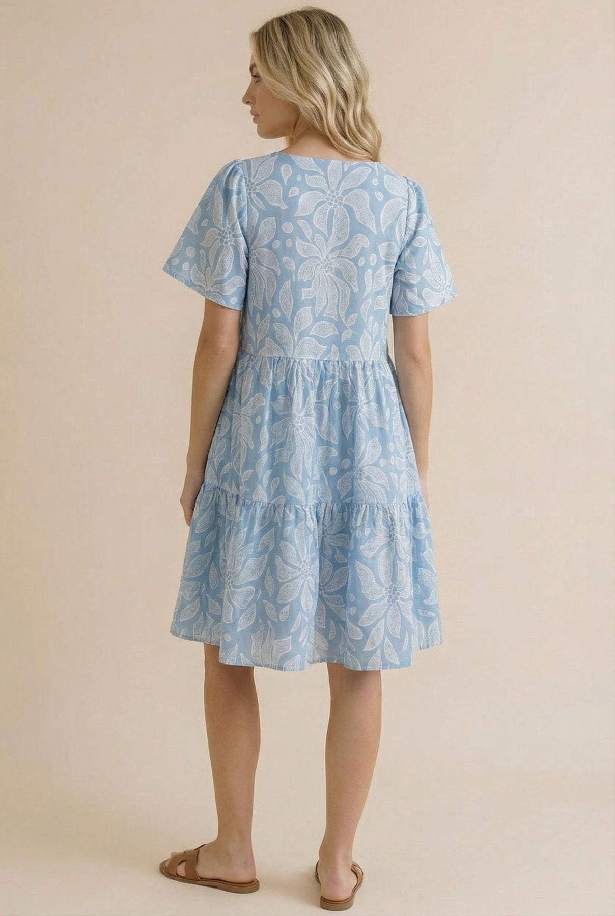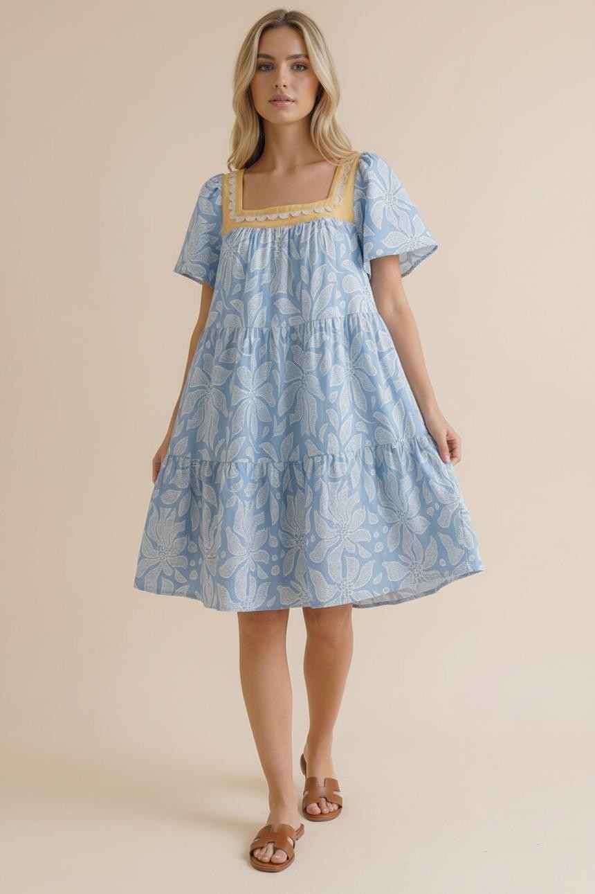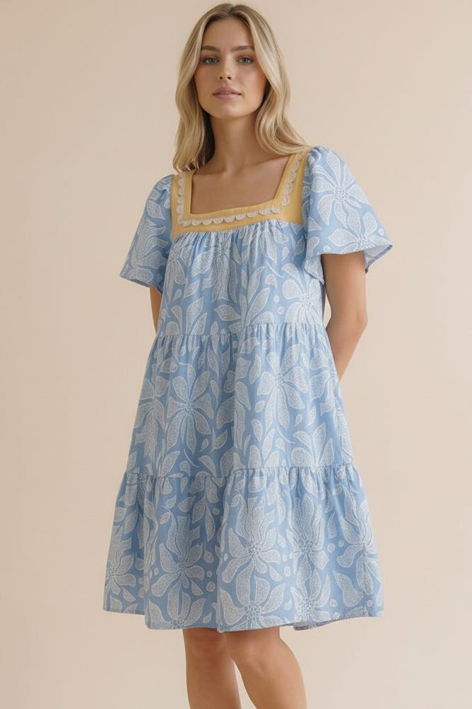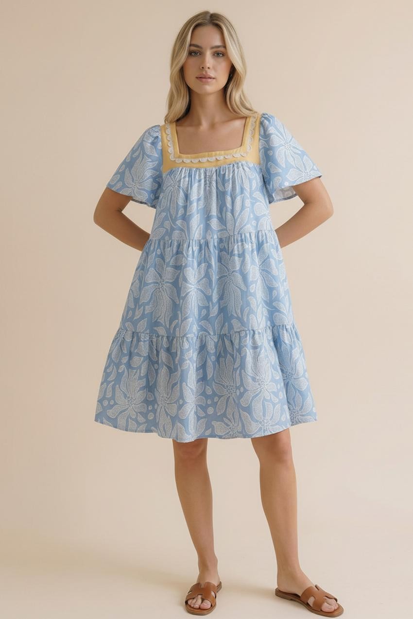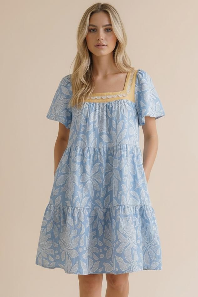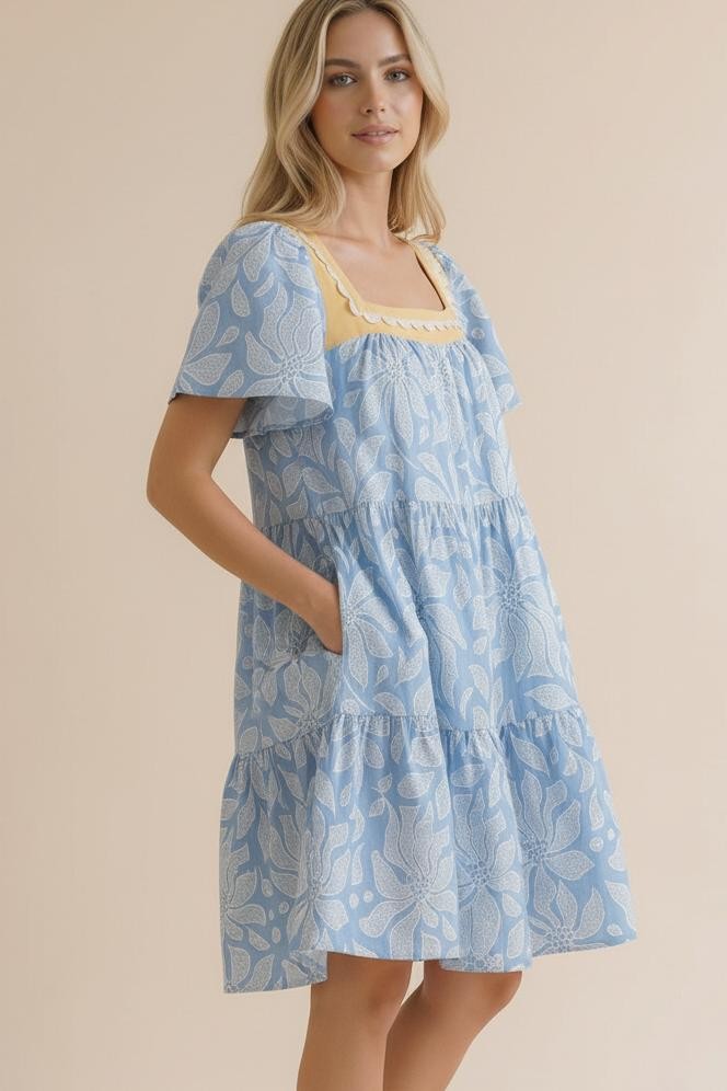 COLOR BLOCK SCALLOP CROCHET LACED SQUARE NECK FLUTTER SHORT SLEEVE BABYDOLL TIERED KNEE LENGTH EMBROIDERY LOOK FLORAL PRINT WOVEN DRESS WITH SIDE POCKETS