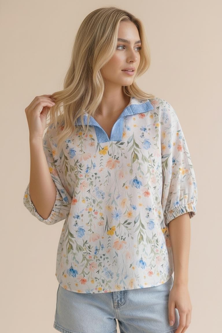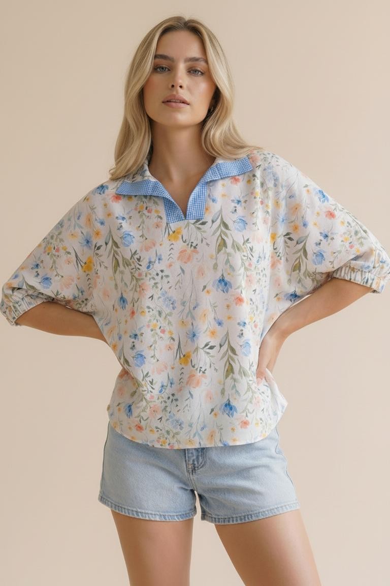 TAPED GINGHAM CHECK COLLAR NOTCH NECK FLORAL PRINT DOLMAN SHORT SLEEVE WOVEN TOP