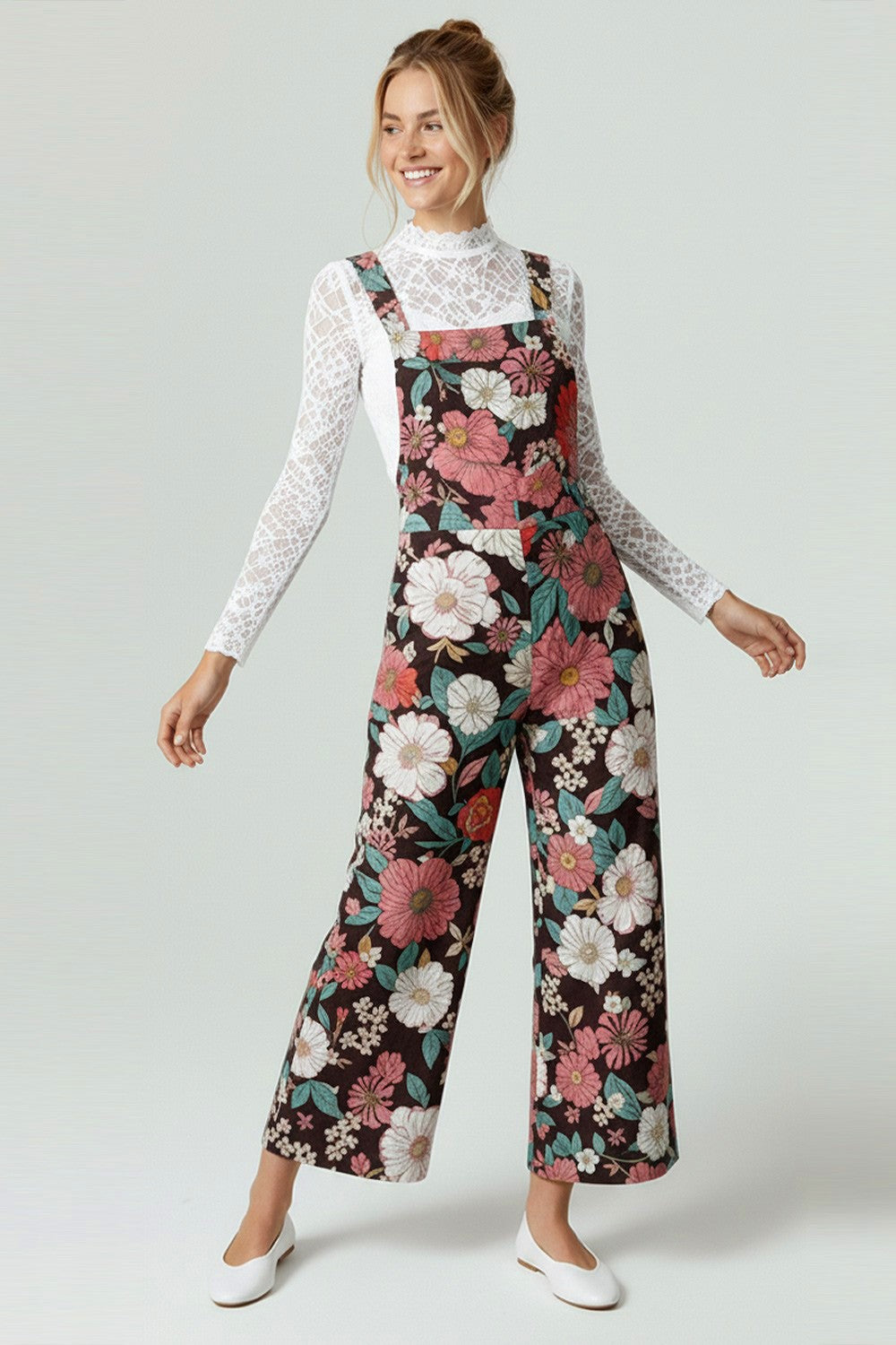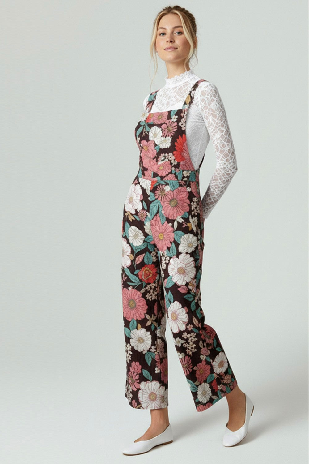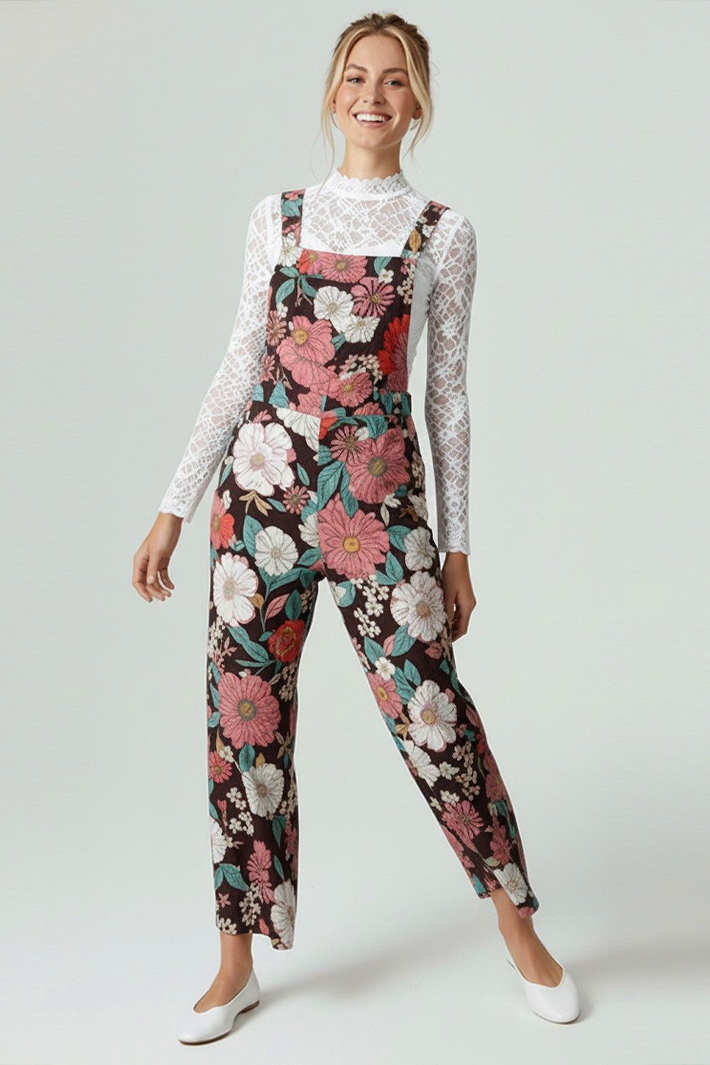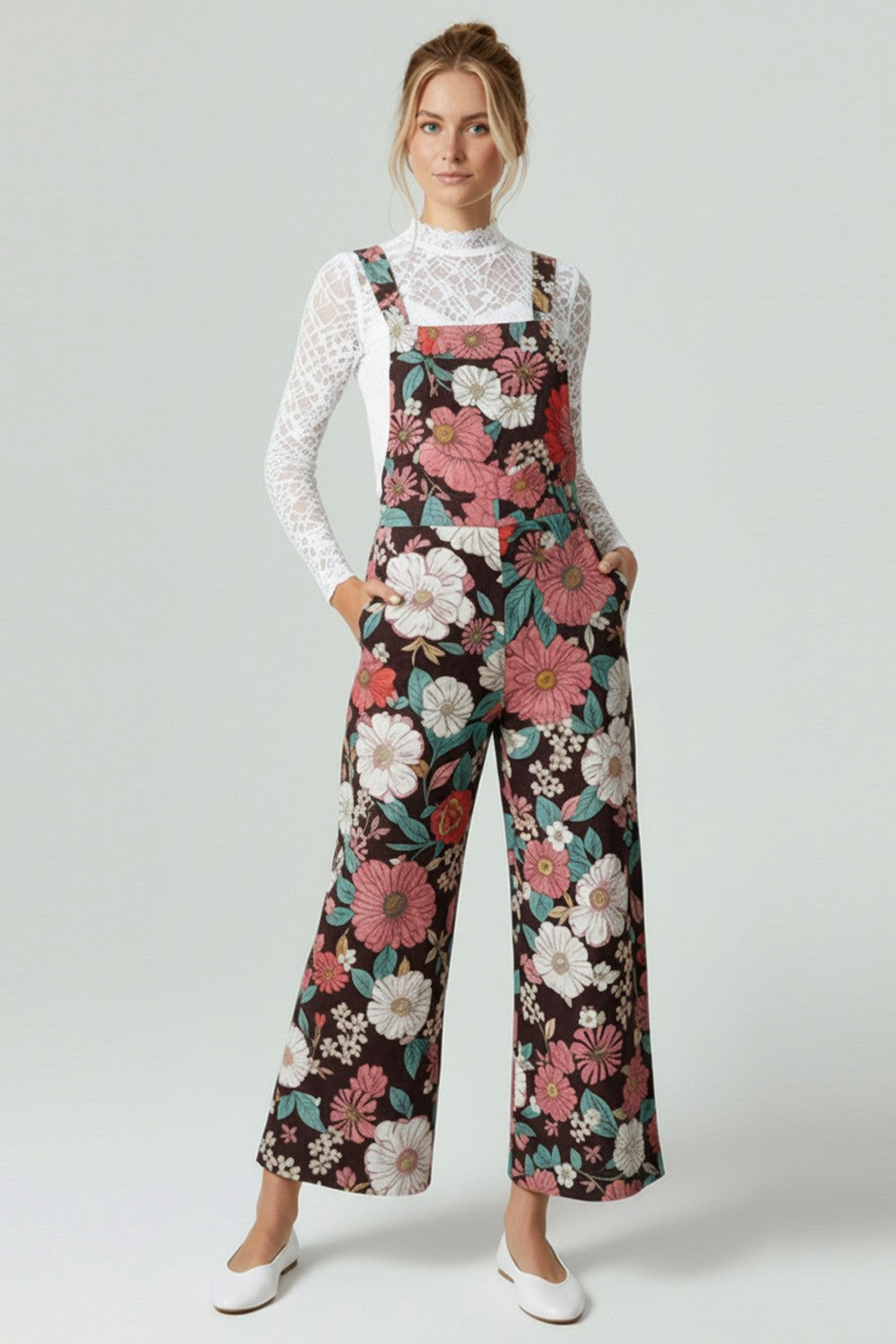 FLORAL PRINT LINEN OVERALL WITH ELASTIC SHOULDER STRAPS, DECORATIVE CHEST POCKET, AND SIDE POCKETS
