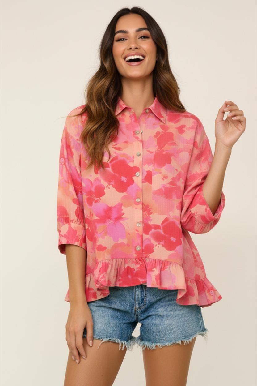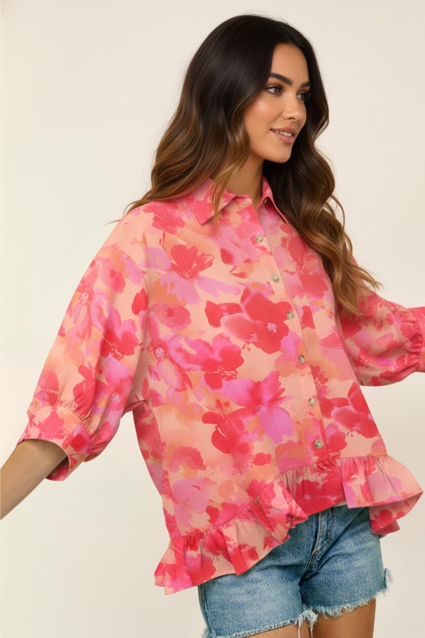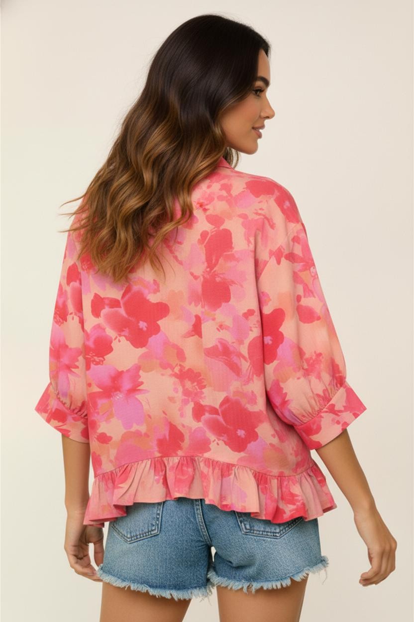 COLLARED BUTTON DOWN THREE QUARTER SLEEVE BABYDOLL PEPLUM FLORAL PRINT SHIRTS WITH POCKET