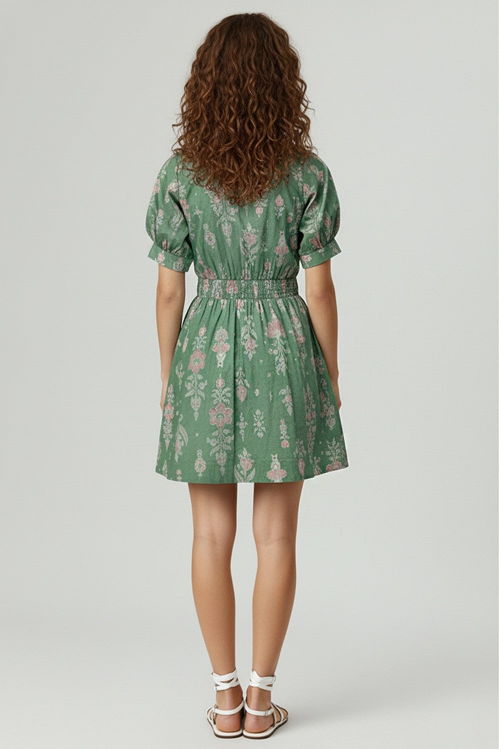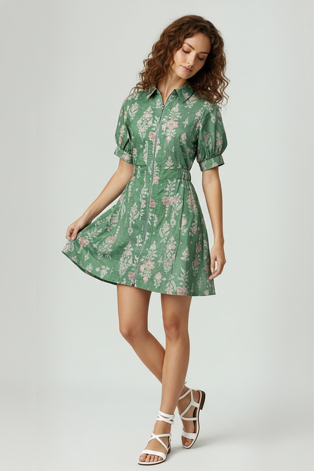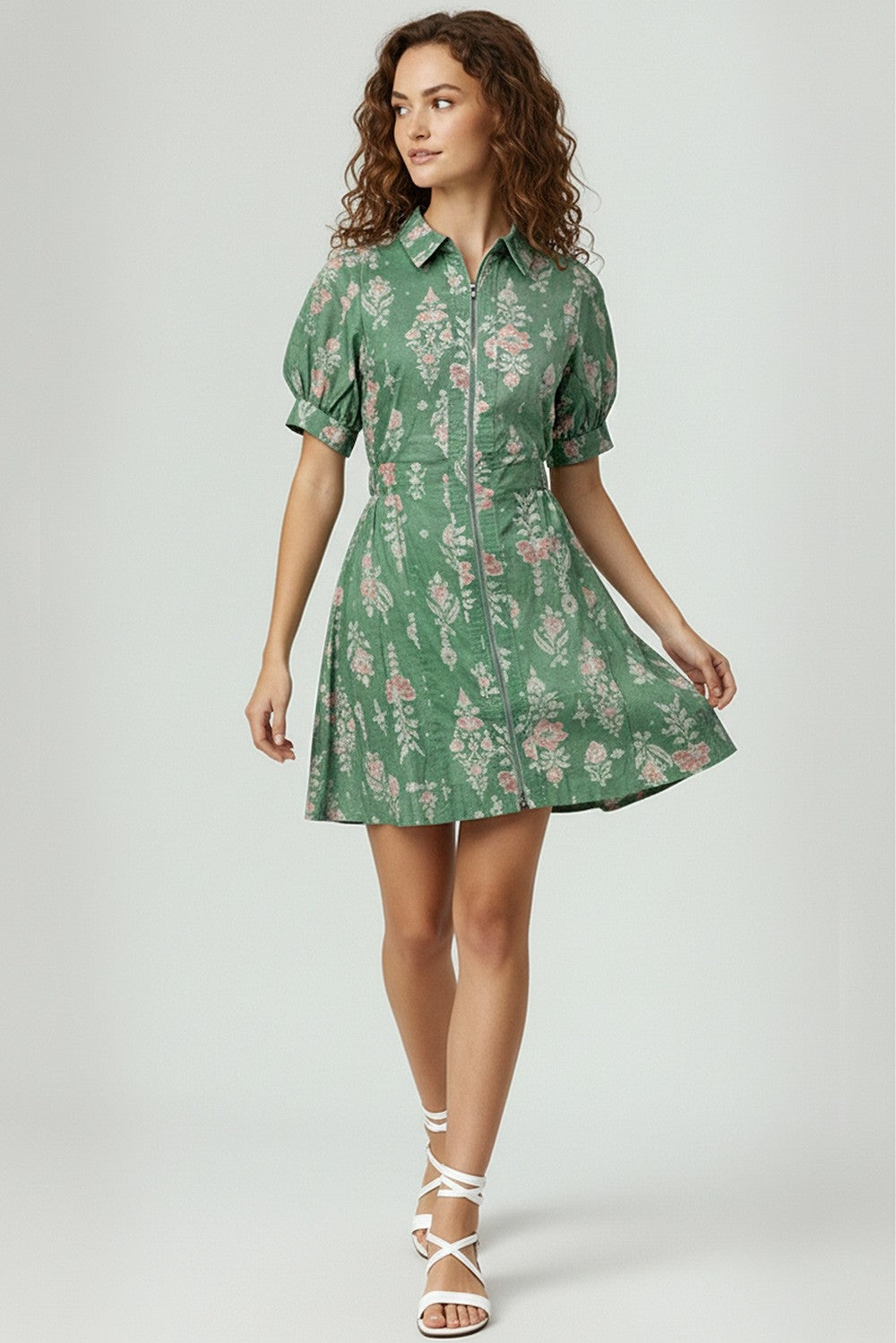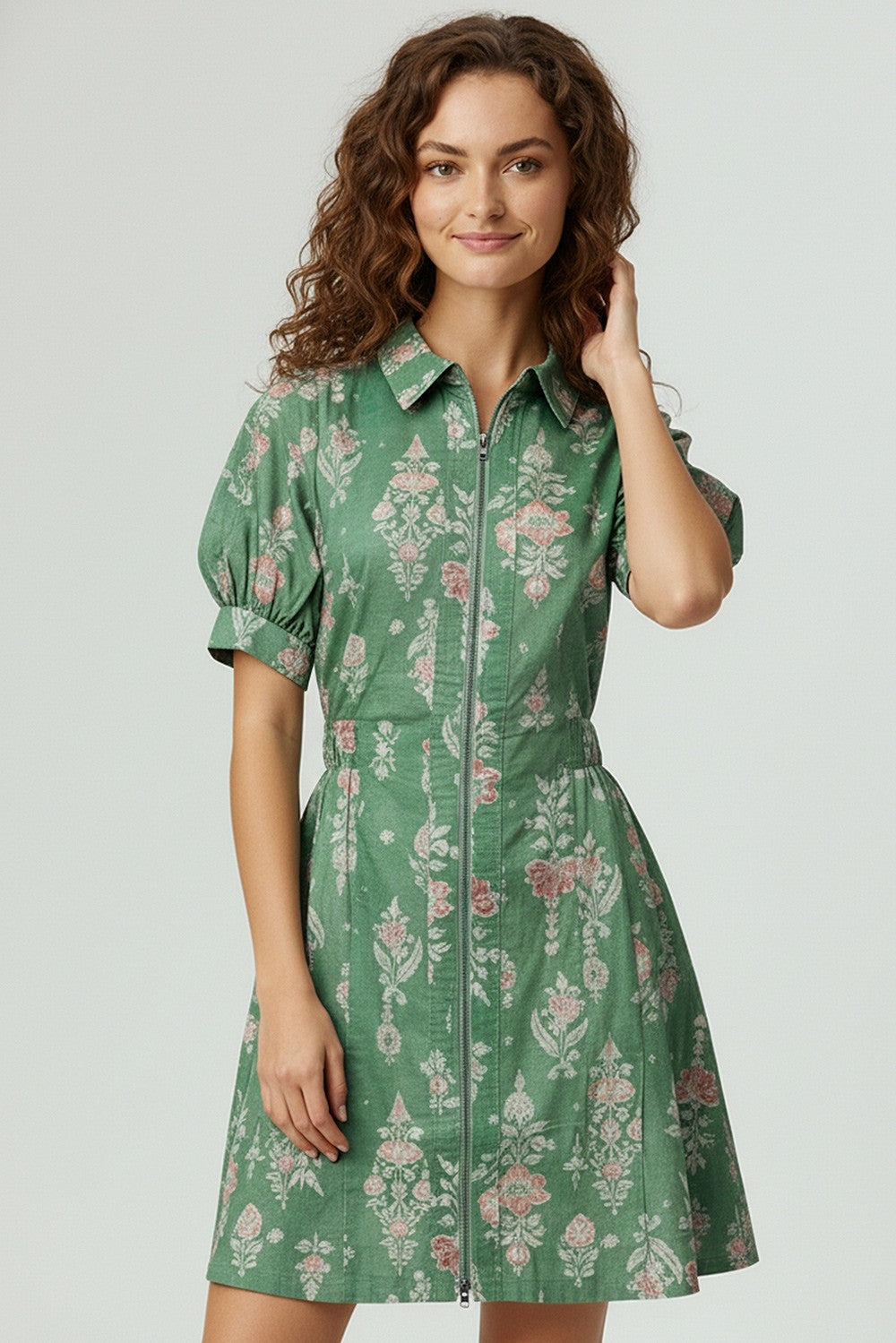 COLLARED NECK PRINTED WOVEN MINI DRESS WITH FRONT ZIP-UP, SMOCKED WAIST, PUFF SLEEVES, AND SIDE POCKETS