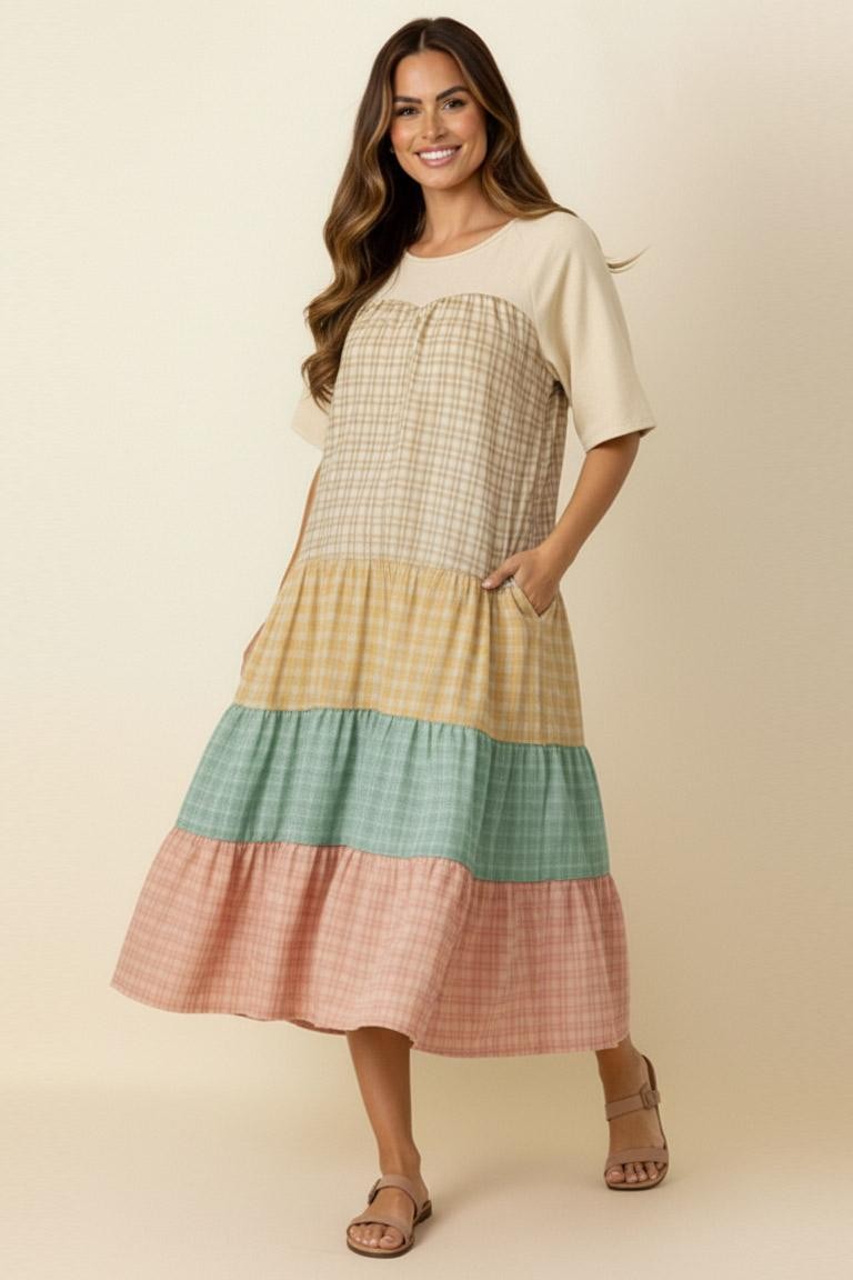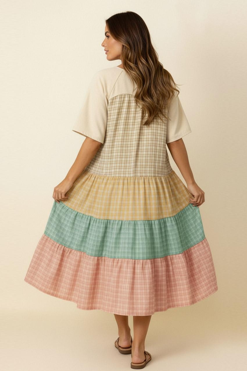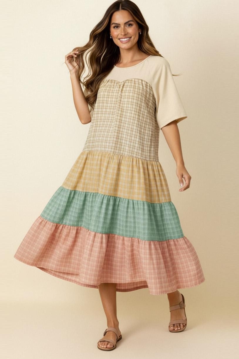 FRENCH TERRY AND PLAID COLORBLOCK TIERED MIDI DRESS