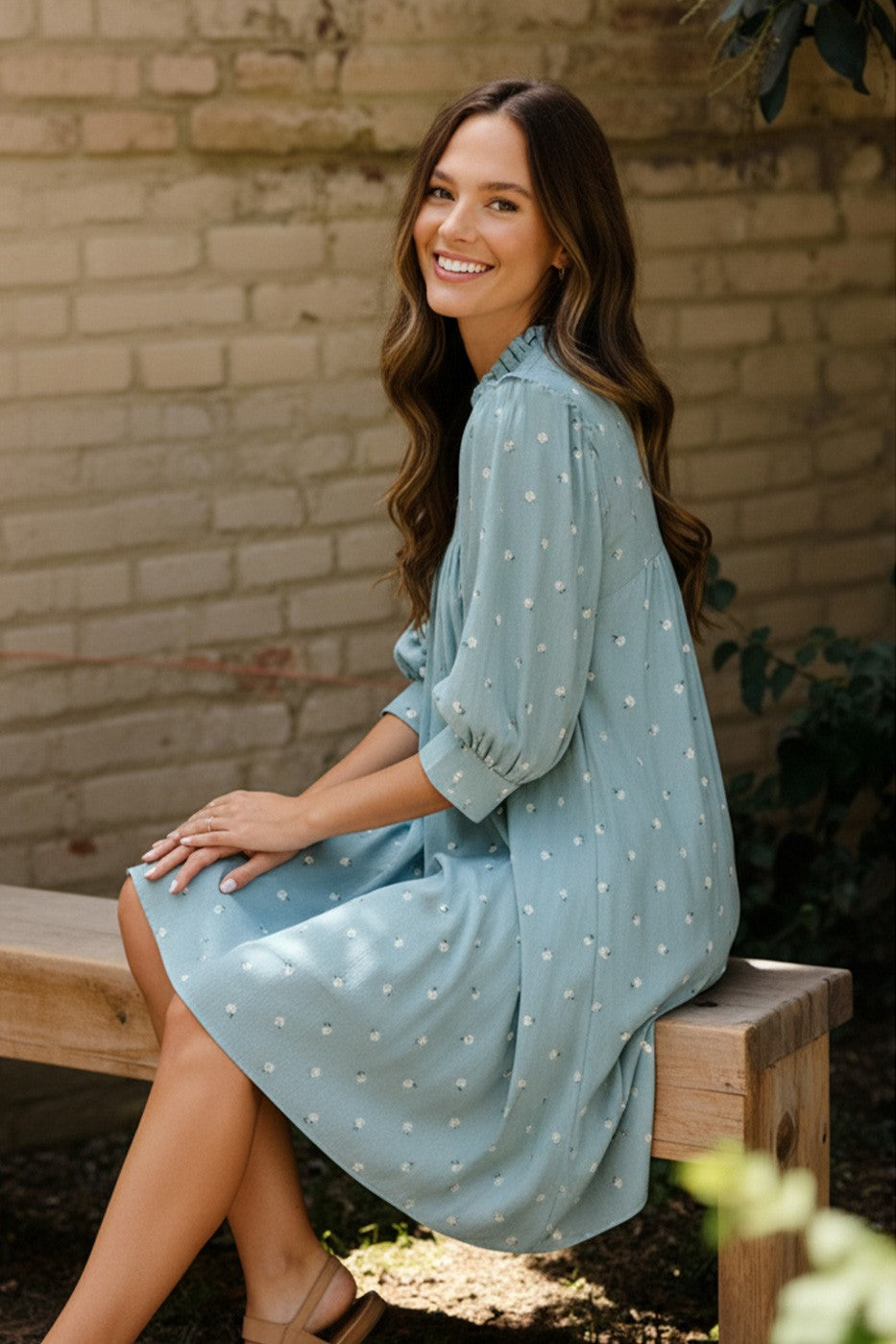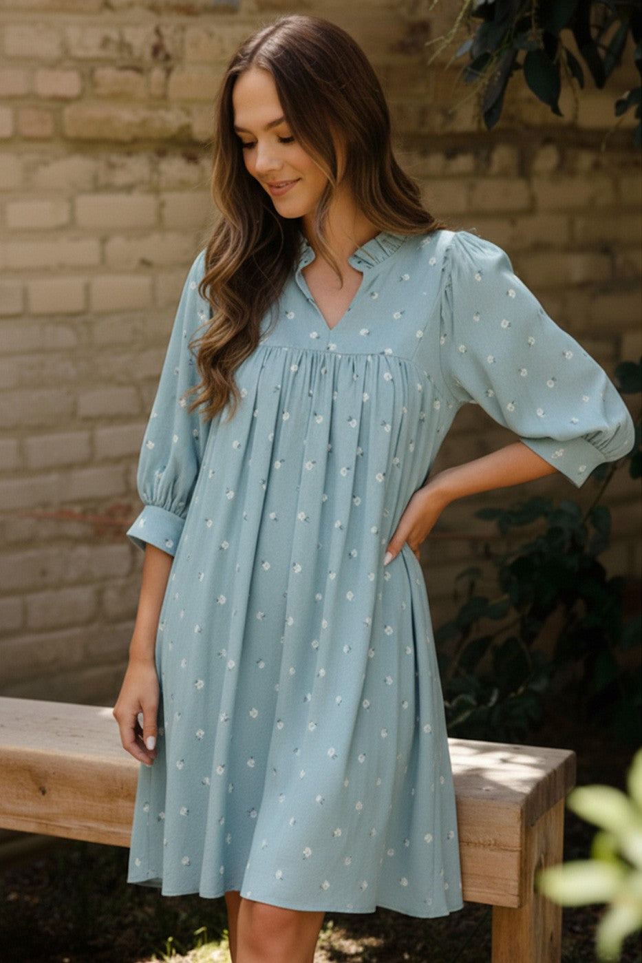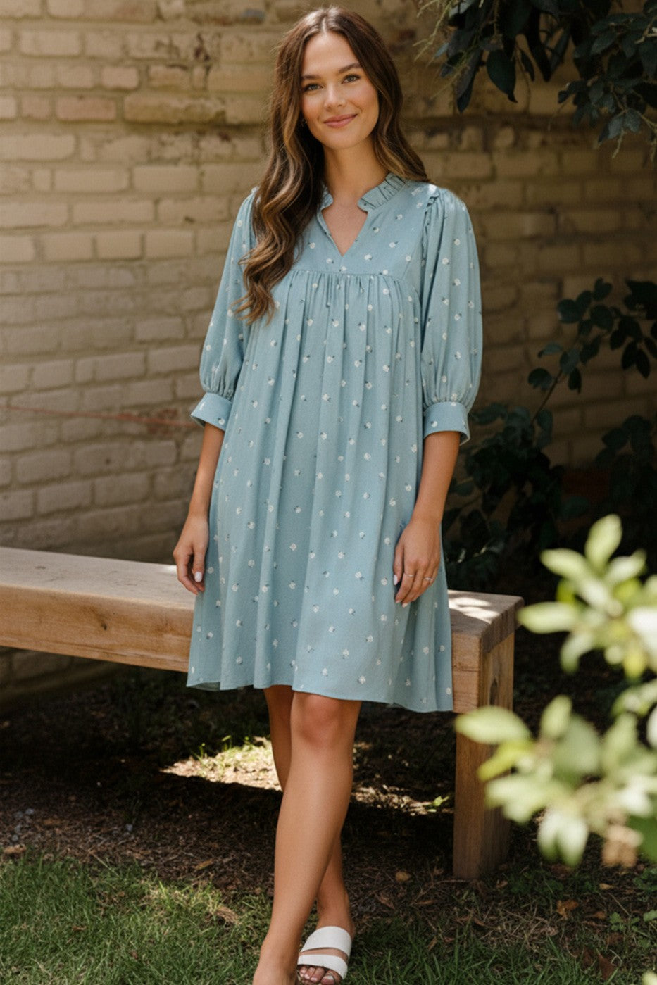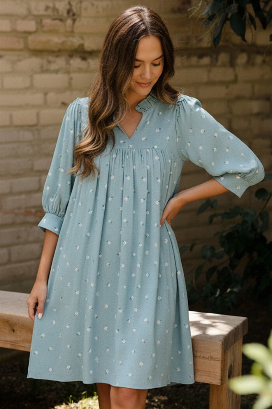 FRILLED NOTCH NECK YOKE BUBBLE SHORT SLEEVE FLORAL PRINT SHIFT LINEN WOVEN DRESS WITH SIDE POCKETS