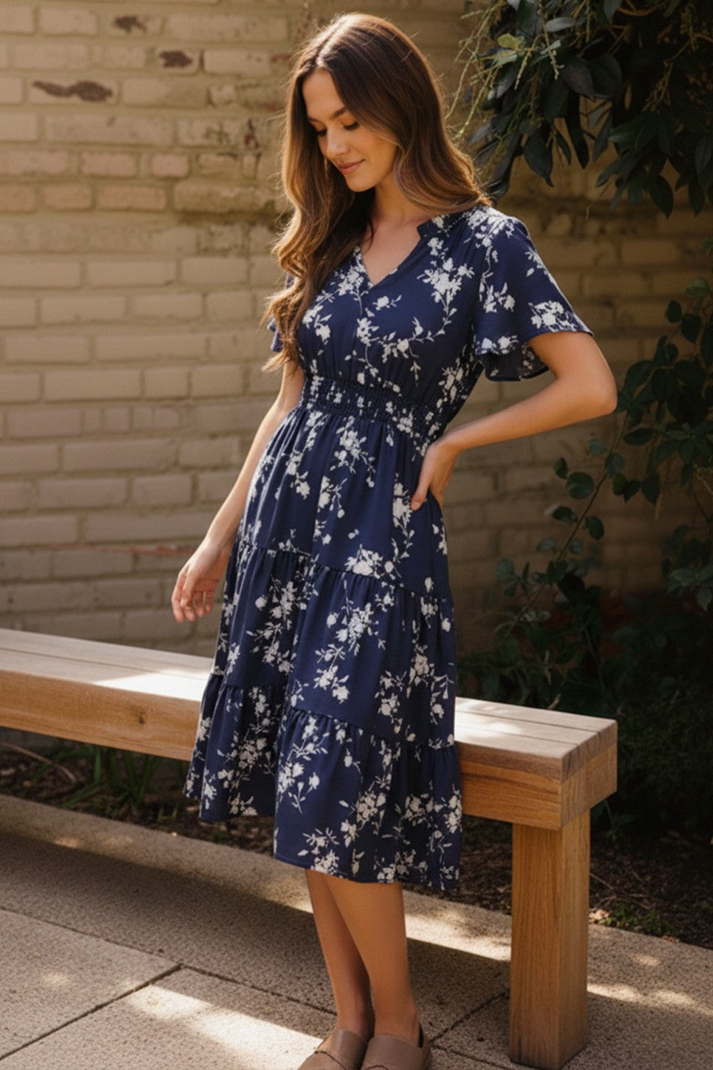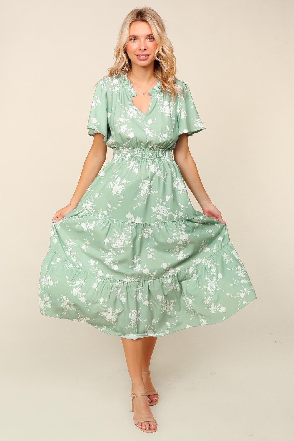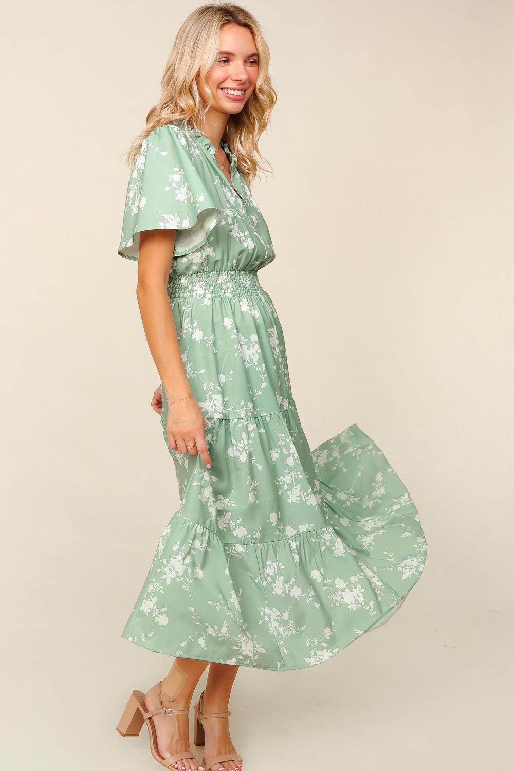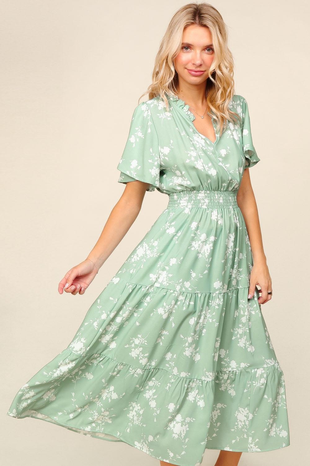 FRILL HEM NOTCH NECK PUFF SHORT SLEEVE FIT AND FLARE SMOCKED WAIST MAXI LENGTH TIERED FLAT FLORAL PRINT WOVEN DRESS WITH SIDE POCKETS