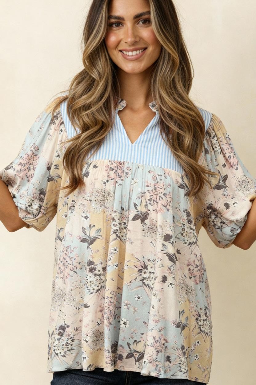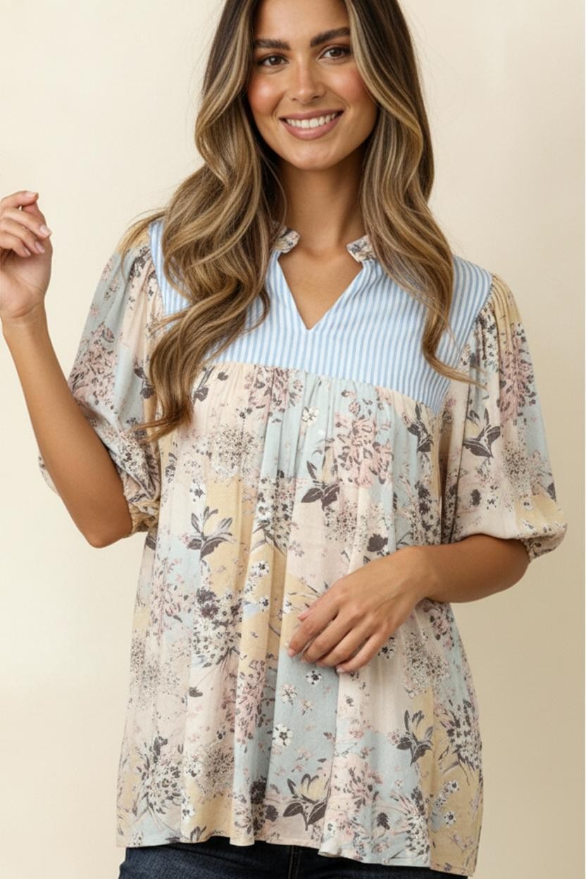 FRILLED NOTCH NECK COLOR BLOCK YOKE BUBBLE PUFF SHORT SLEEVE FLORAL PRINT WOVEN BLOUSE TOP