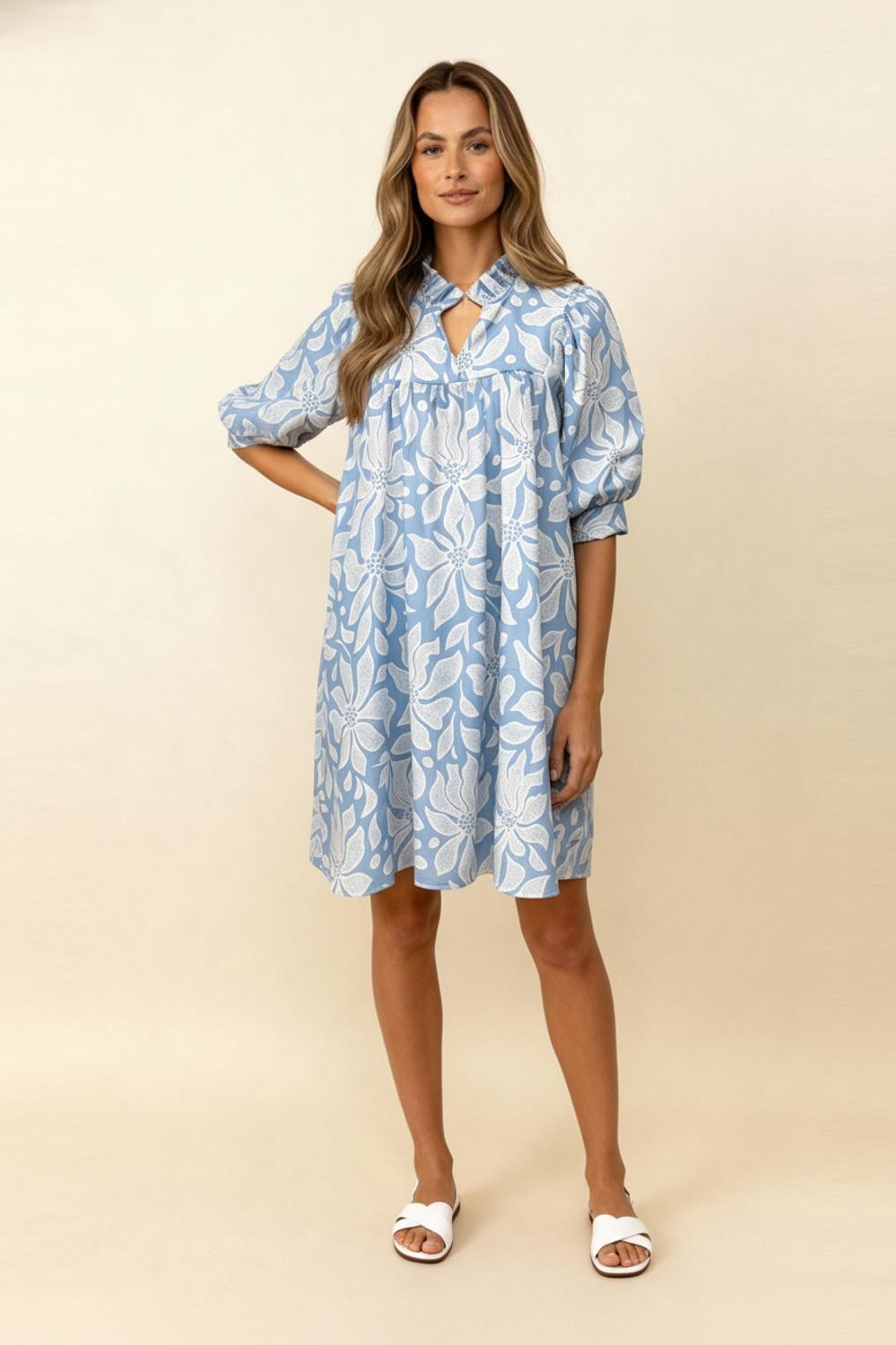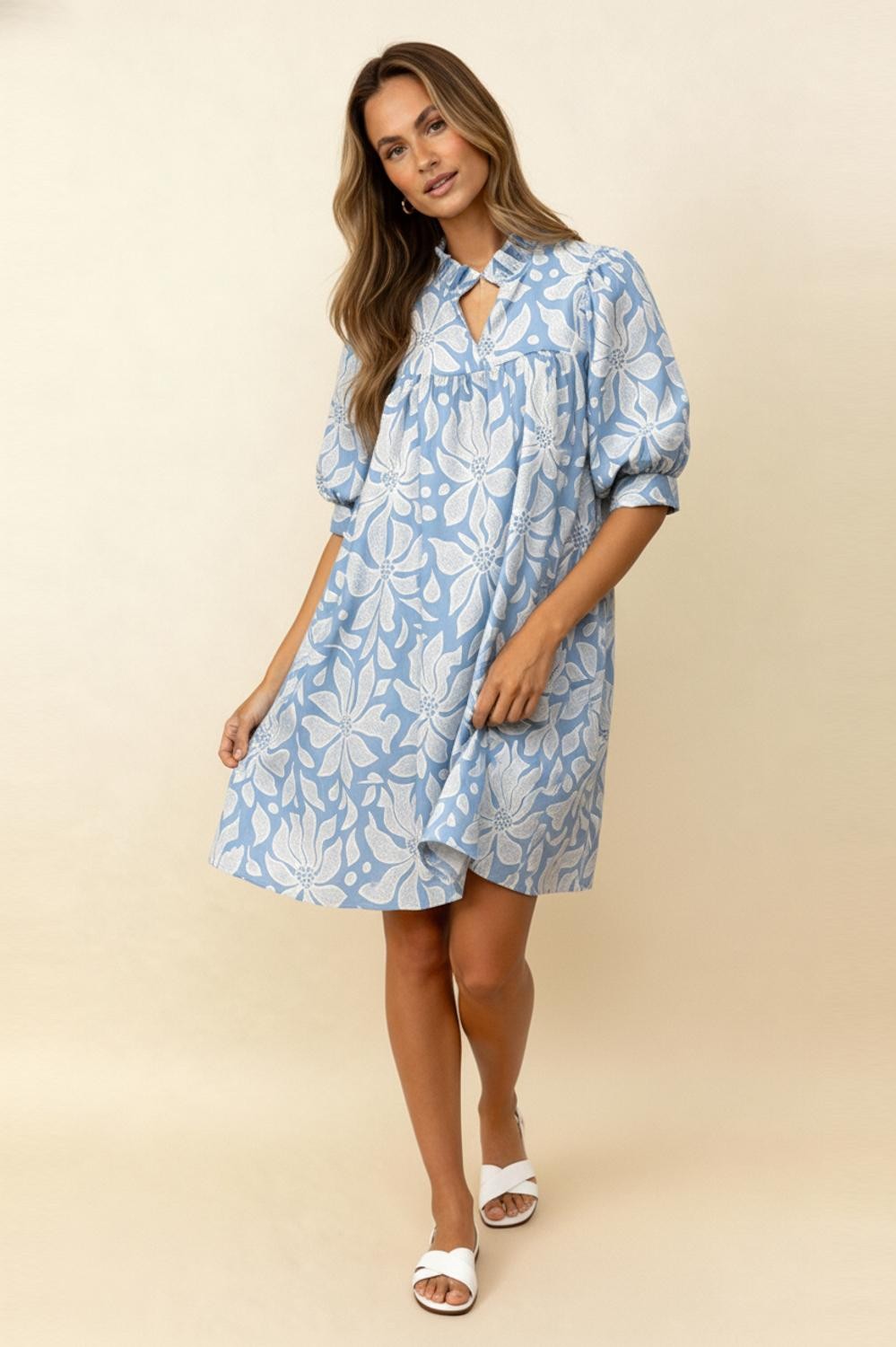 FRILLED NOTCH NECK YOKE BUBBLE SHORT SLEEVE EMBROIDERY PRINT FLORAL PRINT SHIFT WOVEN DRESS WITH SIDE POCKETS