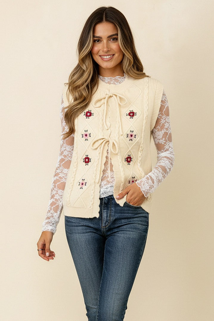 SCALLOP ROUND NECK TIED BOW FRONT EMBROIDERED FLORAL SWEATER VEST