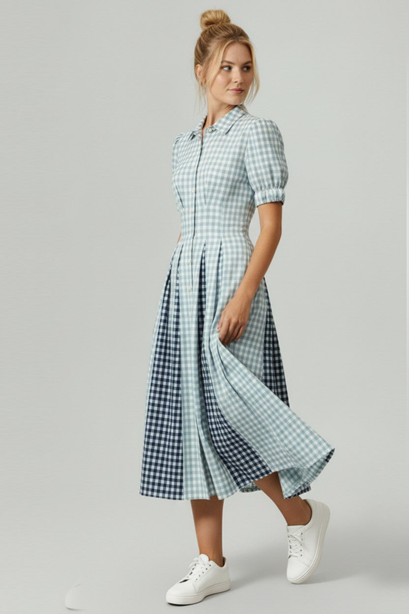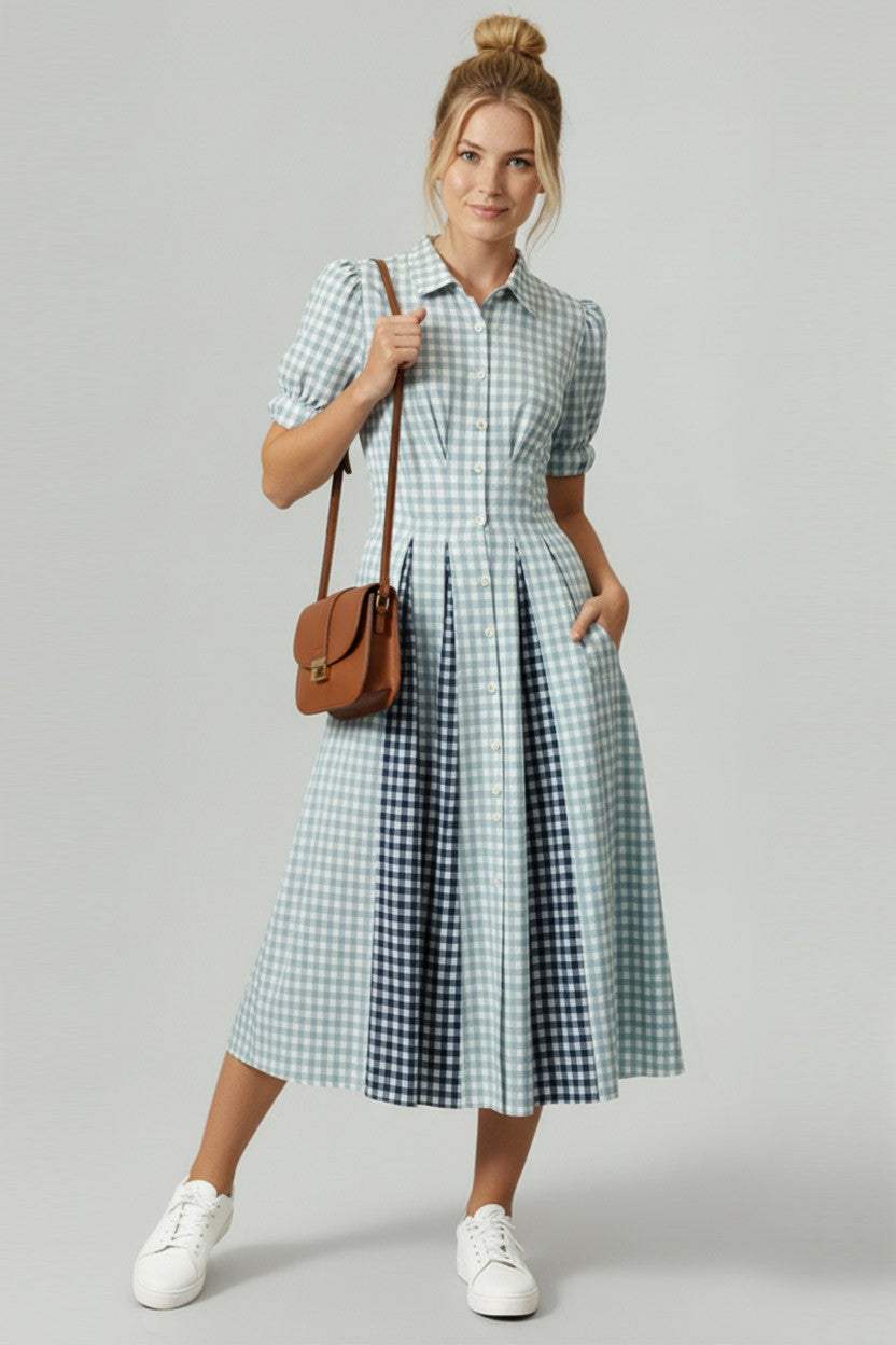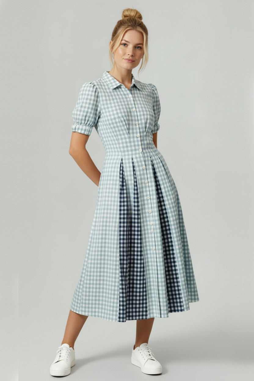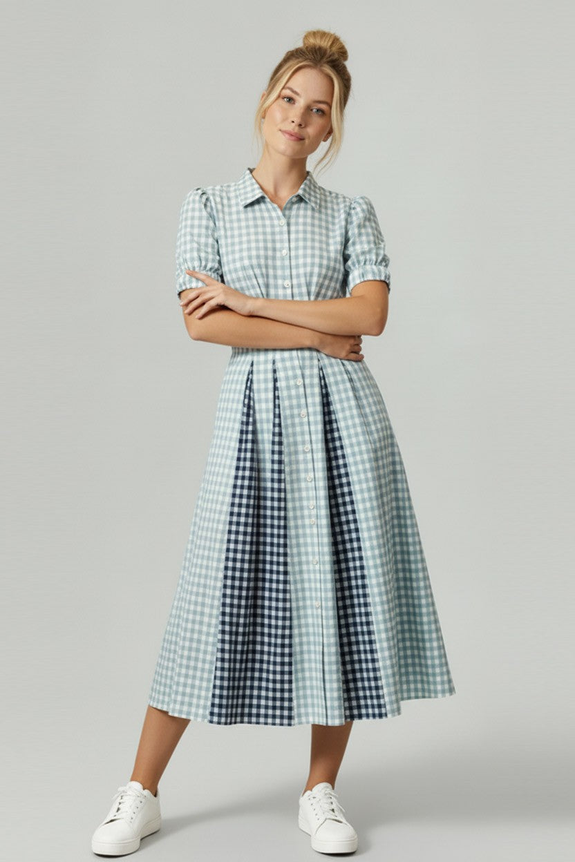 GINGHAM PRINT COLORBLOCK PANEL GODET BUTTON-UP COLLAR MIDI DRESS WITH WAIST PINTUCK DETAIL