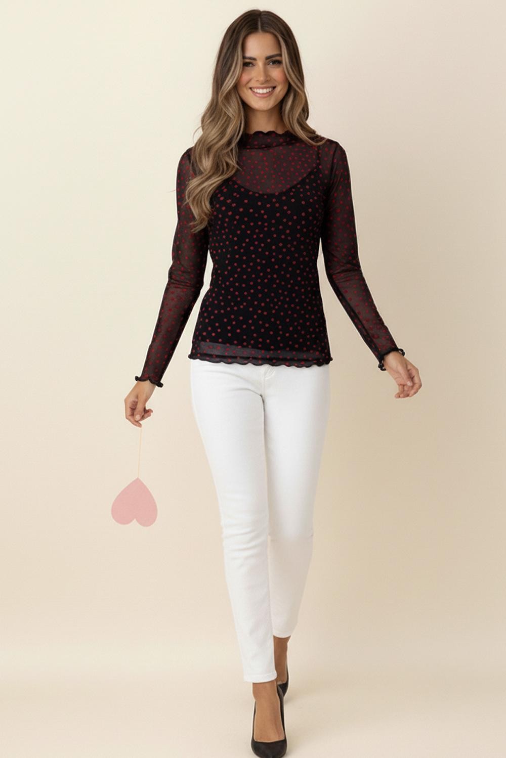 HIGH NECK LINE LONG SLEEVE HEART PRINT MESH SEMI SHEER TOP WITH FRILLED MERROW HEM