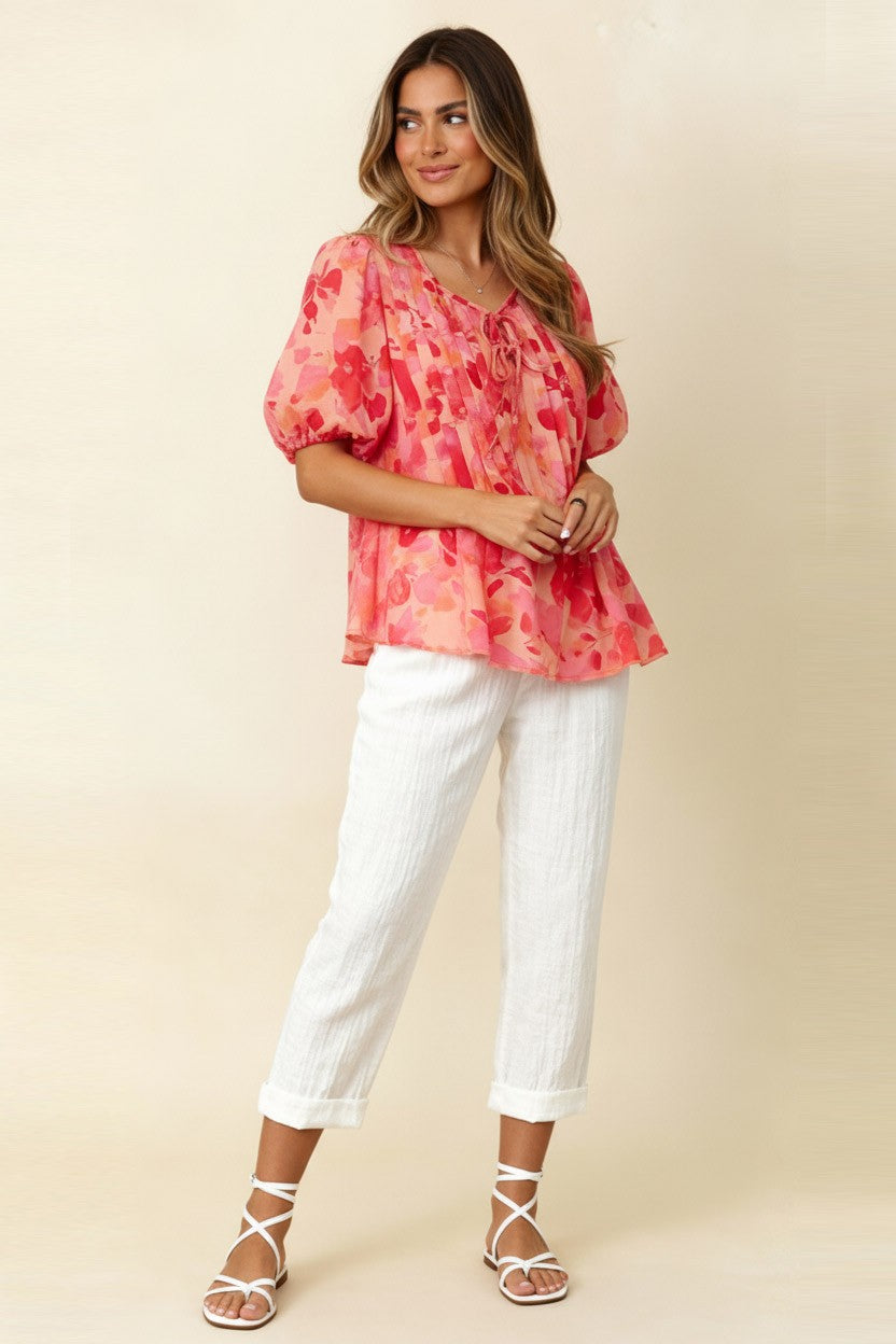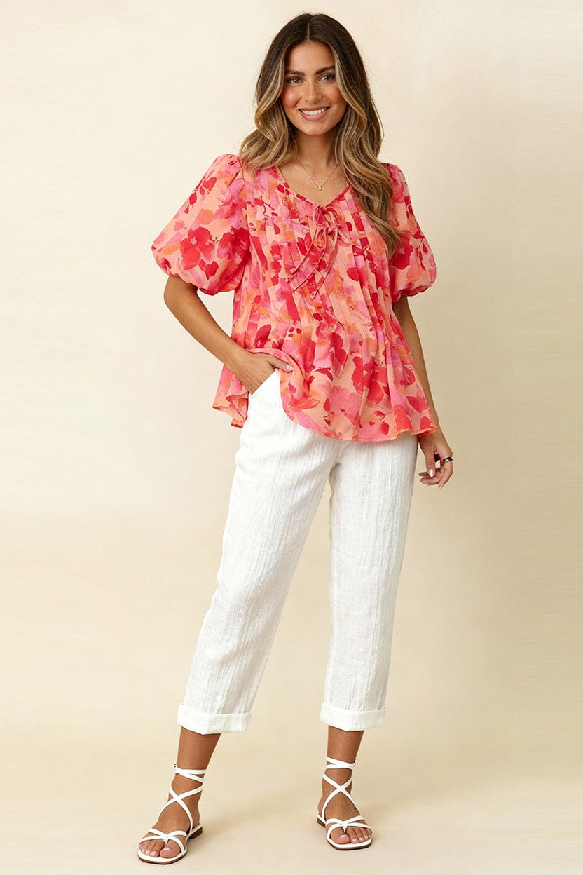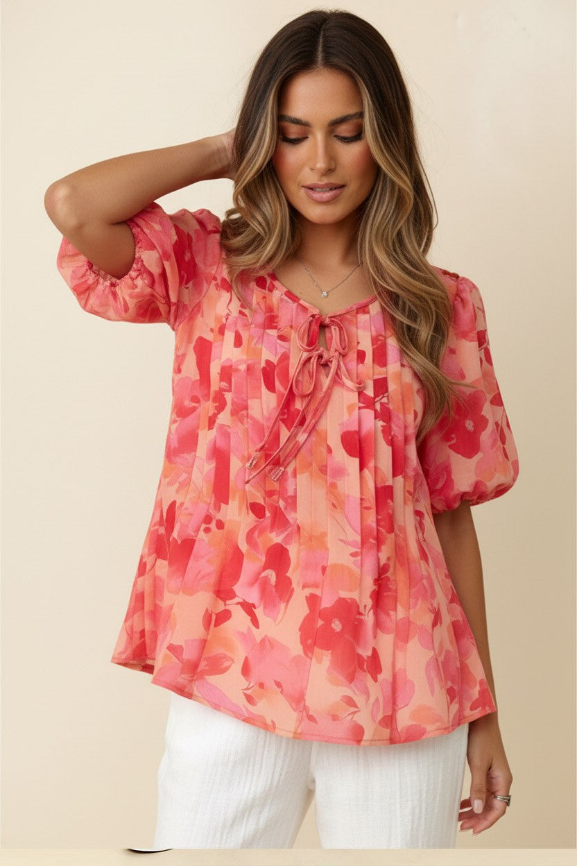 SCOOP NECK WITH RIBBON BOW DETAIL PLEATED BUBBLE SHORT SLEEVE FLORAL PRINT WOVEN BLOUSE TOP