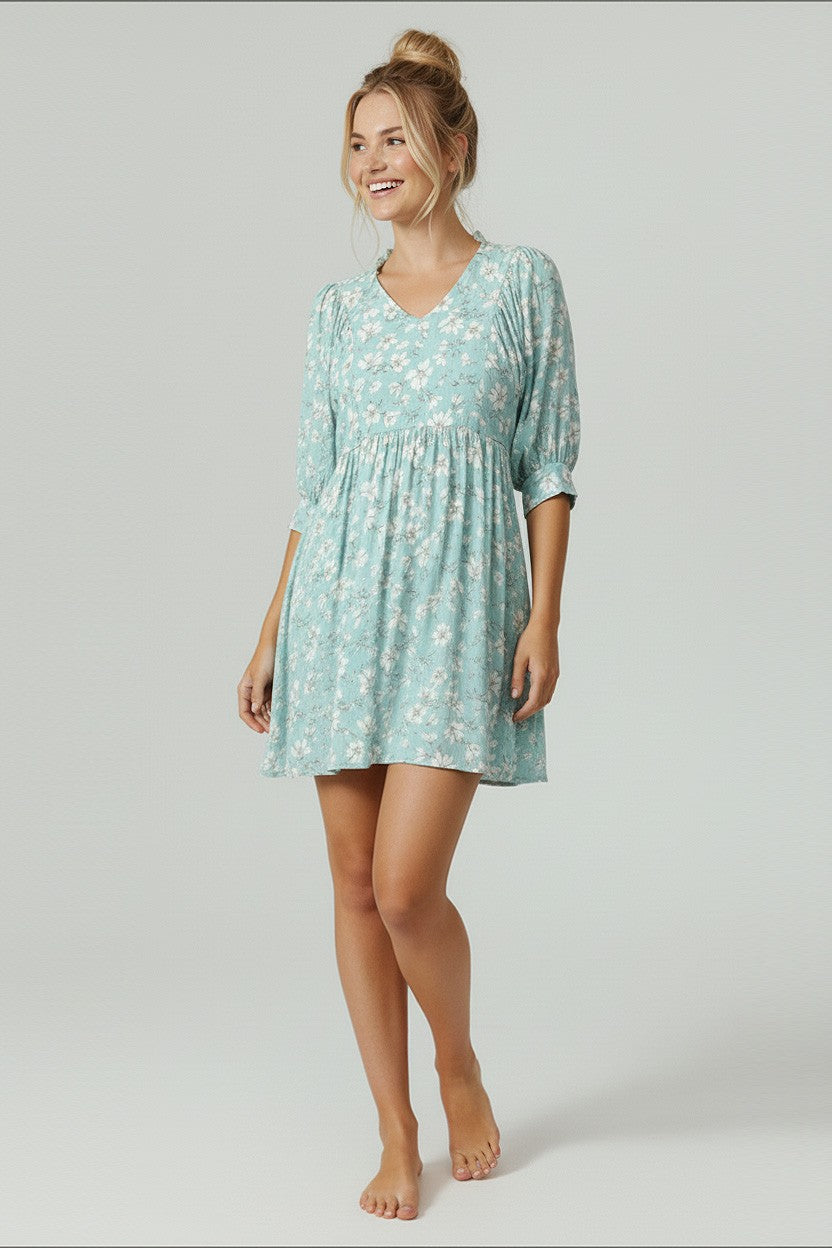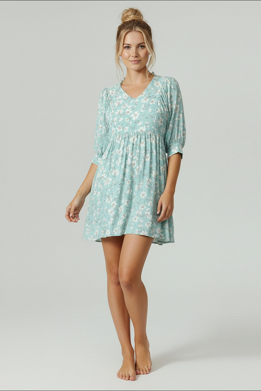 COLLARED BUBBLE THREE QUARTER SLEEVE FLORAL PRINT CRINKLE WOVEN DRESS WITH SIDE POCKET
