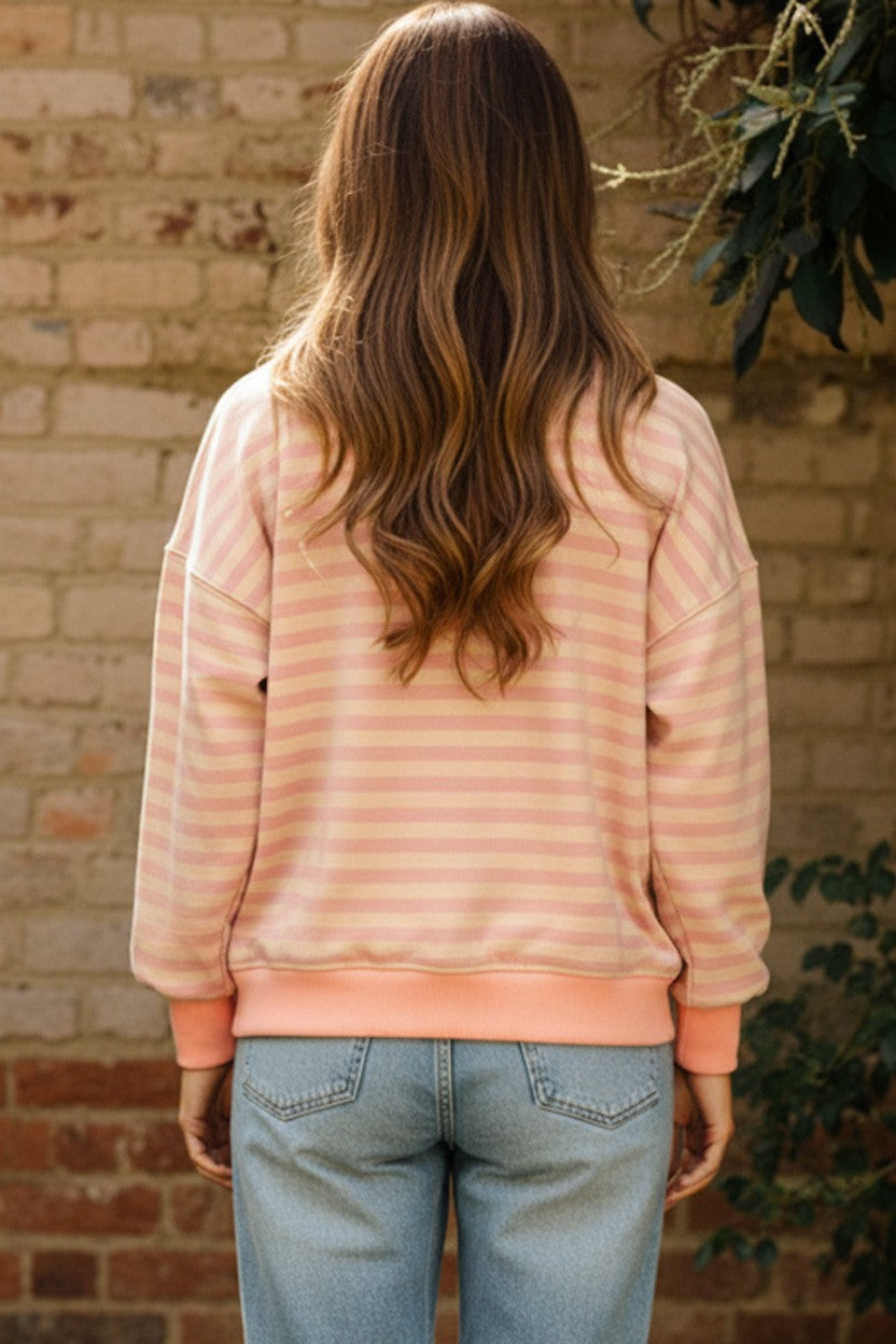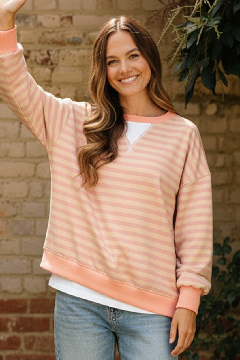 CREW NECK WITH TRI ANGLE DETAIL LONG SLEEVE OVERSIZED LOOSE FIT STRIPE FRENCH TERRY PULLOVER TOP WITH COLOR BLOCK RIB BAND