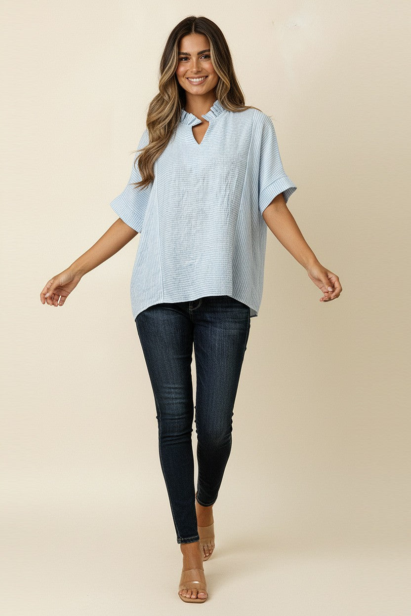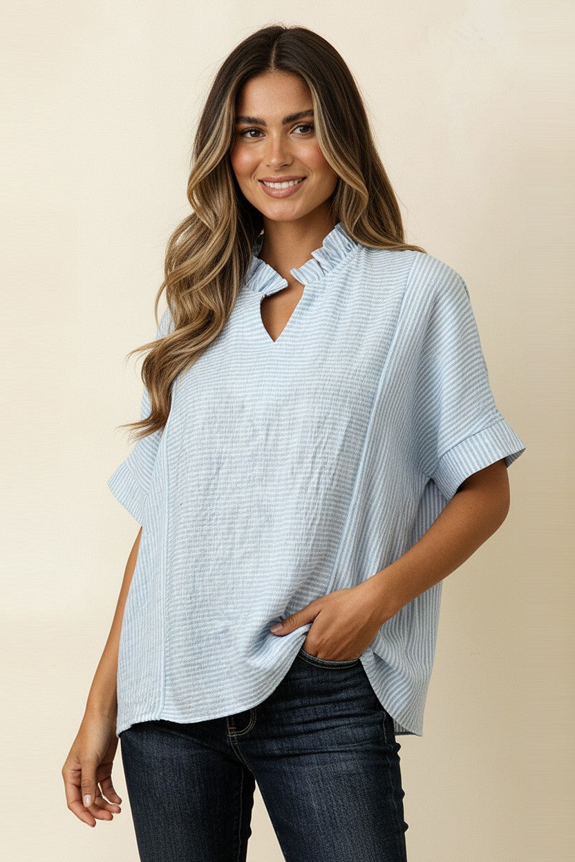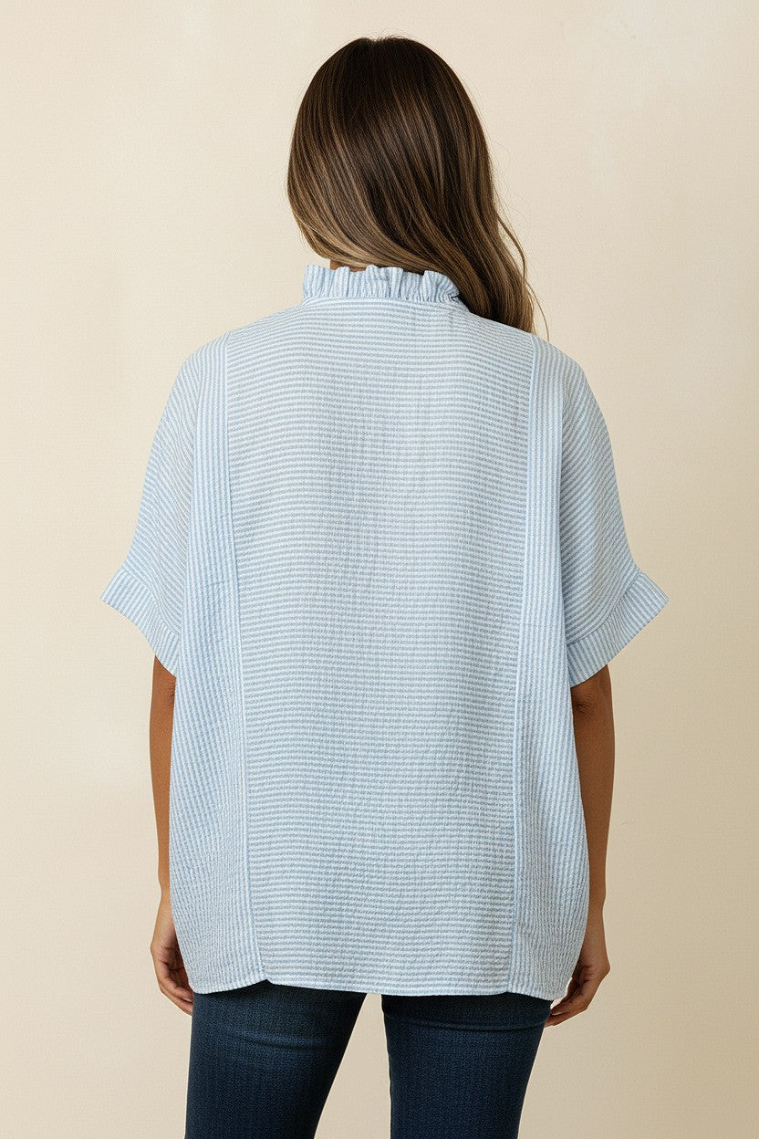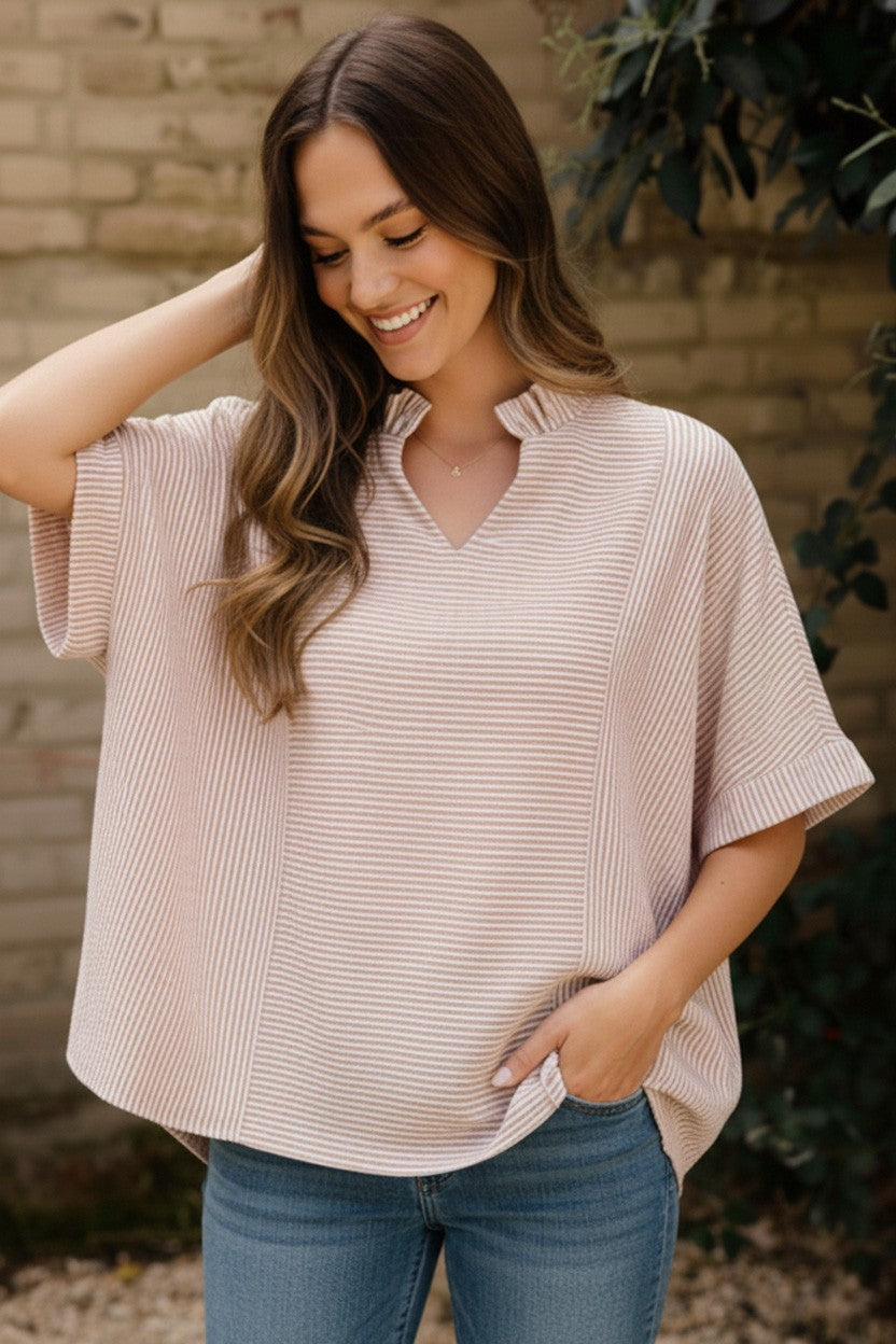 FRILL NOTCH NECK DROP SHOULDER DOLMAN SHORT SLEEVE OVERSIZED PIN STRIPE WOVEN TOP