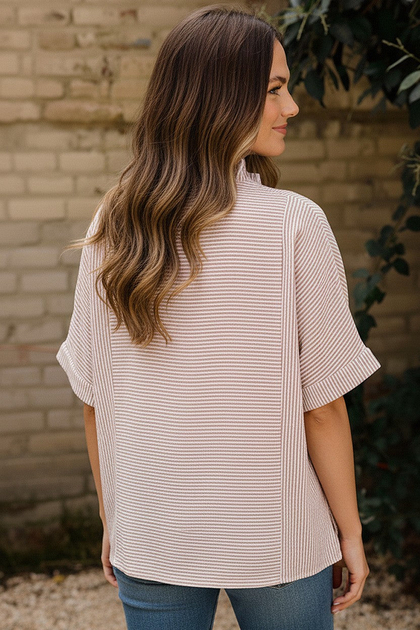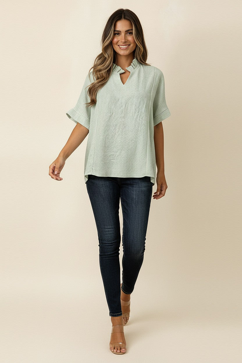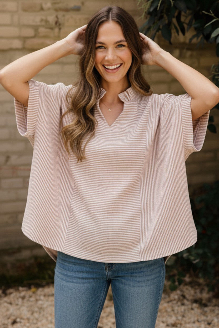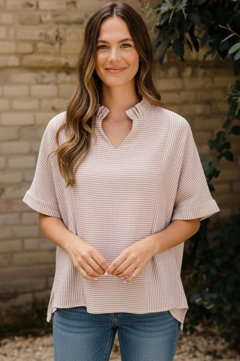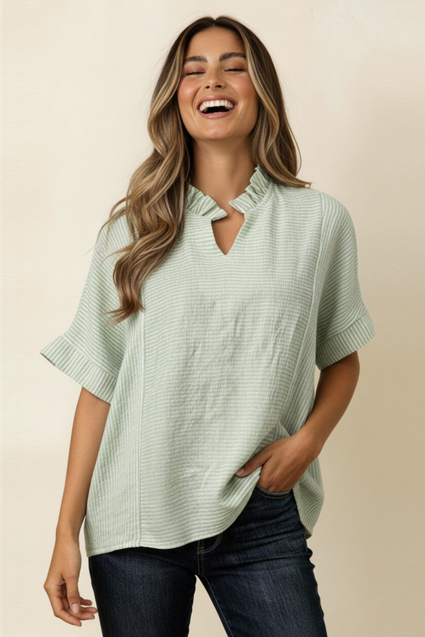FRILL NOTCH NECK DROP SHOULDER DOLMAN SHORT SLEEVE OVERSIZED PIN STRIPE WOVEN TOP