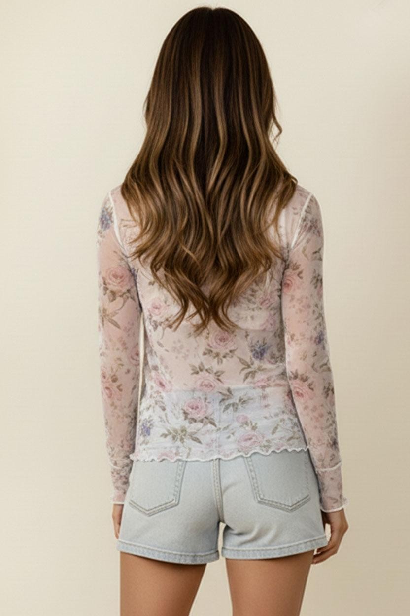 HIGH NECK LINE LONG SLEEVE FLORAL PRINT MESH SEMI SHEER TOP WITH FRILLED MERROW HEM