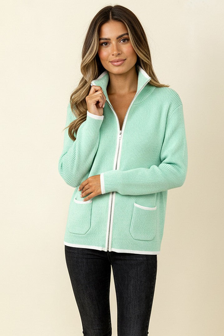 HIGH NECK ZIP UP LONG SLEEVE COLOR BLOCK SWEATER CARDIGAN WITH POCKET