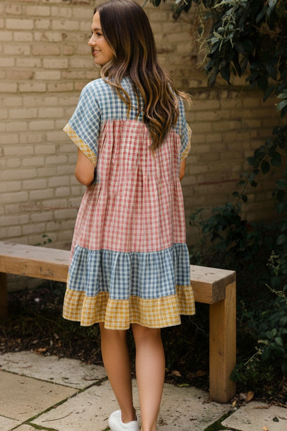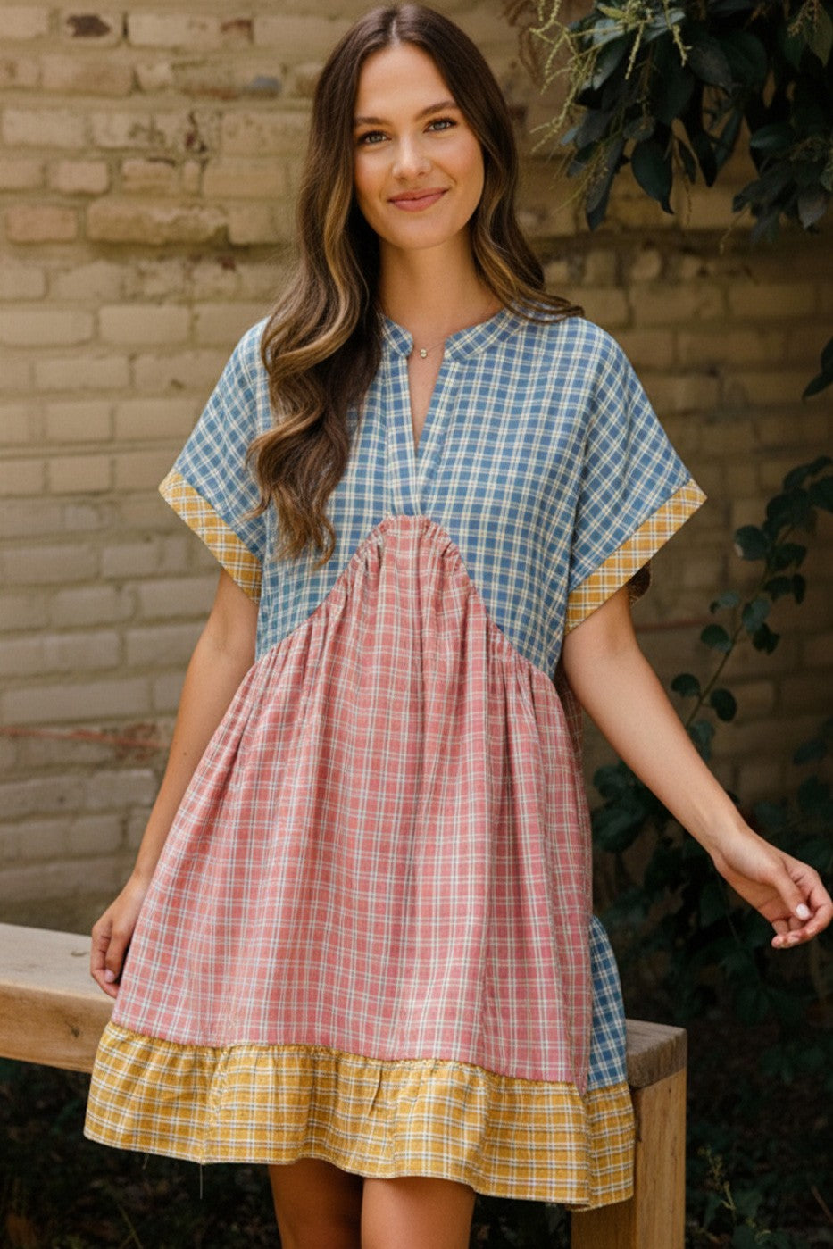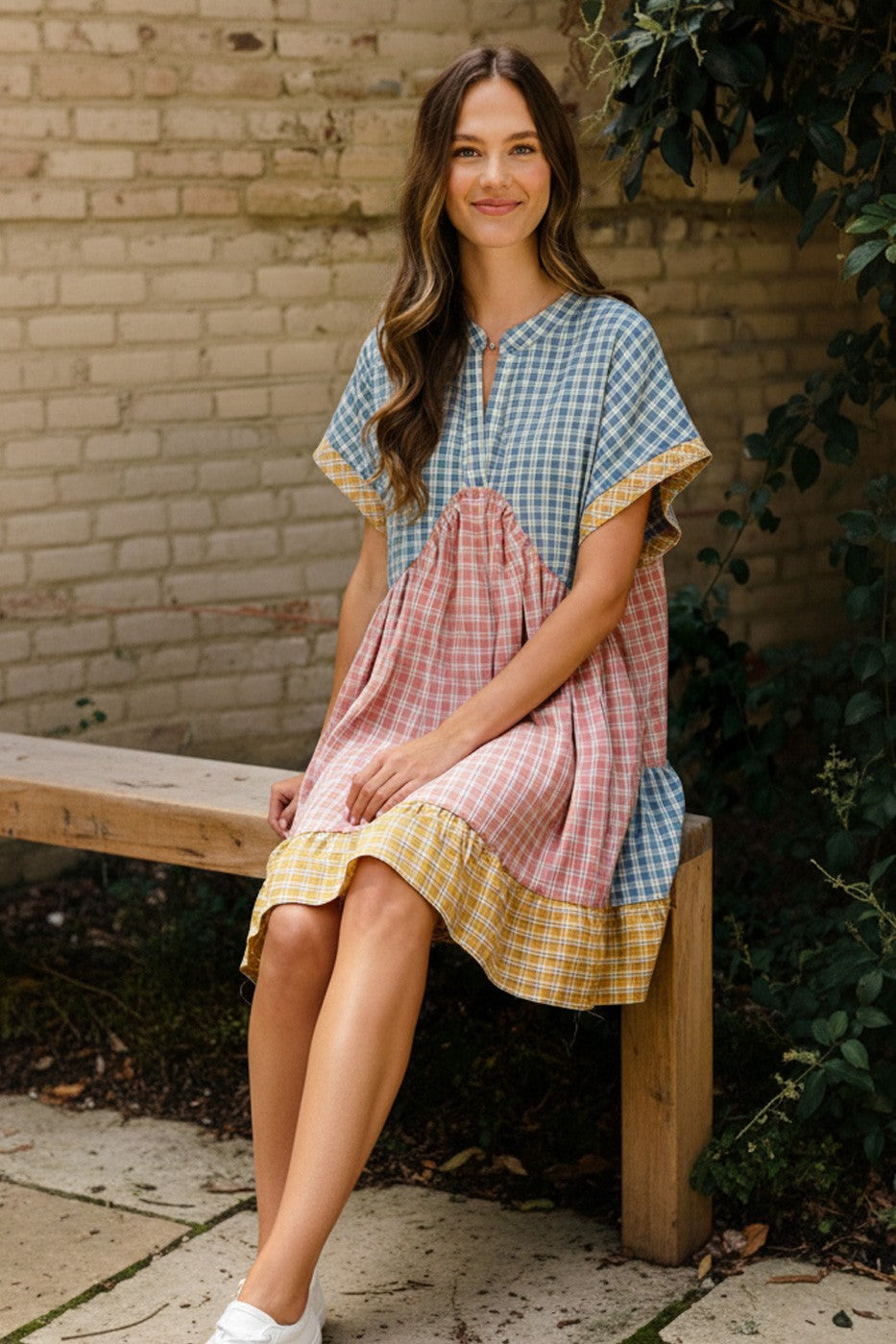 NOTCHED NECK DOLMAN SHORT SLEEVE PLAID CHECK COLOR BLOCK BABYDOLL WOVEN DRESS WITH SIDE POCKET