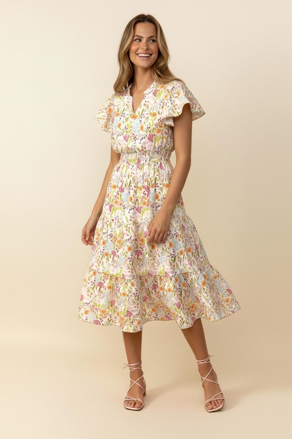 FRILL HEM NOTCH NECK PUFF SHORT SLEEVE FIT AND FLARE SMOCKED WAIST MAXI LENGTH TIERED FLORAL PRINT WOVEN DRESS WITH SIDE POCKETS