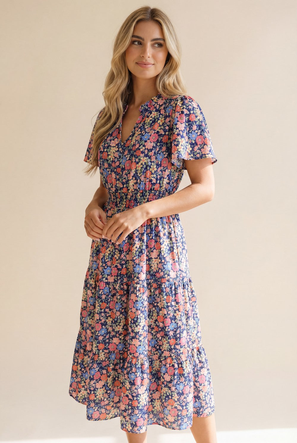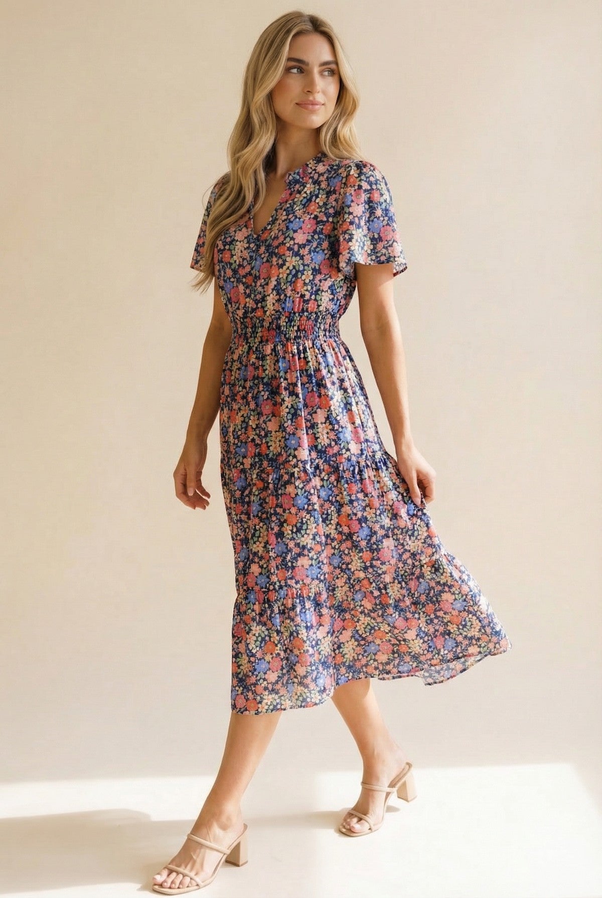 FRILL HEM NOTCH NECK PUFF SHORT SLEEVE FIT AND FLARE SMOCKED WAIST MAXI LENGTH TIERED FLORAL PRINT WOVEN DRESS WITH SIDE POCKETS