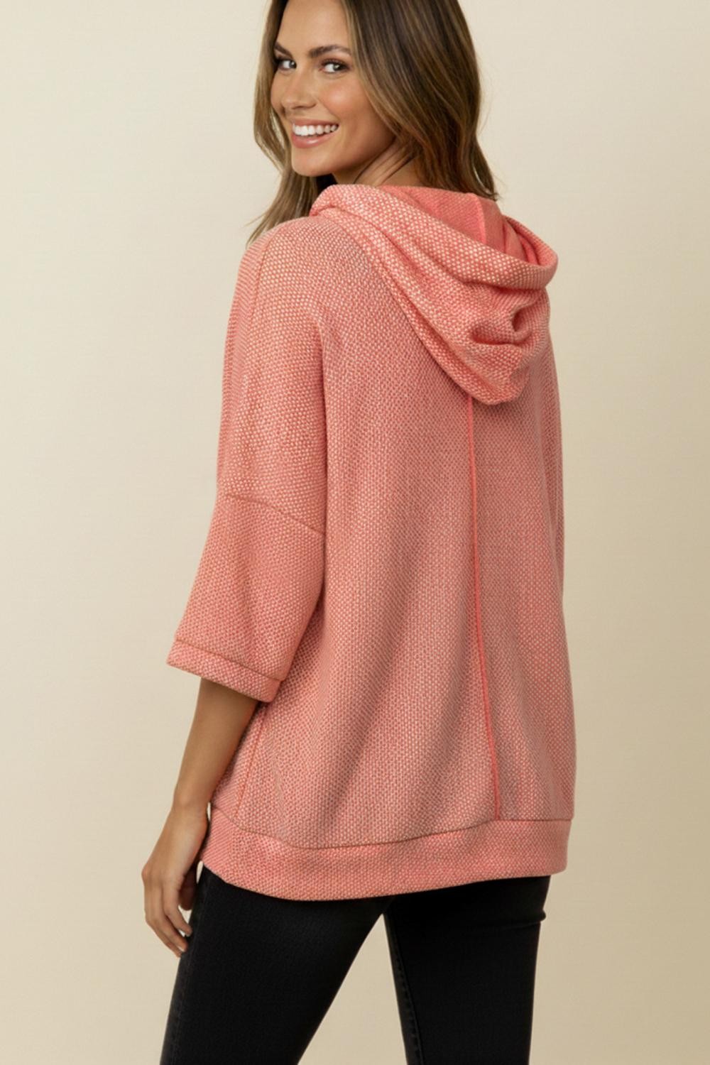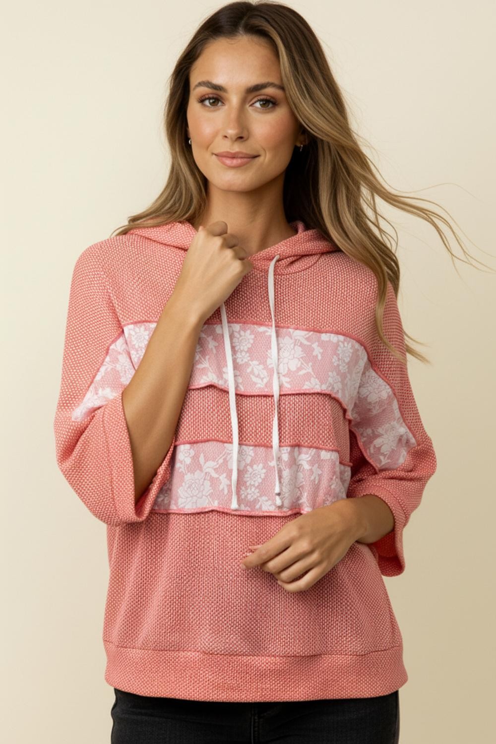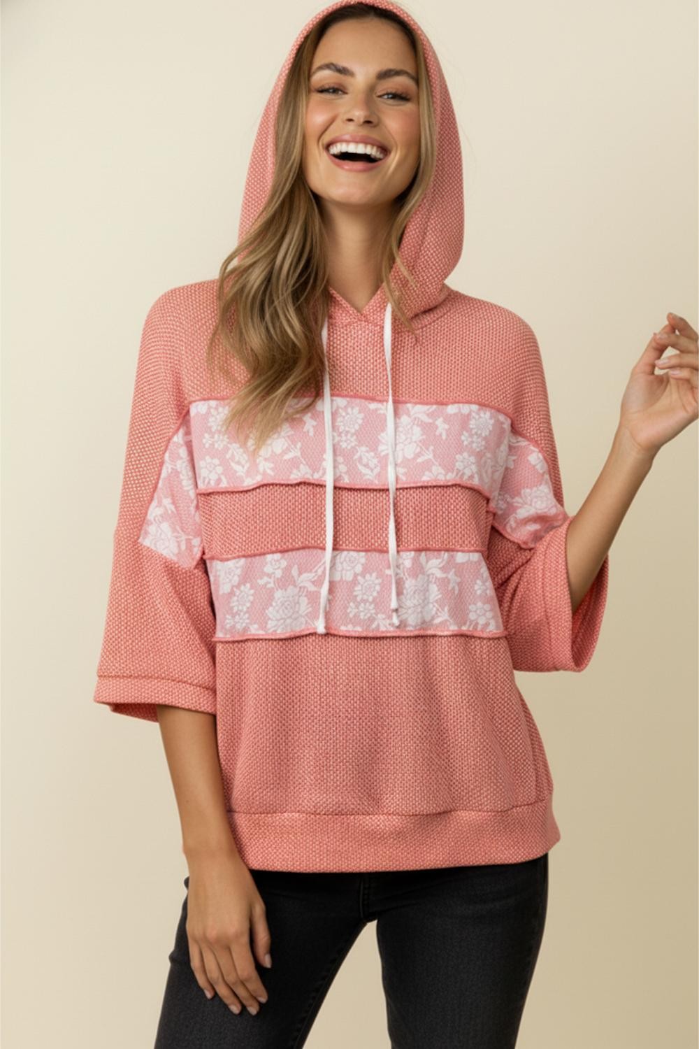 ELBOW LENGTH SLEEVE TWO TONE JACQUARD BURNOUT FLORAL WOVEN COLOR BLOCK TOP WITH HOODIE