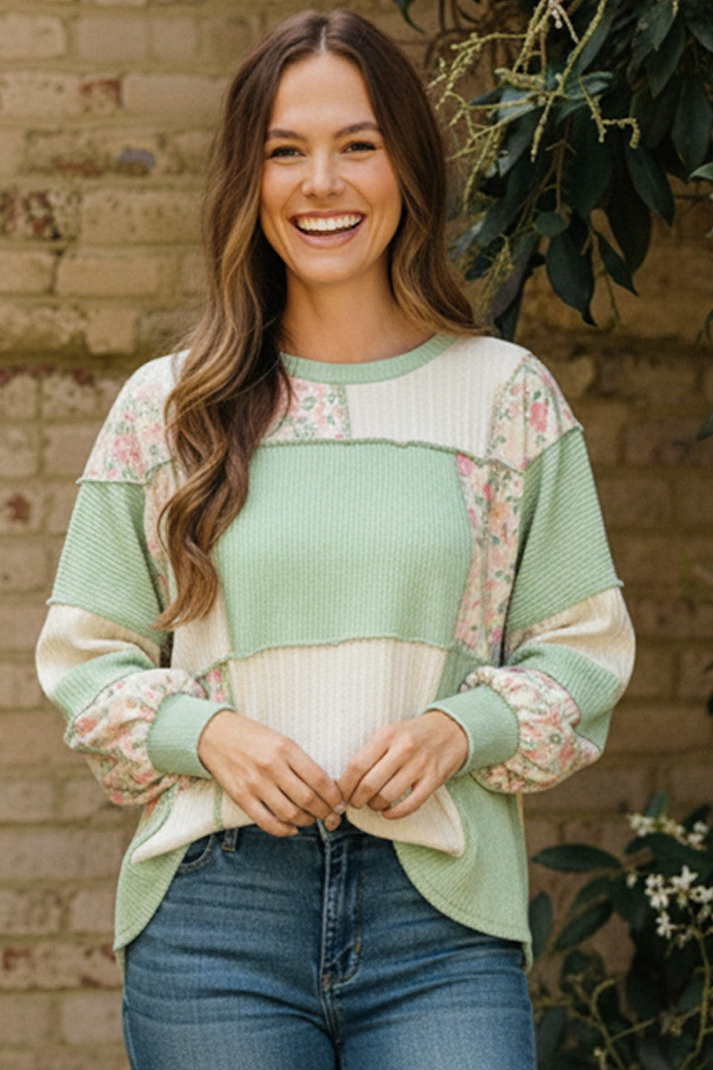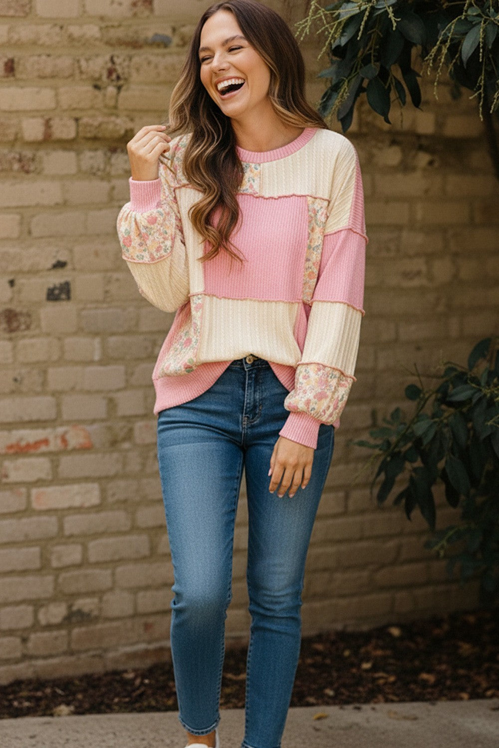 ROUND NECK BUBBLE LONG SLEEVE RIB CABLE KNIT FLORAL PRINT FRENCH TERRY COLOR BLOCK PATCHWORK PULLOVER KNIT TOP