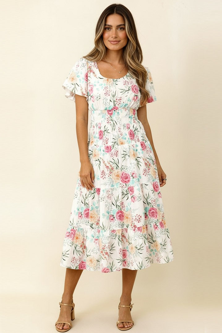 ROUND NECK BUBBLE SHORT SLEEVE SMOCKED WAIST BABYDOLL TIERED FLORAL PRINT MIDI LENGTH WOVEN DRESS