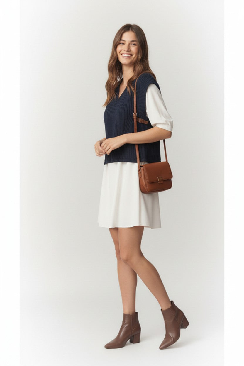 TWO-FER SET FEATURING A KNIT SWEATER VEST WITH SIDE BUCKLE DETAILS AND A FEMININE MINI DRESS.
