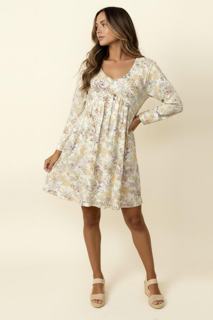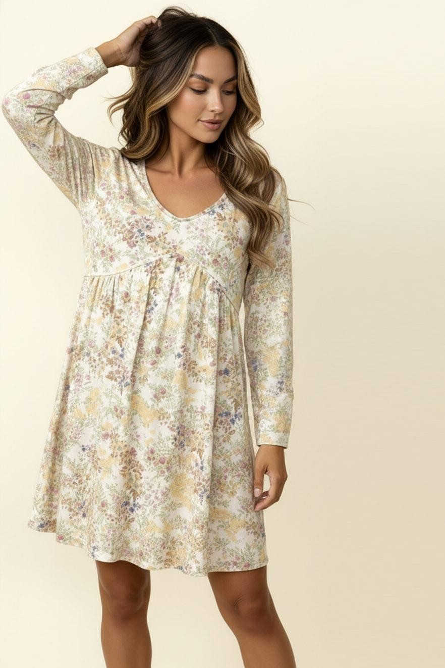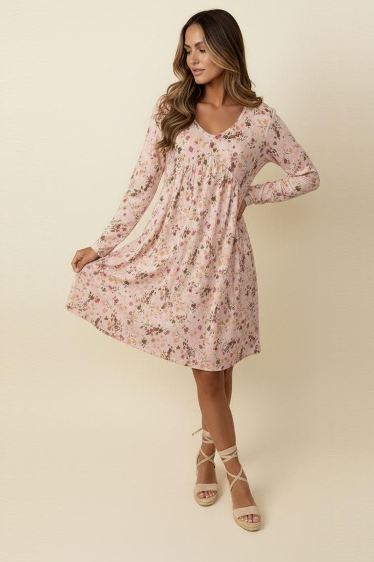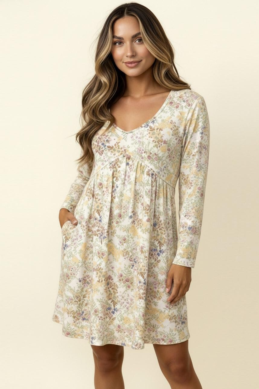 V NECK BABYDOLL EMPIRE WAIST LONG SLEEVE KNEE LENGTH FLORAL PRINT RIB KNIT DRESS WITH SIDE POCKETS