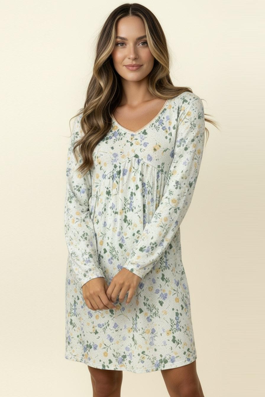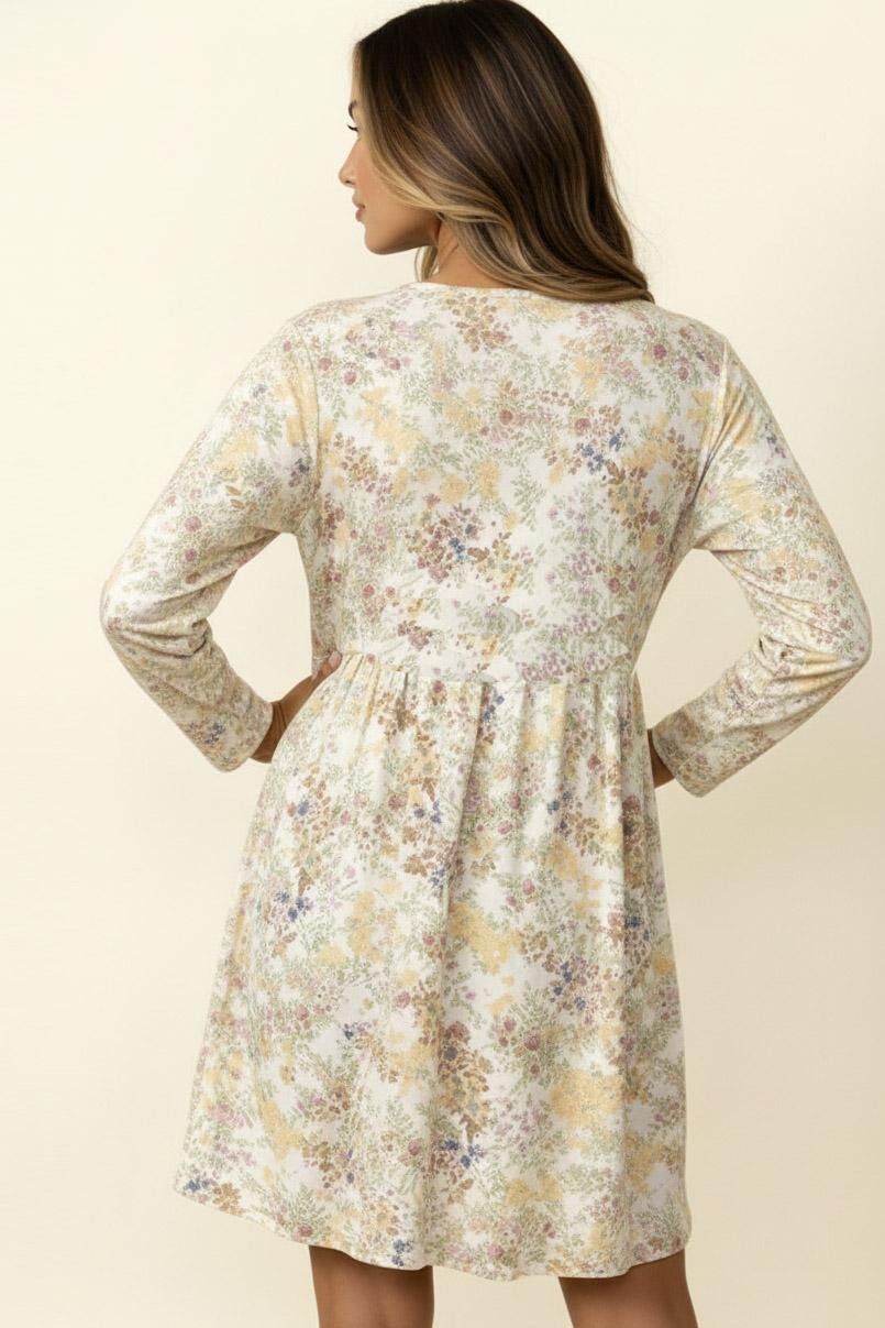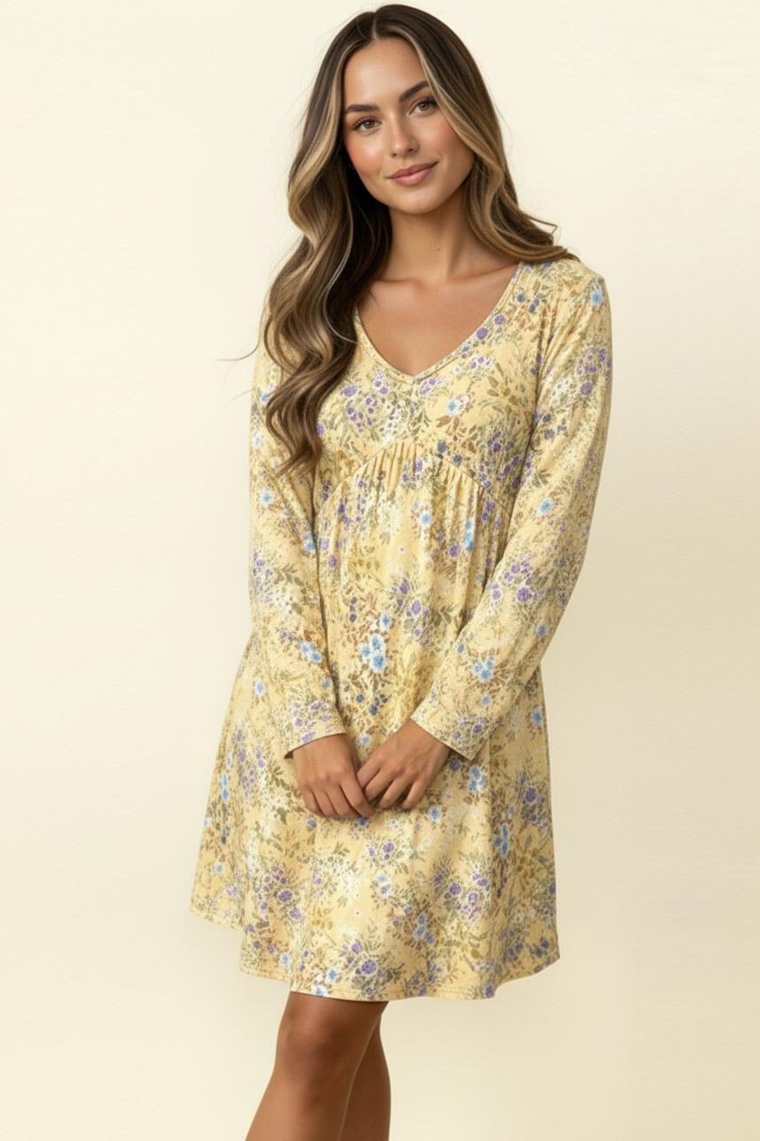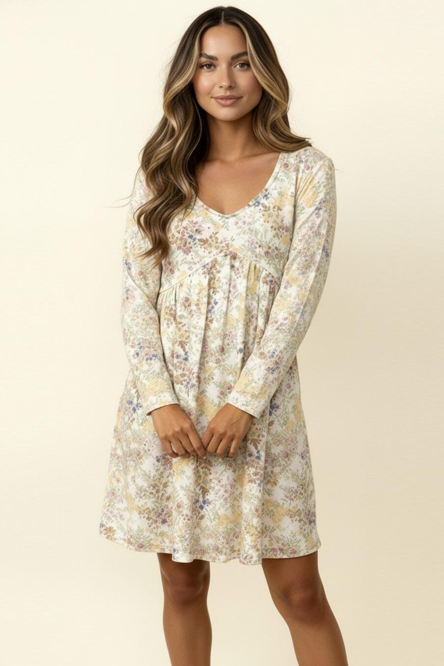 V NECK BABYDOLL EMPIRE WAIST LONG SLEEVE KNEE LENGTH FLORAL PRINT RIB KNIT DRESS WITH SIDE POCKETS