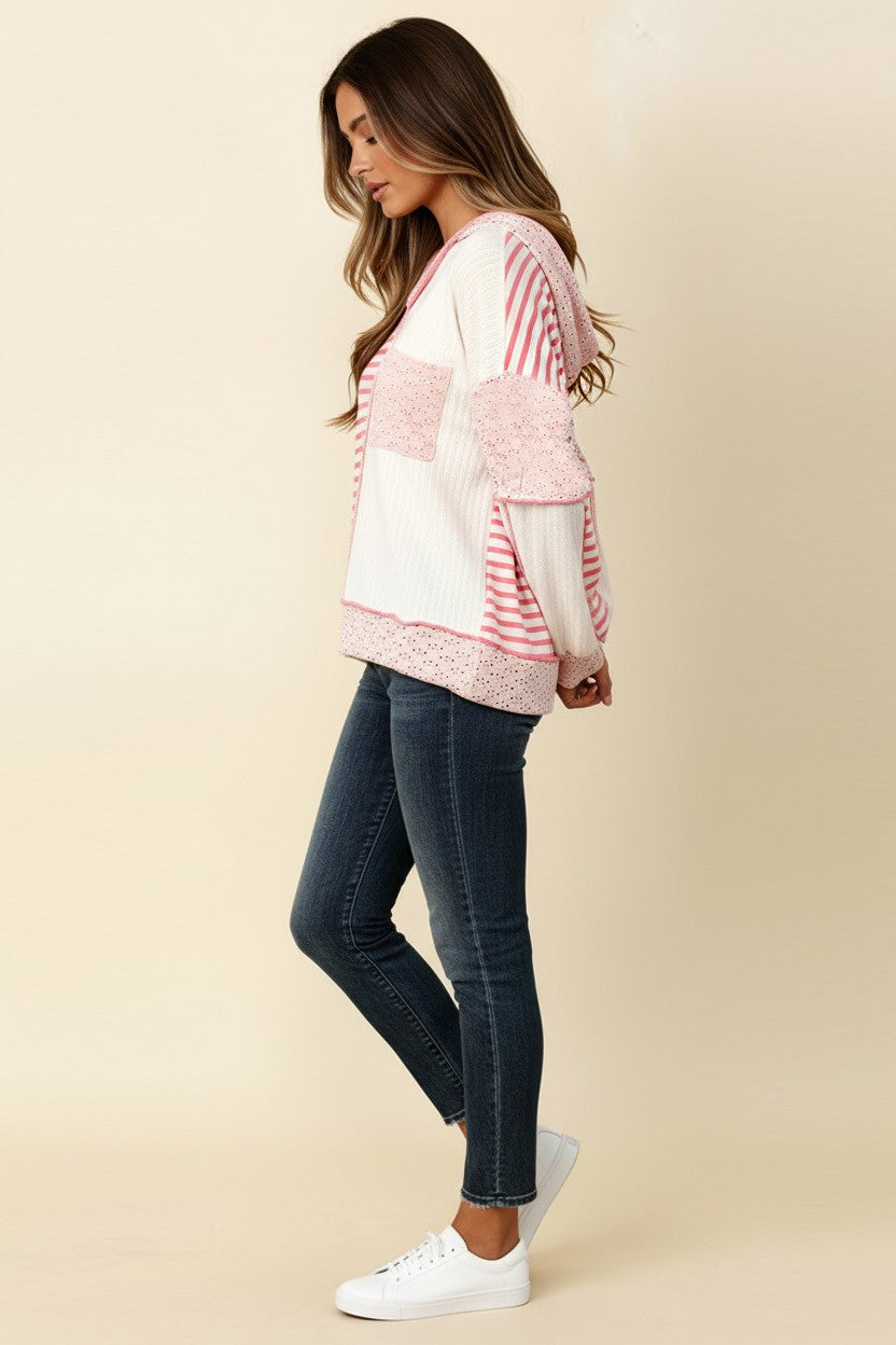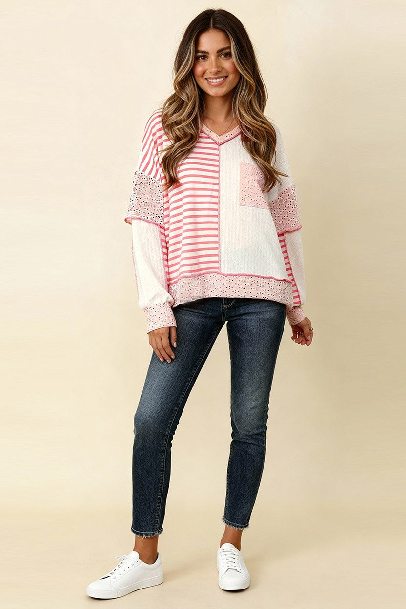 V NECK LONG SLEEVE EYELET KNIT RIB AND STRIPE COLOR BLOCK PULLOVER TOP WITH POCKET AND OUT SEAM OVERLOCK
