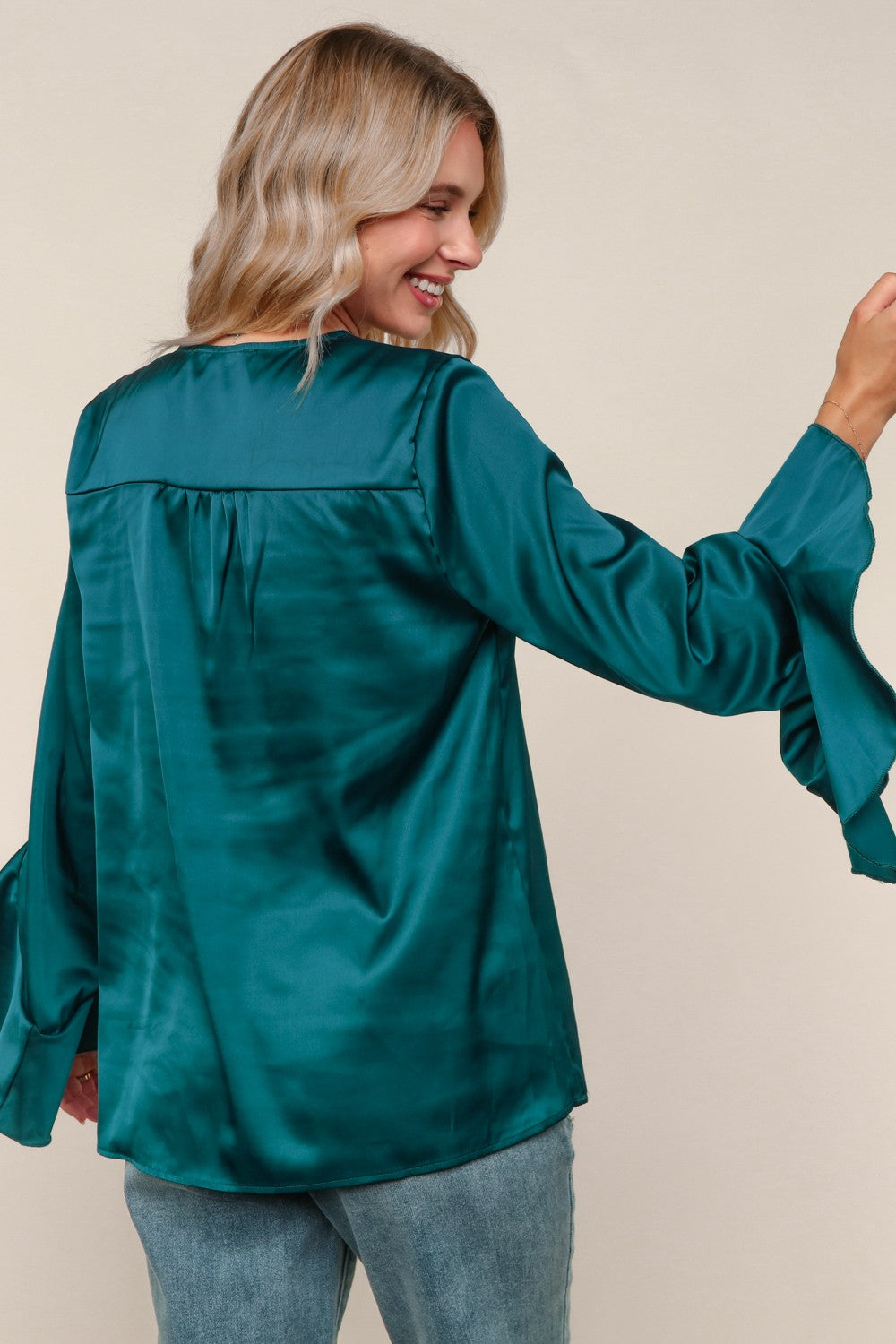 Teal Solid Satin Blouse W/Ruffle Hem Holiday Sleeve
