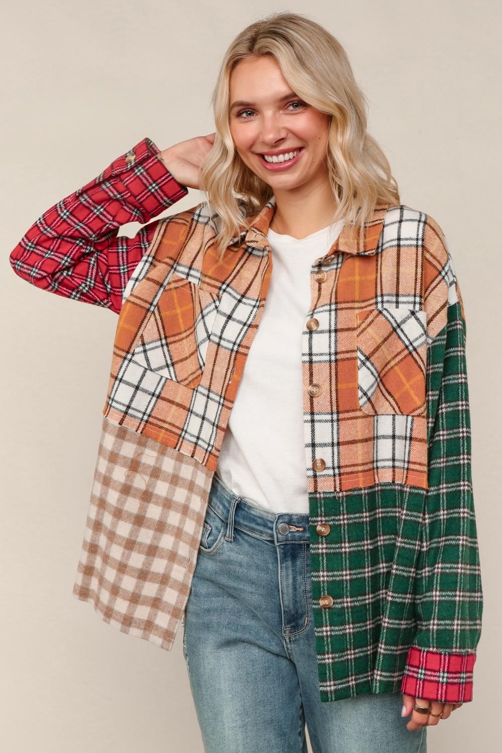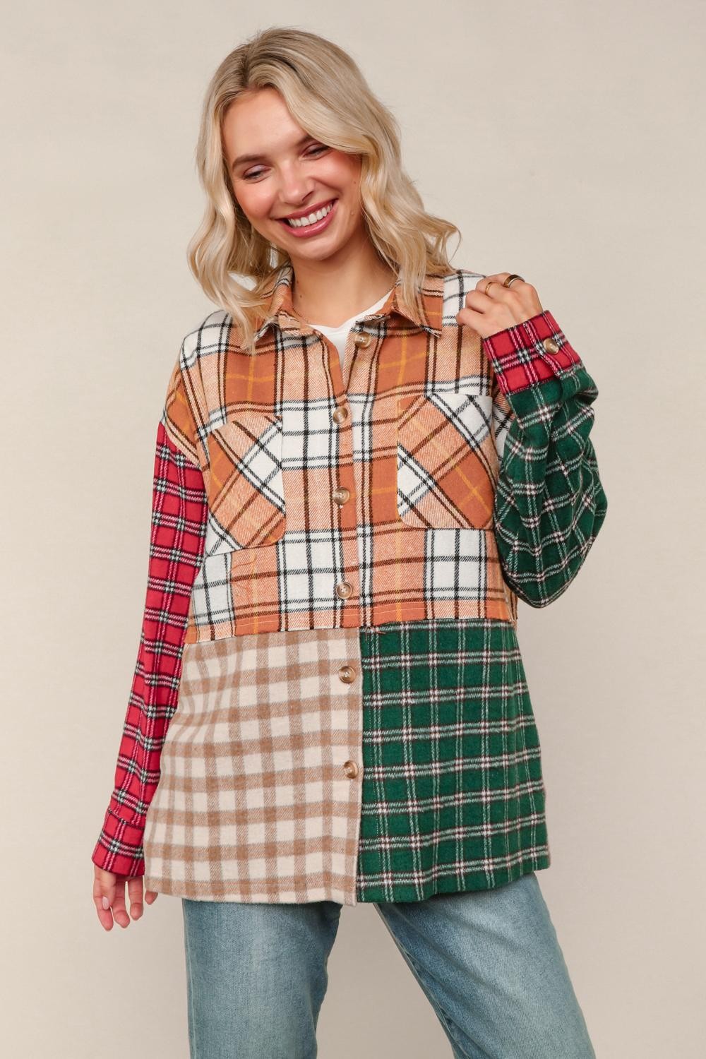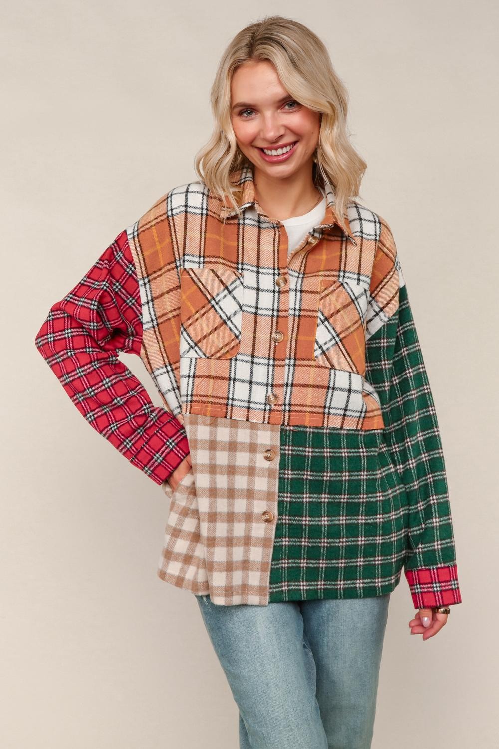 FLANNEL PLAID CHECK COLOR BLOCK BUTTON DOWN LONG SLEEVE LOOSE FIT OVERSIZED SHIRTS JACKET SHACKET WITH POCKET