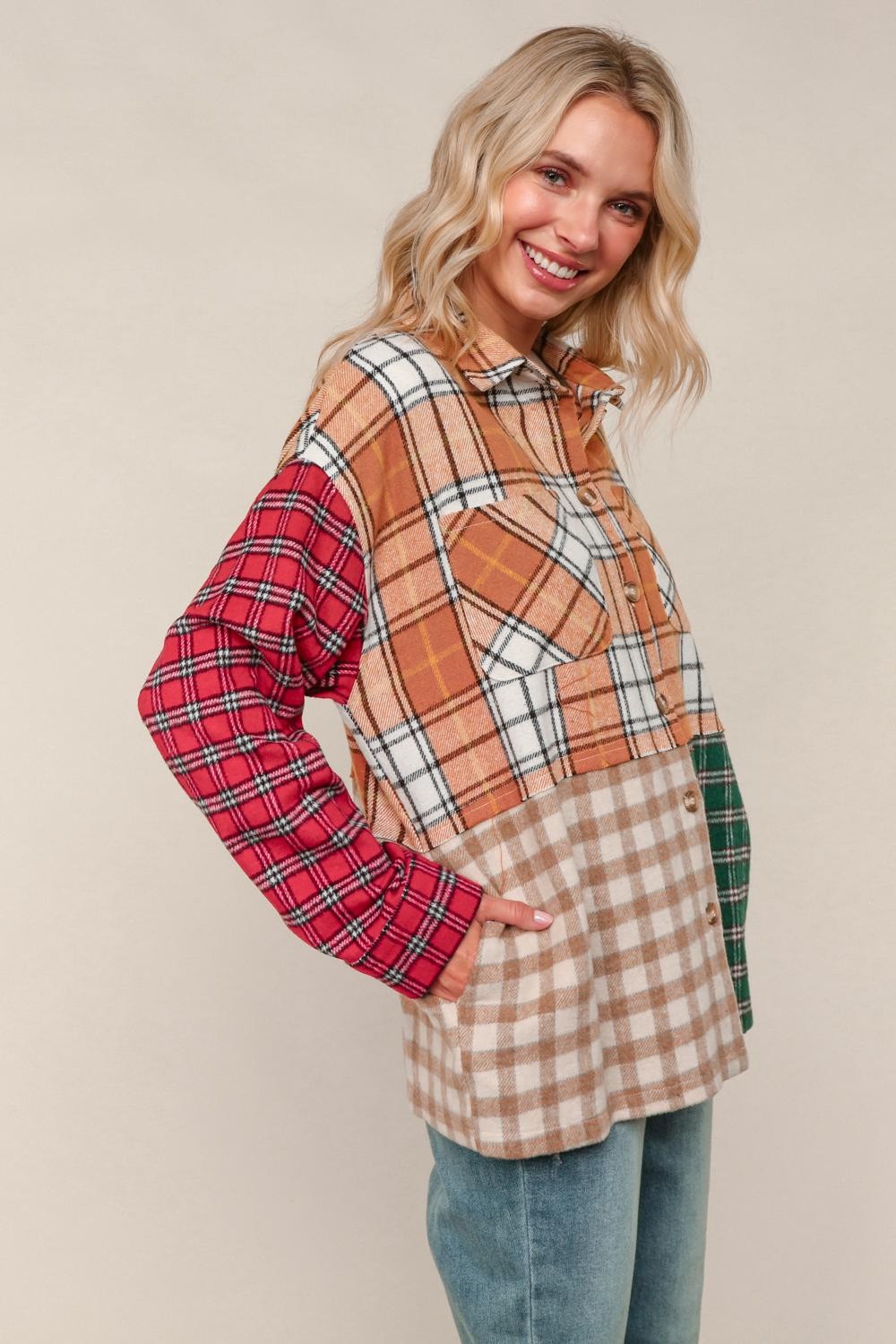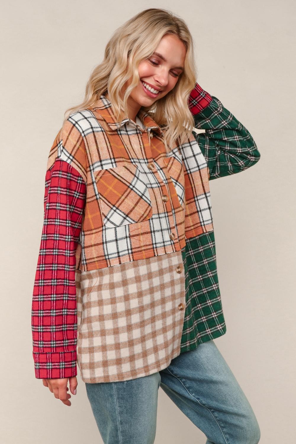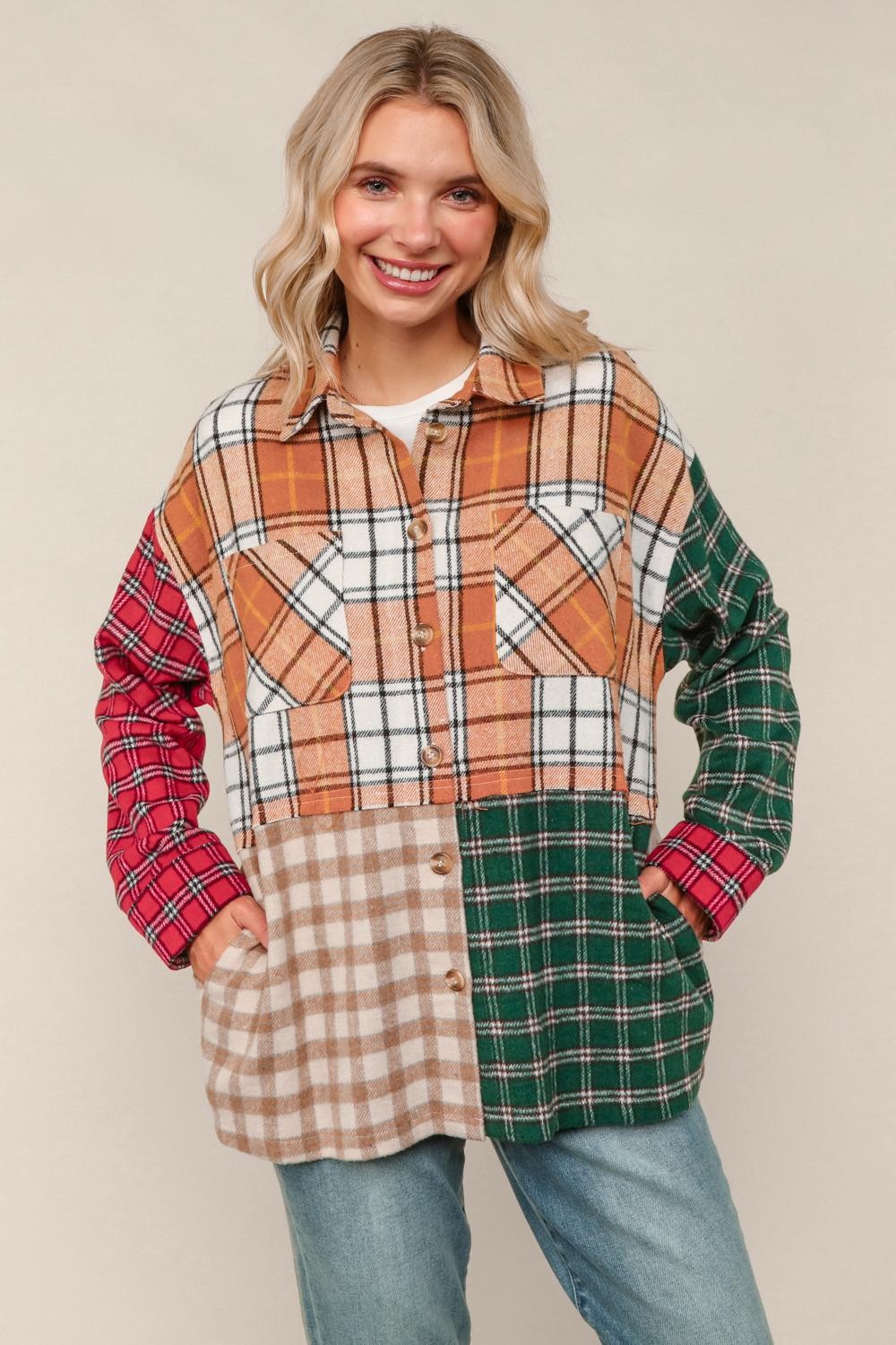 FLANNEL PLAID CHECK COLOR BLOCK BUTTON DOWN LONG SLEEVE LOOSE FIT OVERSIZED SHIRTS JACKET SHACKET WITH POCKET