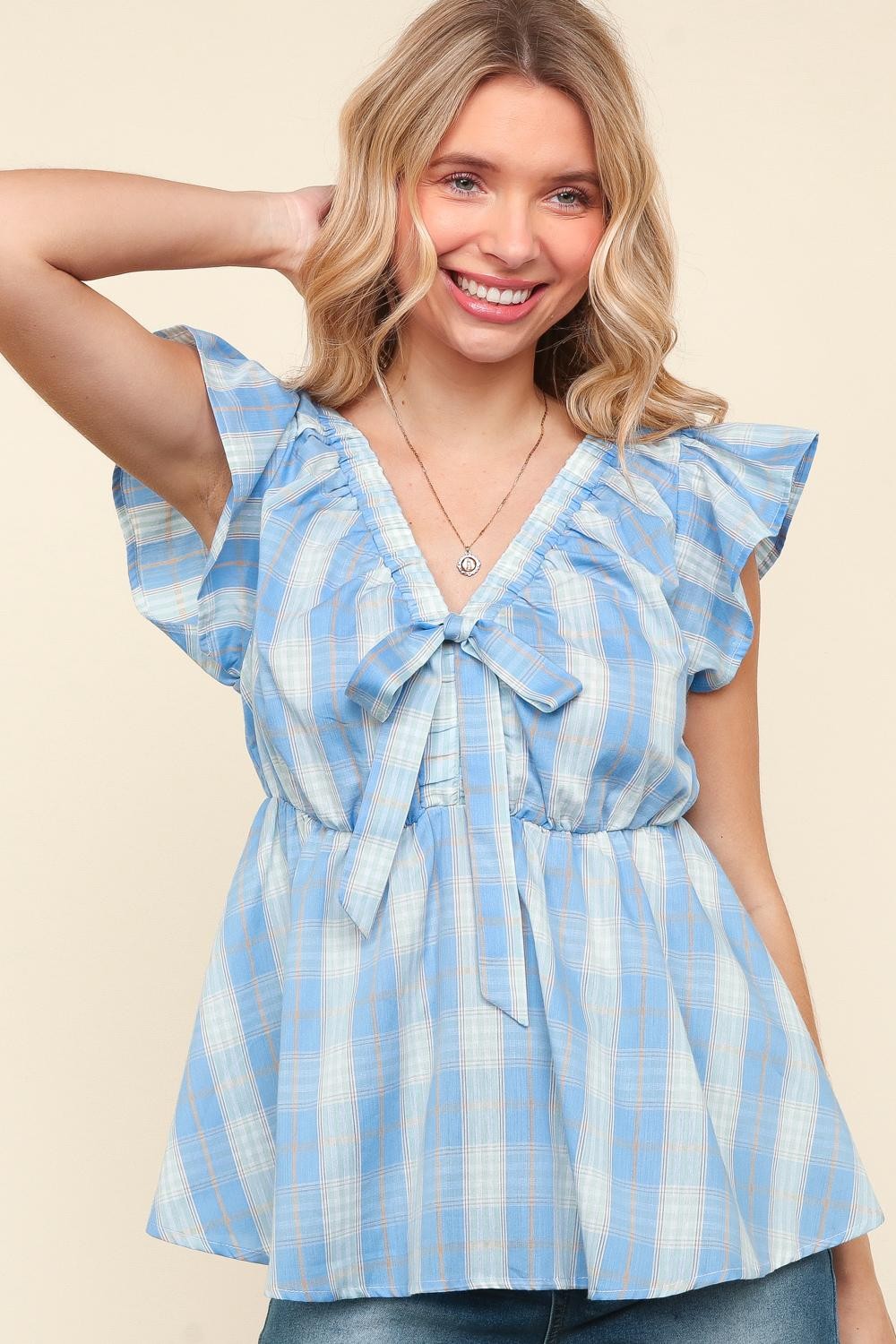 Blue Ribbon Bow Tie Flutter Short Sleeve Woven Top