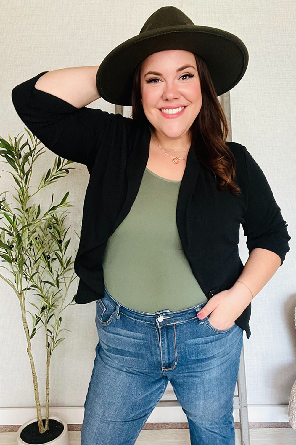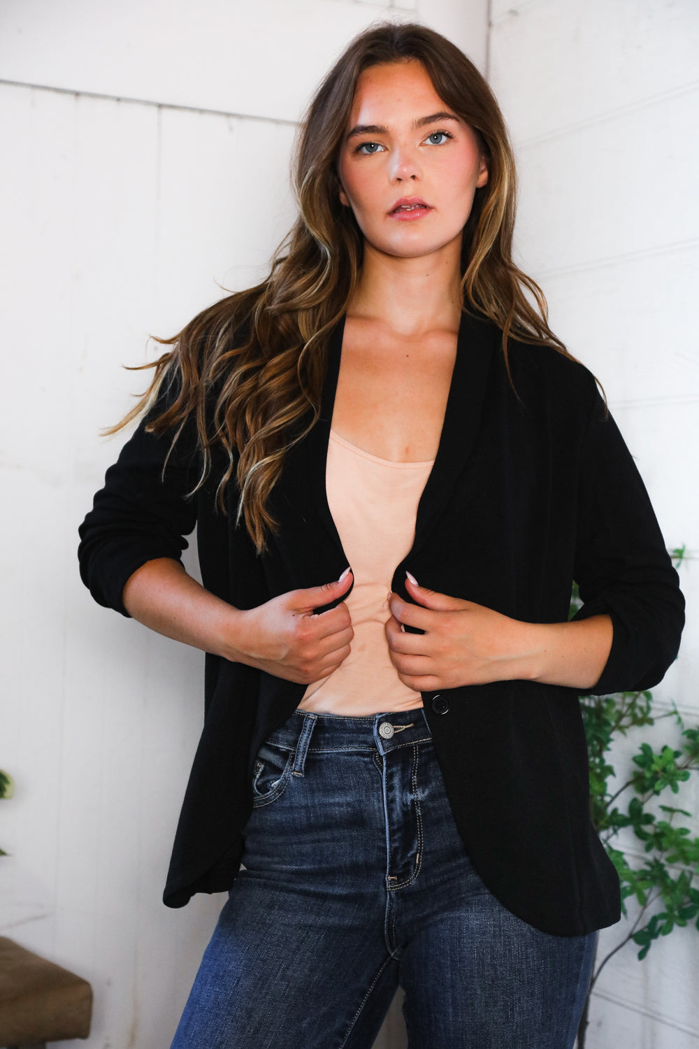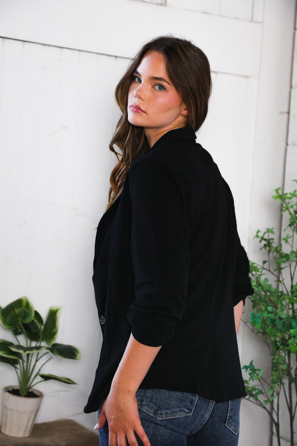 PLUS BLACK THREE QUARTER SLEEVE BUTTON CLOSURE SOLID BLAZER