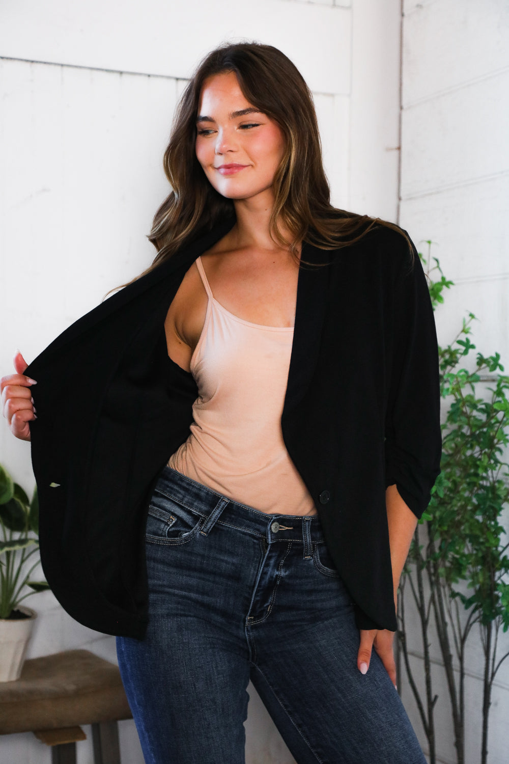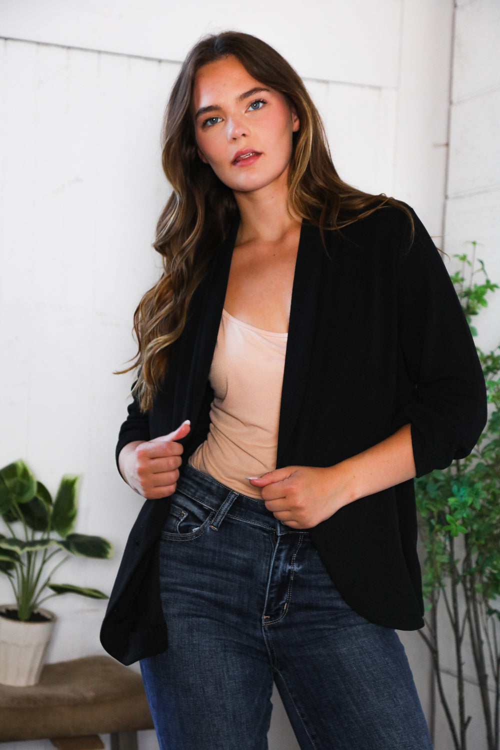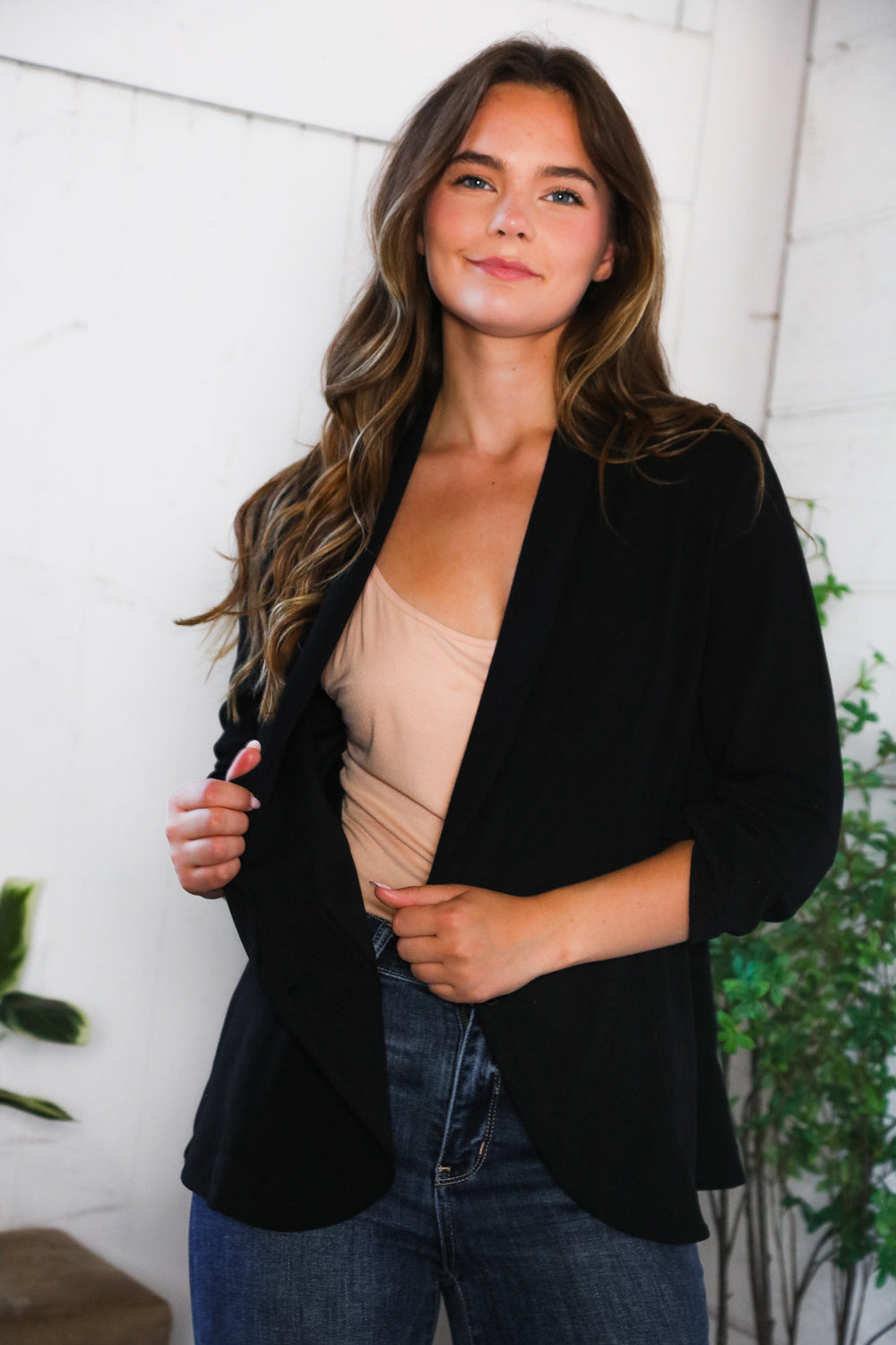 PLUS BLACK THREE QUARTER SLEEVE BUTTON CLOSURE SOLID BLAZER