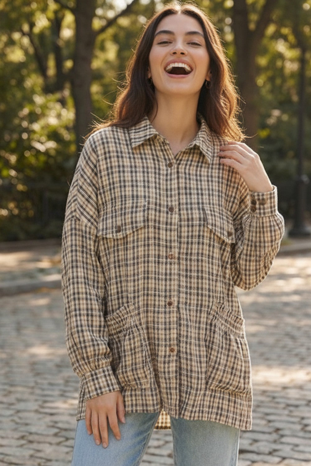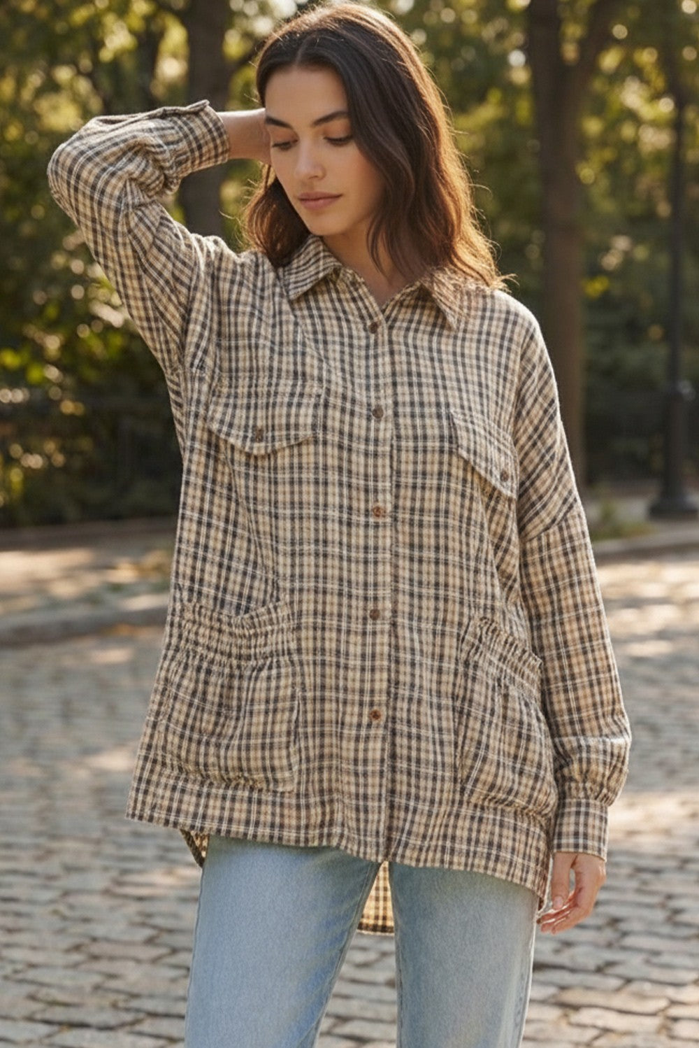 PLUS BUTTON DOWN PLAID SMOCKED POCKET SHIRT