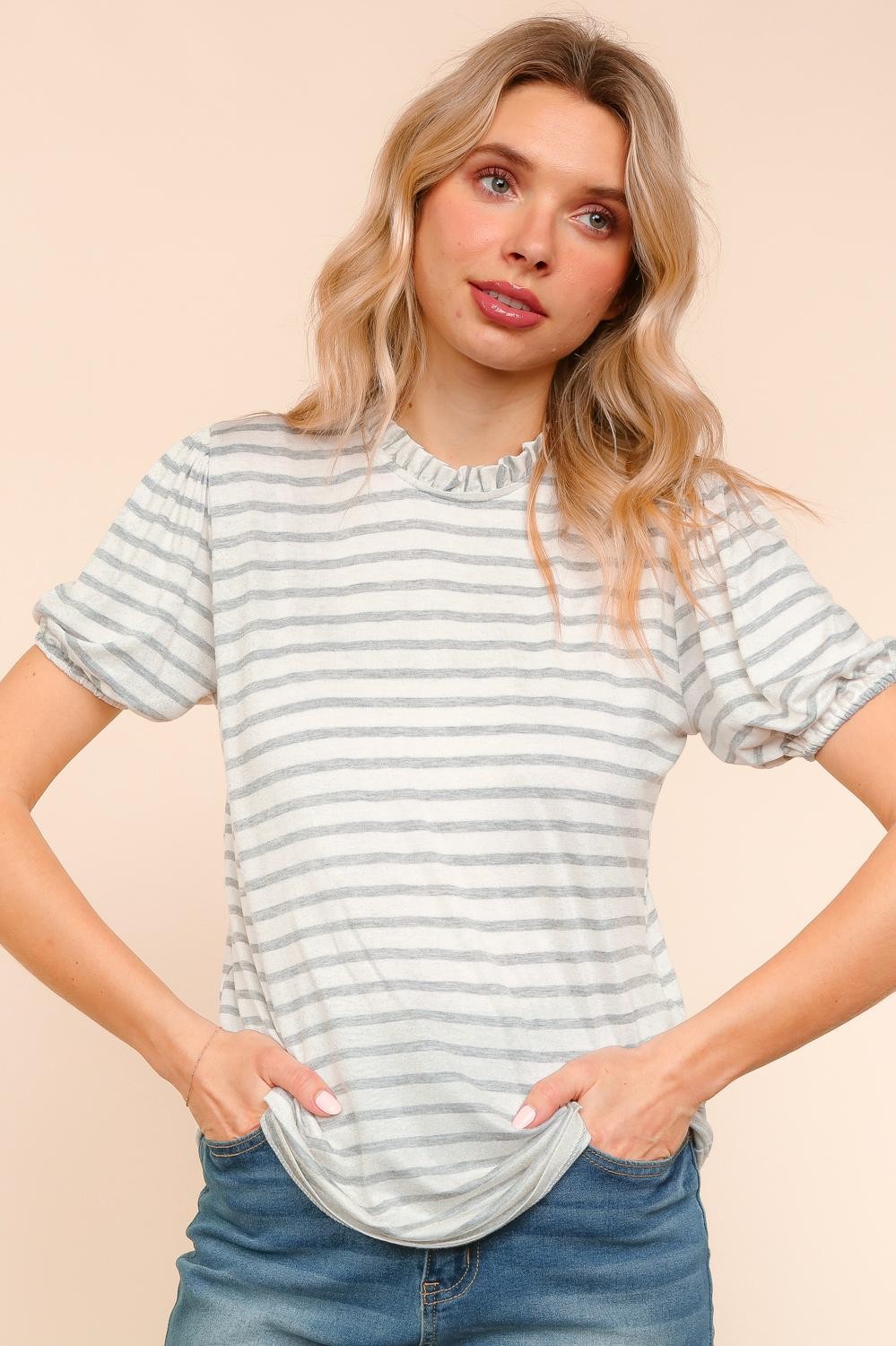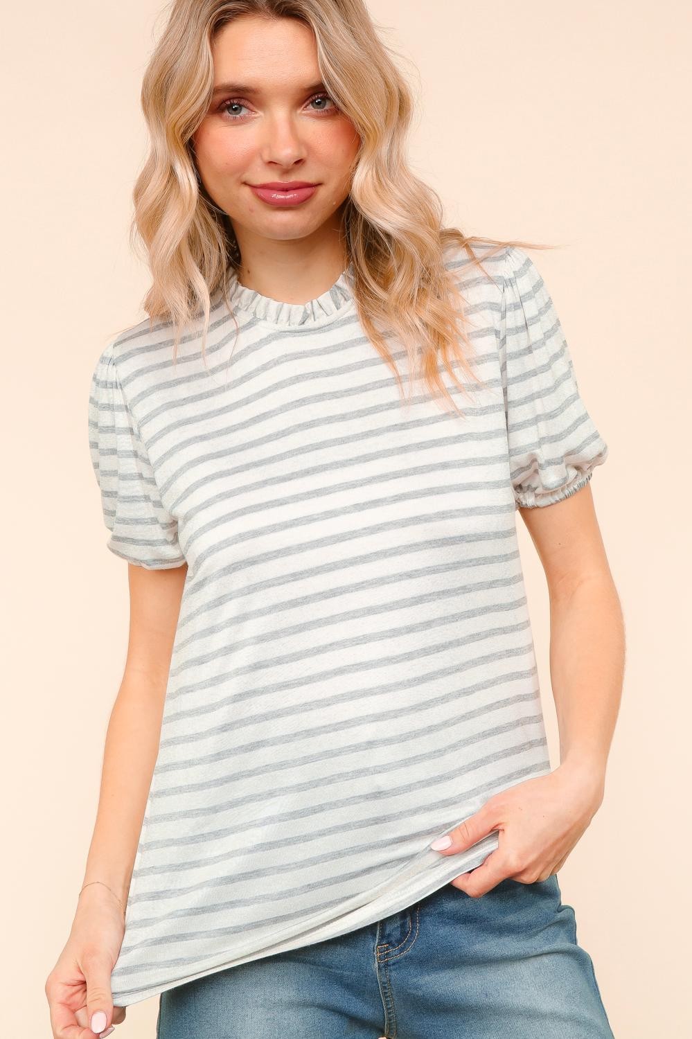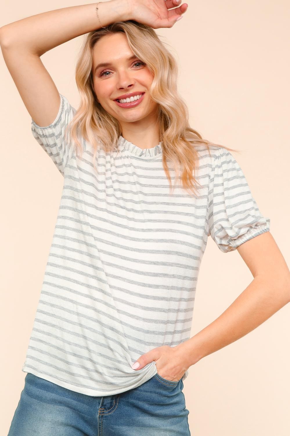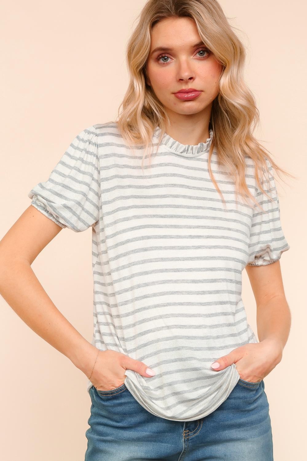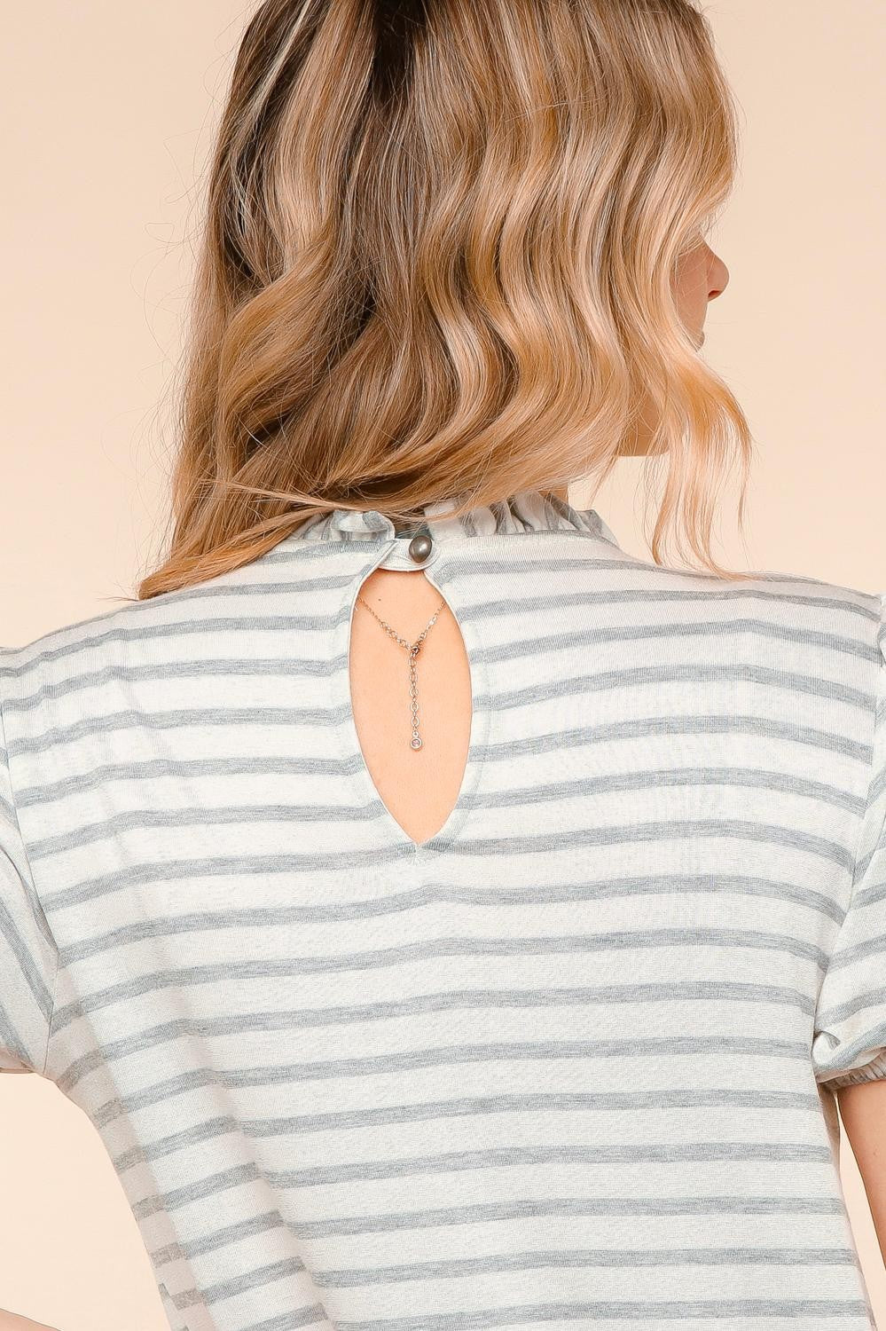 Plus Ivory/Heather Grey Mock Neck Stripe Knit Top with Button Keyhole