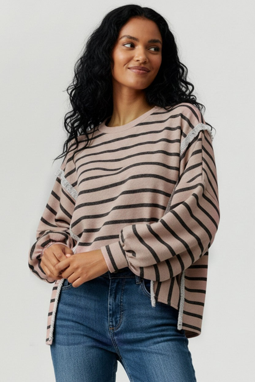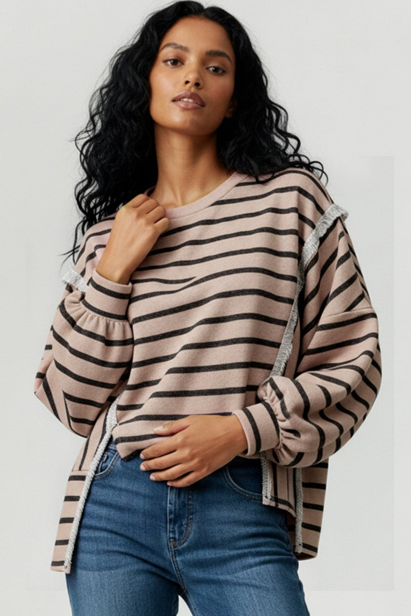 PLUS SIZE STRIPE LONG SLEEVE SLITS PULLOVER TOP