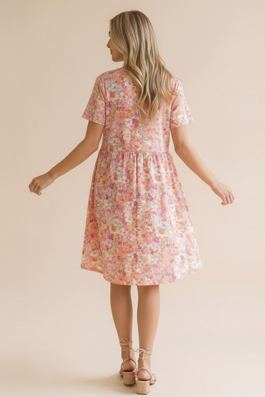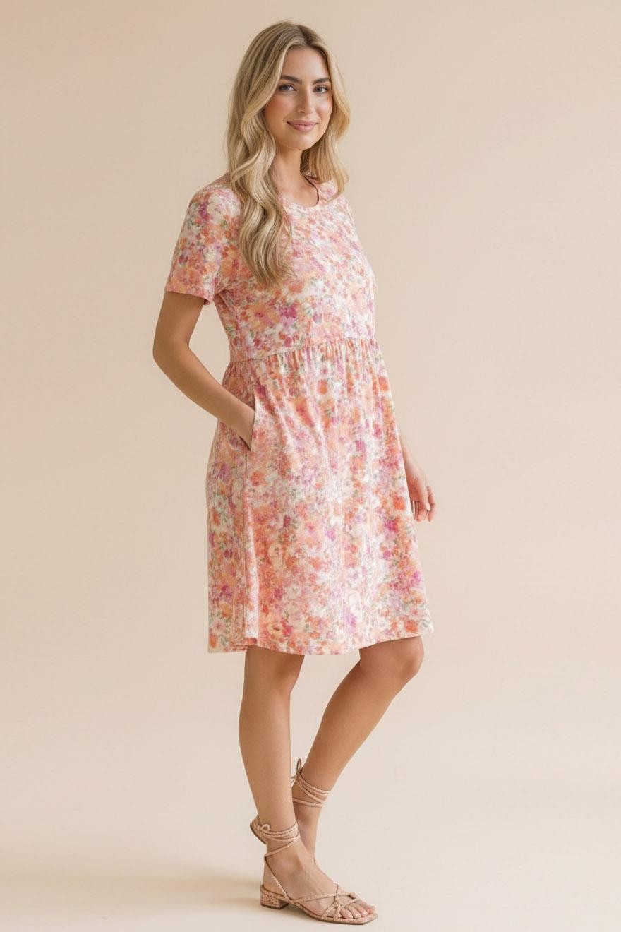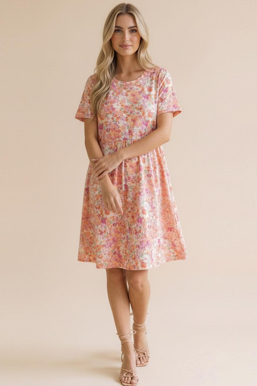 ROUND NECK SHORT SLEEVE BABYDOLL FIT AND FLARE FLORAL PRINT KNEE LENGTH KNIT DRESS WITH SIDE POCKETS