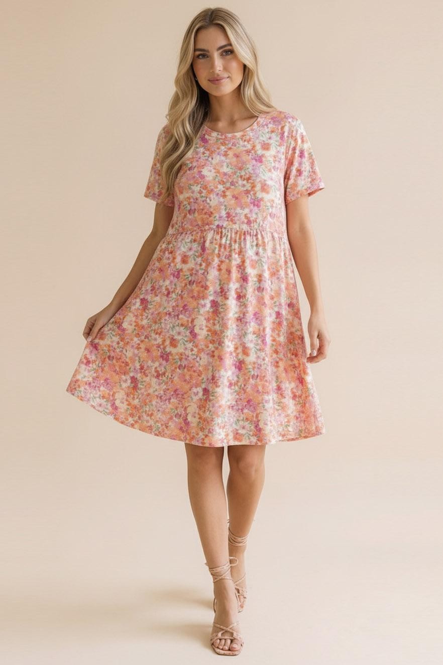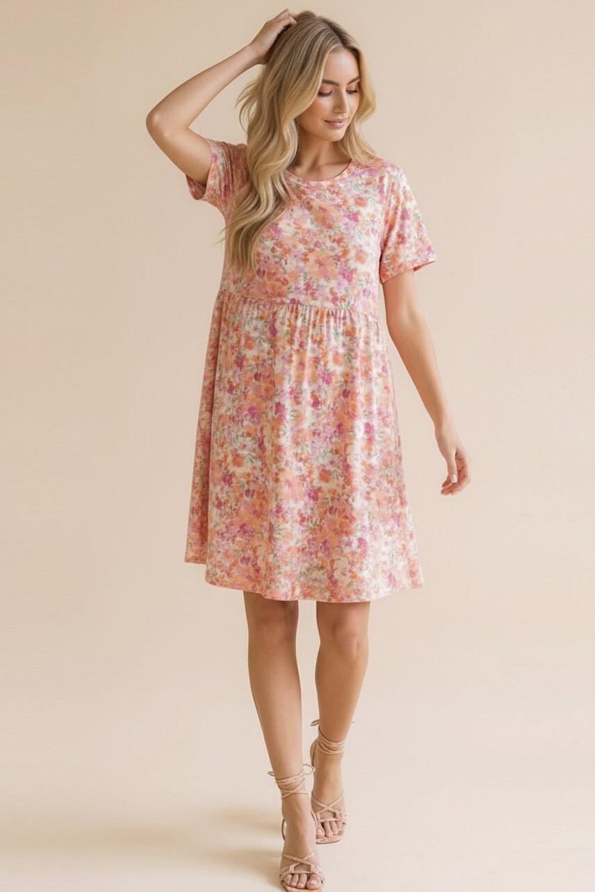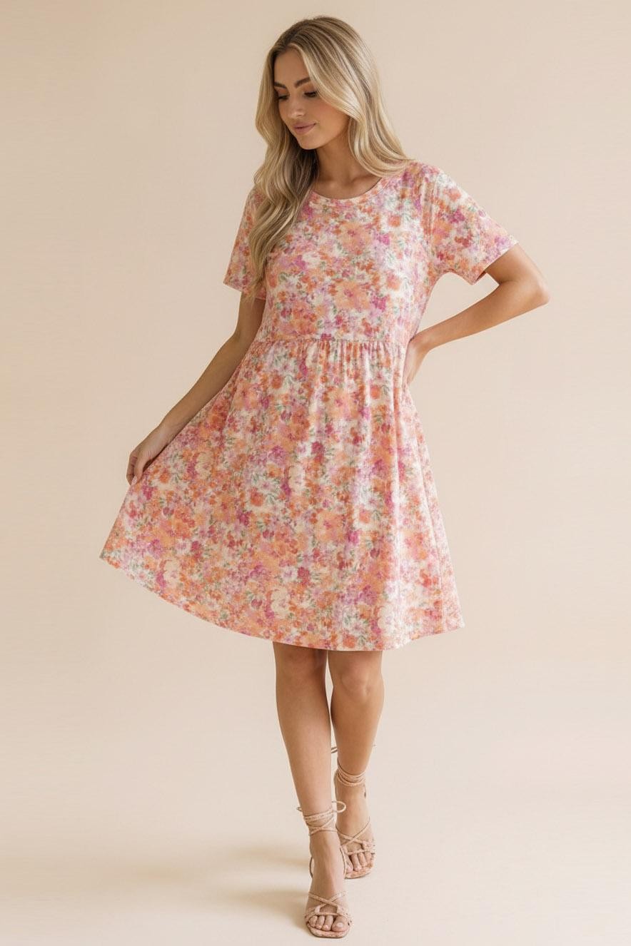 ROUND NECK SHORT SLEEVE BABYDOLL FIT AND FLARE FLORAL PRINT KNEE LENGTH KNIT DRESS WITH SIDE POCKETS