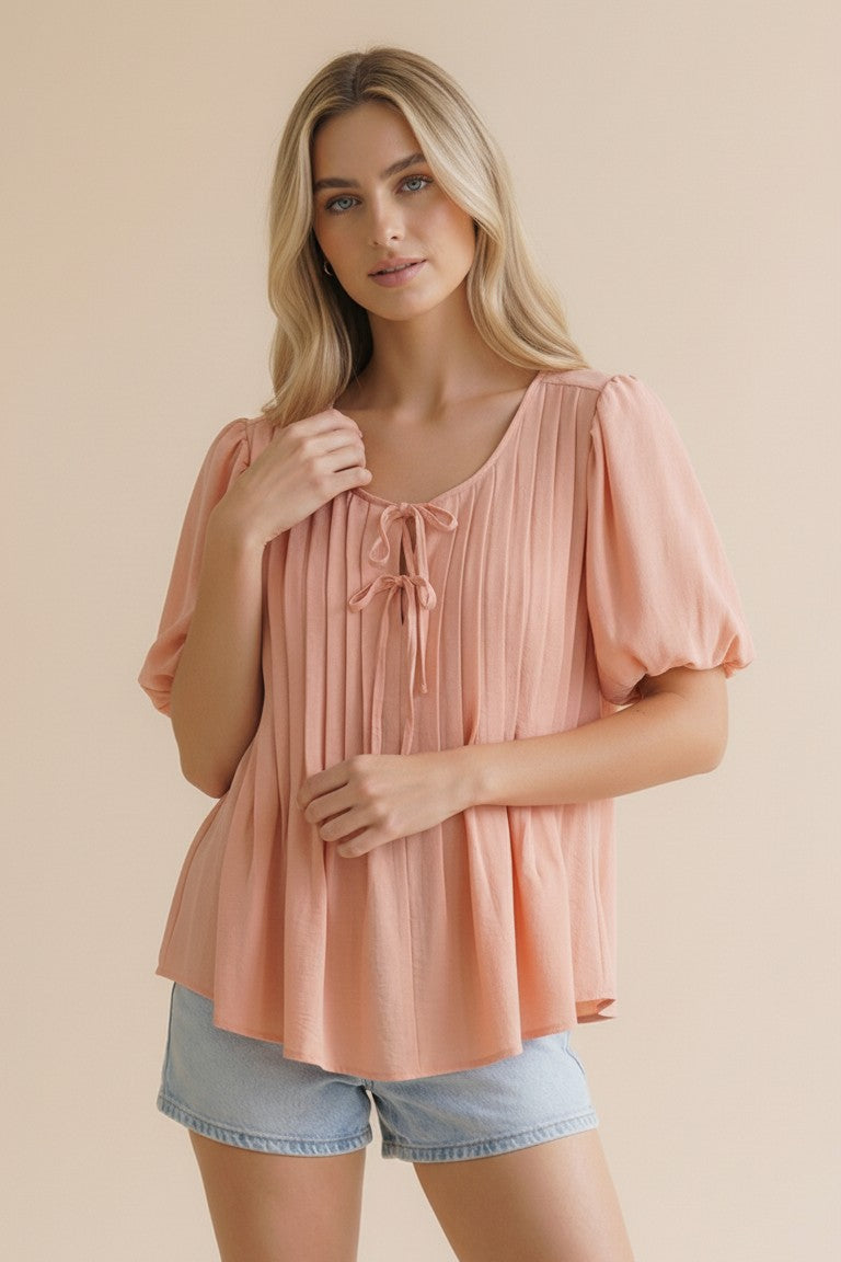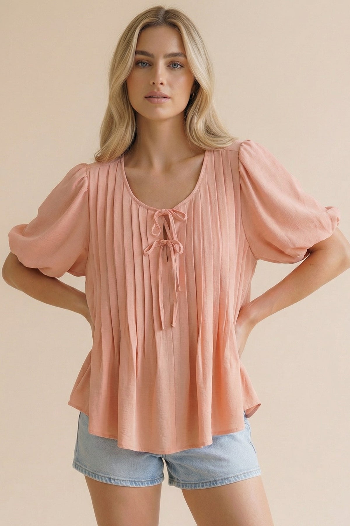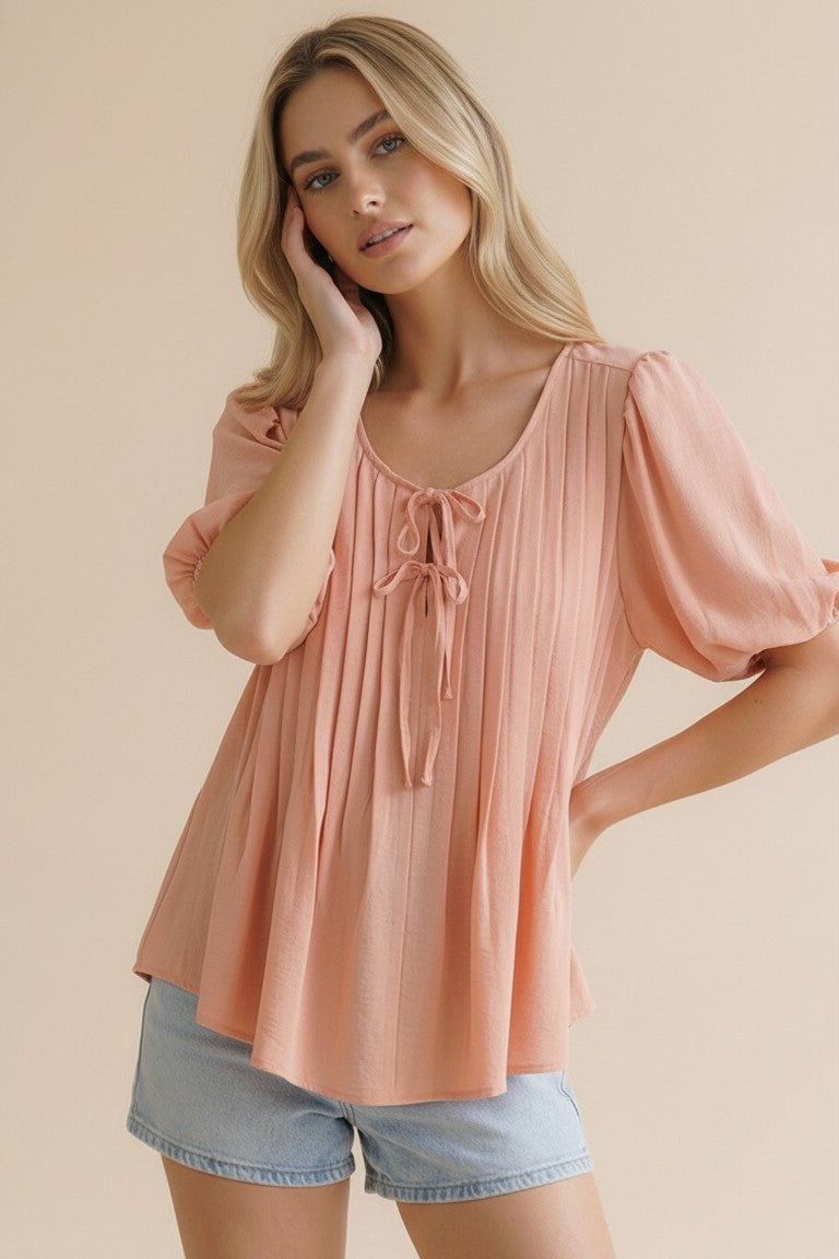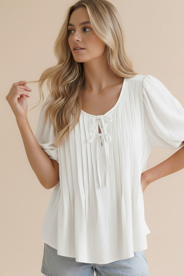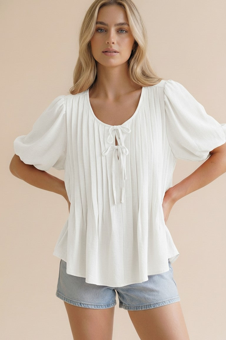 SCOOP NECK WITH RIBBON BOW DETAIL PLEATED BUBBLE SHORT SLEEVE SOLID WOVEN BLOUSE TOP